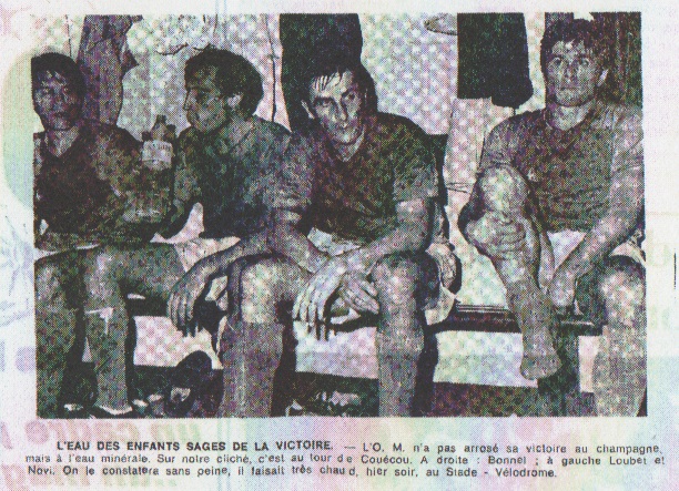Au repos nous restions donc sur un penalty obtenu et transformé par Magnusson, un minimum ! L'O.M. inefficace Pourtant au moment ou M. Vuillemin s'apprêtait à renvoyer les deux équipes aux vestiaires, un déboulé de Skoblar suivi d'un centre impeccable permettait à Couecou de prendre de la tête le meilleur sur le gardien ajaccien, mais la balle passait juste à côté du montant. La seconde période débutait comment la première s'était achevée, Skoblar tirant de peu à côté. Puis, sur un joli centre de Magnusson, Vanucci avait tout juste le temps de mettre en corner, sous la menace de Skoblar qui, depuis la reprise, opérait nettement en pointe. Un peu plus tard, sur un nouveau centre de Magnusson on avait l'impression que le Yougoslave était cloué au sol par un défenseur insulaire. On était à la 60e minute lorsque Loubet bien placé en profondeur dans l'axe du terrain, prit tout le monde de vitesse, mais ne put redresser ni sa course ni son tir. Occasions de Georgin A la 65e minute, les visiteurs, par leur demi Georgin, ratèrent une belle occasion d'égaliser. Il manqua en effet une première passe de Dumas, récupérant pourtant la balle, mais trébucha alors qu'il était à quelques mètres du but. A la 70e minute, bien servi par Couecou, Charly Loubet débordait une fois encore la défense ajaccienne ; mais il fut crocheté est descendu par Vanucci au moment d'entrer dans la surface ; le coup franc ne donna rien. On abordait le dernier quart d'heure. Magnusson débordait tirait, contraignant Baratelli à mettre en corner. Ce même Baratelli pris à contre pied par Skoblar, réussissait, dans un ultime reflète, à dévier la balle, ce qui parvenait à faire un peu plus tard un défenseur ajaccien sur un tir de Novi monté à l'attaque. On assistait ensuite à deux cafouillages épiques ; un devant chaque but, mais force restait aux défenseurs. À dix minutes de la fin, Rigaud remplaçait Dortomb et finalement l'O.M. se contentait d'une courte victoire. |