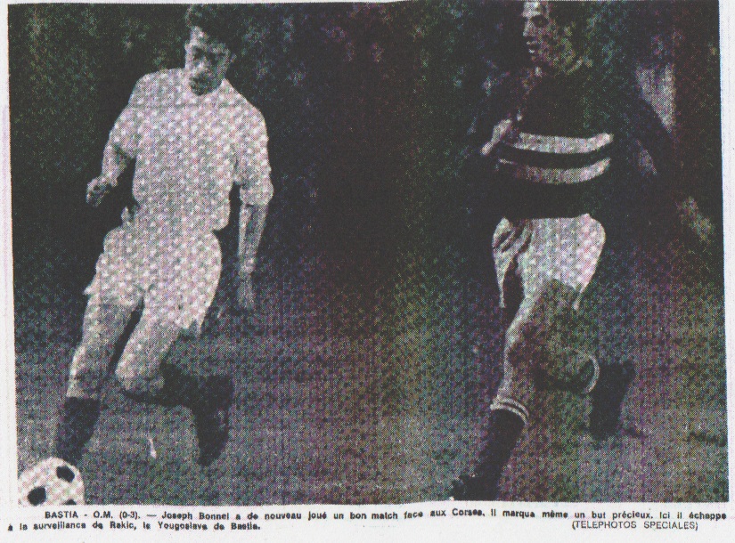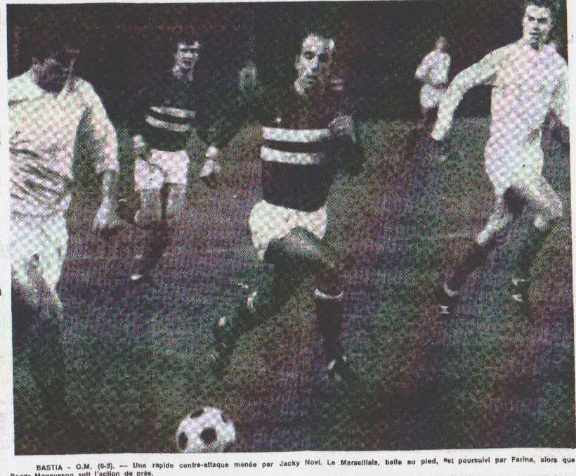 31e : le centre de Farina Mais immédiatement, l'arrière insulaire menait une contre-attaque terminée par un centre tendu. La balle ricochait sur une aspérité et le rebond était à deux doigts de tromper Escale. On voyait ensuite Serra éviter au Hodoul et tirer nettement à côté (35e mn). Puis Franceschetti plaçait un retourné dans les bras d'escale. Peu avant le repos, un incident éclaté, Tosi demeurant au sol, alors que les joueurs corses protestaient longuement et se rendaient auprès de l'arbitre. 50e minute : un tir de Skoblar Après ce petit incident qui n'avait pas eu de prolongement puisque situé très près de la pause, on pouvait redouter que la seconde période ne soit moins calme que la première, jouée de façon trop fort correcte. Mais les joueurs des deux camps revenaient des vestiaires lentement côte à côte et les premières actions notables étaient des tirs des artilleurs corses Kanyan et Serra, qui passaient au-dessus et à côté. C'est pourtant Skoblar qui allait passer à la 50me minute le plus près de l'objectif en décrochant, de la gauche vers la droite, un tir que Rossat avait toutes les peines du monde à dévier. Peu après, un tir puissant de Leclercq passait juste à côté du poteau et le Nordiste mis en confiance résiste récidivait. Rossat étant cette fois à la parade. On notait encore une passe de Leclercq, une très bonne reprise Skoblar, un débordement de Magnusson et une passe trop longue de Kanyan vers Serra. 62e minute : Skoblar marque Après une heure de jeu, l'O.M. obtenait son second but. Couecou prenait le meilleur sur Vincenti, s'avançait, attirait à lui Rossat et donnait calmement à Skoblar face aux buts qui, du plat du pied, marquait. Des la remise en jeu, le Yougoslave et Magnusson donnaient vers le centre des balles qui ne pouvaient être prises par Bonnel. À ce moment-là, Papi remplaçant Orlanducci, marquait son entrée par un tir assez sec contrôlé par Escale. Mais les Corses qui rataient beaucoup de passes, ne semblaient pas en mesure de refaire le retard, malgré quelques tentatives comme celle de Franceschetti, stoppée par Escale à la 70me minute. Le dernier quart d'heure était encore contrôlé par les Marseillais décontractés, et l'O.M. s'attribuait une victoire logique alors que nous apprenions le chiffre de la recette : 9 millions pour 10.368 spectateurs payants, ce qui n'est pas mal du tout, en définitive ! Encore Skoblar Skoblar auquel on venait de refuser un but pour hors jeu allait parachever succès olympien en marquant un troisième but au moment du coup de sifflet final, avec la complicité d'une jambe bastiaise. Louis DUPIC |