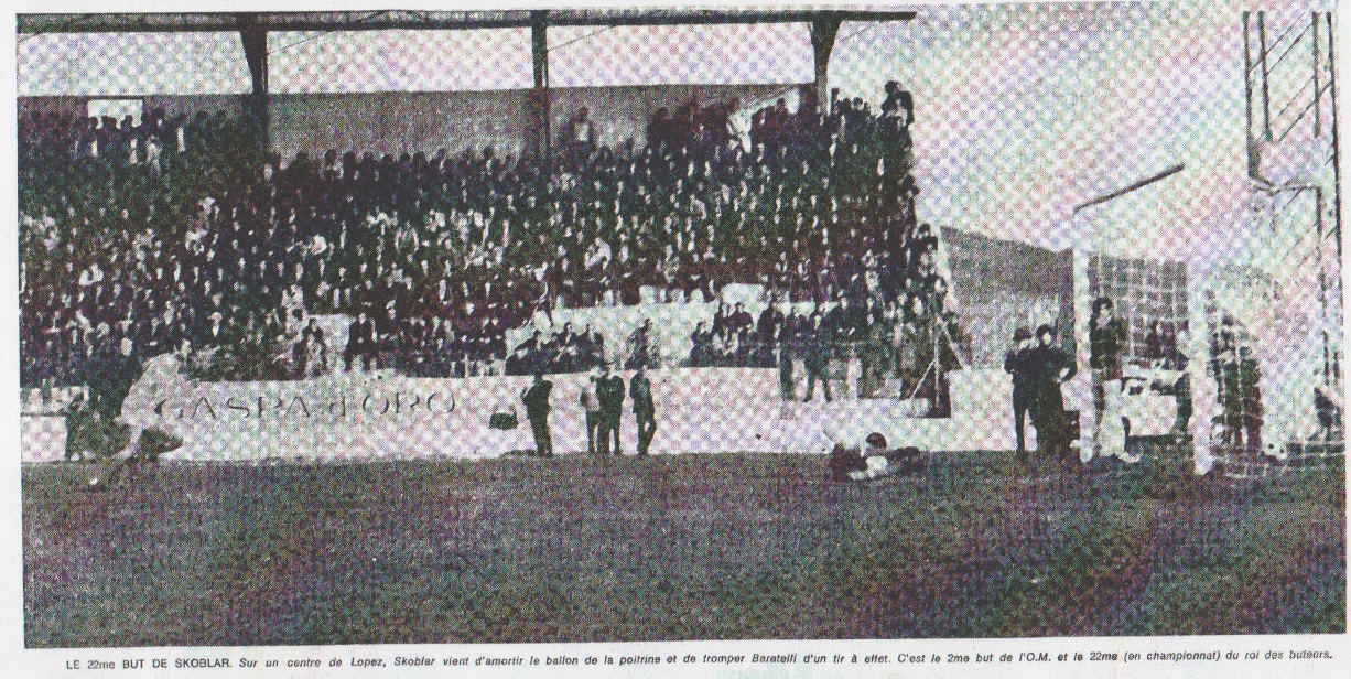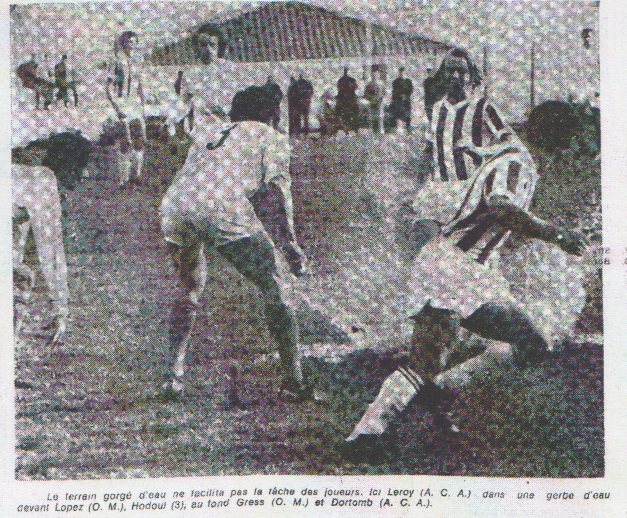 Le terrain est-il jouable ? On oublie trop souvent que le football n'est pas un sport de saison, mais de plein air. Comme il y a dans le tour de France, des étapes de montagne disputées sous la pluie, la grêle... et parfois sur la neige, lesquelles ont grandement contribué à la légende du sport cyclisme, le football, lui aussi peut-être jouer par tous les temps et sur toutes les surfaces. Il est bien évident que dans ces conditions très particulières le football n'a plus son visage habituel. L'énergie, l'astuce, la volonté priment la technique, bien que cette dernière soit souvent la meilleure arme des vainqueurs. Disons donc que le terrain était difficile, mais jouable et que nous avons, tout de même assisté à un vrai match de football, âpre, virile et cependant correct. Les 23 joueurs doivent en nécessité, surtout à une époque où les personnes mal informées reprochent aux footballeurs professionnels français de ne pas savoir se battre. II) Le penalty est-il justifié ? Bien difficile de dire de notre place. La visibilité était mauvaise et le nombre des joueurs des deux camps très nombreux dans la surface de réparation de l'O.M. Il nous a semblé que le ballon allait vers l'épaule ou le bras de Lopez et que, par conséquent, la faute était involontaire. Mais nous n'en avons pas la certitude. |