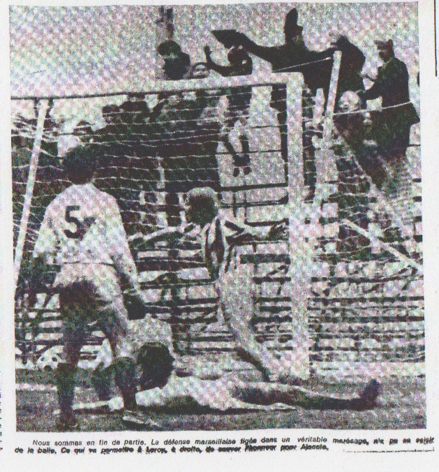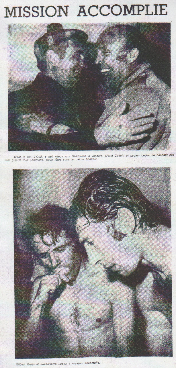 "Avec la coupe, on ne peut pas savoir. C'est l'épreuve avec tous ses mystères. Le pétard sous le banc C'est au moment où les Marseillais étaient bousculés qu'un gros pétard éclata sous le banc de touche ou Zatelli, Leduc, le président Leclerc et Couecou étaient passablement tendus. Mais seul Leduc, plus nerveux sans doute, fut un véritable saut de carpe. À propos de banc de touche, la délégation marseillaise, la première arrivée sur le terrain, s'était installée sur le banc réservé aux Acéistes. On discuta ferme un bon moment avant que chacun ne reprenne sa place respective. C'est que les Ajacciens tenaient absolument à retrouver la leur ! Gress adopté Gilbert Gress a produit une grosse impression sur le public corse. Tout le monde l'a trouvé formidable et il fut très applaudi dans ses évolutions. "Ah ! Si nous l'avions à l'A.C.A., celui-là "Eh bien ! Aujourd'hui, on aurait battu l'O.M. !" Cette réflexion entraîna la réplique suivante : " Le président Ferracci n'a qu'à demander au président Leclerc de le prêter à l'A.C.A. ! On ne sait jamais. Il a bien un peu de sang corse dans les veines, ce Leclerc !" |