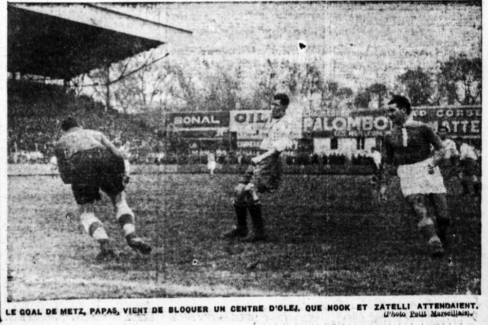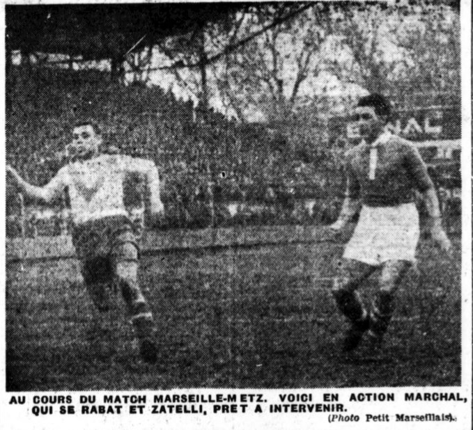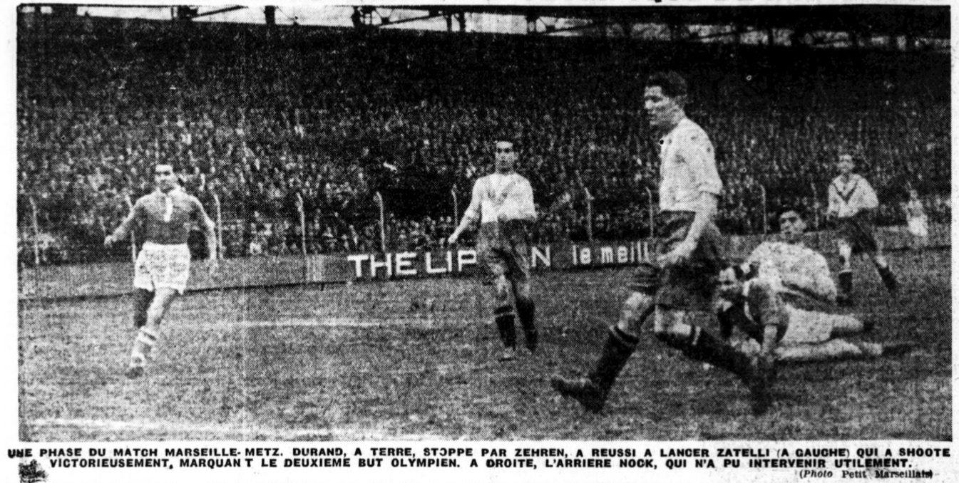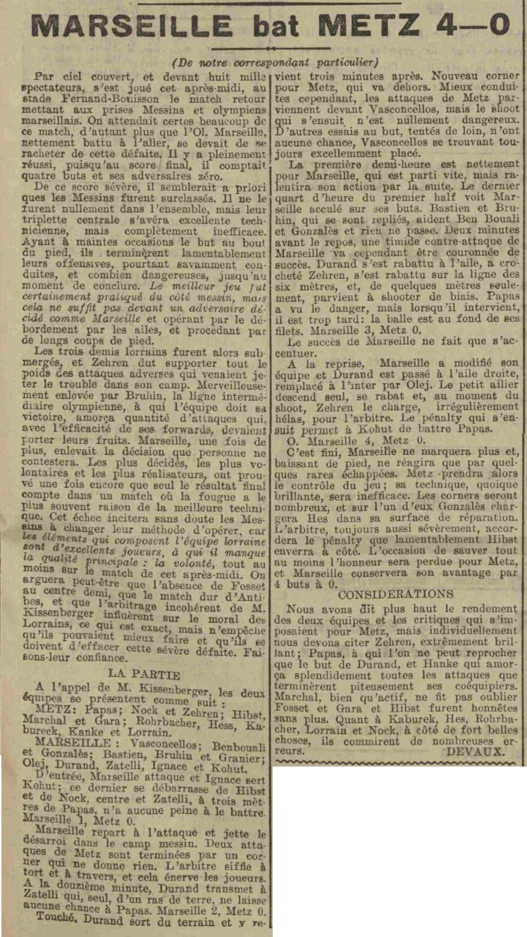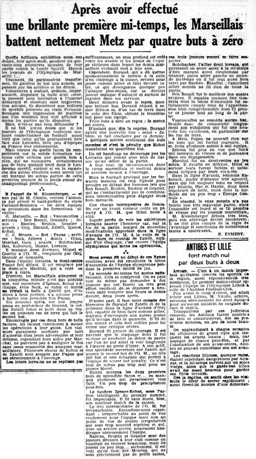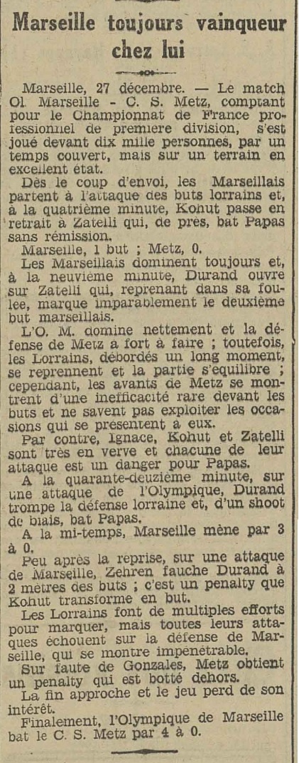 Malgré le temps grisâtre et douteux le stade Fernand Bouisson fut encore hier le rendez-vous d'un très grand nombre de spectateurs. Disons qu'ils ne furent nullement déçus tant la partie fut attrayante et disputée, surtout dans le clan olympien, avec une rare énergie et une volonté de vaincre apparente. Au début de la poule retour, les Marseillais tenaient à un succès non seulement pour améliorer le classement mais aussi afin de prendre leur revanche sur les Messins qui à la première rencontre du championnat, les avaient battus par 3 buts à 1. Malgré l'absence de Zermani, blessé, ils purent mettre à exécution leur projet. Tout au long de la rencontre ils jouèrent avec une maîtrise qui enthousiasma le public. Jamais ils ne permirent à leurs adversaires d'imposer leur jeu. Le résultat obtenu hier par les Phocéens est net et montre combien l'efficacité de l'attaque et grande. Ce succès, il convient de le dire, es aussi en grande parie l'oeuvre du tandem défensif auquel s'était joint Bruhin. Ils surent juguler les inters messins qui en aucune occasion ne purent permettre à Kabureck de produire son shoot qu'on dit fameux. Ainsi stopper, les avants ne parvinrent jamais à combiner des attaques vraiment dangereuses. Par contre, les Olympiens surent lancer tour à tour Kohut et Durand. Très en verve, les ailiers à chacune de leurs incursions semèrent la panique dans le clan visiteur. Papas peut d'ailleurs s'estimer heureux de ne pas être allé plus souvent chercher la balle au fond de ses filets. Plus rapides dans leurs évolutions, les locaux surprirent constamment leurs adversaires qui ne purent en aucun moment se mettre au diapason. En moins d'un quart d'heure, Zatelli servi par Durand Donnait à son équipe l'avantage de deux buts. Avant le repos, Durand bien lancé, évite Zehren et du gauche place un shoot qui laisse sur place le goal messin. La deuxième mi-temps fut également abordée avec une activité égale, mais par instant la fatigue apparaissait. Quelques heurts se produisirent d'ailleurs, sans conséquence grave. Sur penalty, Kohut aggravait la marque d'un but nouveau alors que Hanke en loupé un de façon magistrale. Jusqu'à la fin, malgré quelques offensives fort bien construites par les olympiens, le score restera de 4 à 0 en faveur des locaux. Ainsi par ces deux victoires successives, l'Olympique améliore sérieusement son classement et peut ainsi espérer jouer les premiers rôles. Sa défense s'est montrée hier sous un heureux jour. Rapide dans ses interventions, elle ne permit pas aux attaquants adverses de composer. A ce jeu, Ben Bouali fit montre d'une forme splendide. Rarement il fut pris en défaut. D'ailleurs, il sut conjuguer son jeu à celui de son compère Gonzales. Tous deux opérèrent de façon à laisser un champ de visibilité suffisant à Vasconcellos dont l'exhibition fut également fort plaisante. |