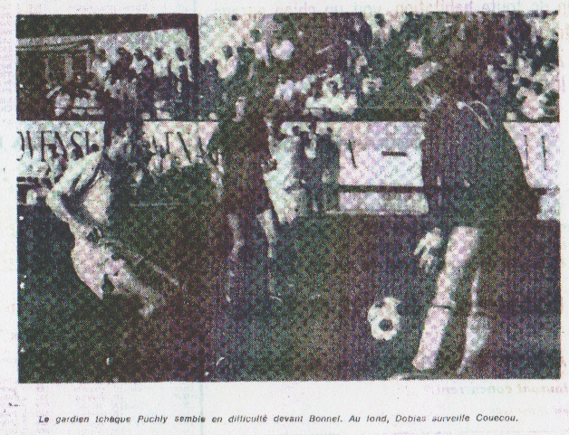 La rencontre commencerait-elle à se positionner et à se durcir ? En tout cas, Dobias, touché par Couecou, doit sortir pour se faire soigner, tandis que Valentovic entre à la place de Varantin. Les dernières minutes de la première mi-temps voient l'attaque de l'O.M. manifester enfin quelques velléités offensives. Est-ce pour la deuxième mi-temps le grand jeu des vedettes étrangères de l'O.M. ? Nous le souhaitons. 48me minute : le but de Masrna Aucun changement à la reprise. Dès la première minute, un tir assez lointain de Faudel oblige Escale à concéder un corner. Cela n'est rien. Beaucoup plus grave va se produire tout de suite après (48me minute). Un coup franc est sifflé contre Lopez près du point de corner gauche. Kabat le tire : l'arrière et capitaine Jarabek, monté à l'attaque, reprend violemment de la tête. Escale ne peut que repousser le ballon. Celui-ci est repris par Masrna, qui marque à bout portant. Trnava : 2 - O.M. : 0. Ce deuxième but va-t-il redonner du punch à l'O.M. ? Voici enfin, un bon dribble et une excellente passe de Skoblar en direction de Magnusson. Curieusement, le Suédois tombe tout seul, abandonnant le ballon à ses adversaires surpris, pendant que le public éclate de rire. Décidément, Roger n'a encore rien prouvé cet après-midi. Dans l'équipe de l'O.M., toujours très dominée, on note un changement. Depuis déjà un certain temps. Loubet joue avant-centre, Couecou restant en position d'ailier gauche. Le brave Bonnel Le festival à sens unique de Trnava va se produire. Sur une attaque rondement menée le long de la touche droite par Masrna, Escale doit intervenir in extremis (72me). La défense marseillaise supporte tout le poids du match et, quand son attaque réussite à partir, l'équipe est littéralement coupée en deux. La troupe surmenée ne peut plus suivre l'état-major. Il reste tout de même l'espoir d'un petit but, heureux ou pas, qui, à lui seul, rétablirait sa situation pour l'instant compromise. C'est-ce que doit penser Bonnel, qui part bravement à l'attaque sur une passe de Skoblar, mais il semble manquer de force au moment du tir. C'est encore Bonnel qui, comme point final à la meilleure attaque collective de l'O.M. de tout ce match, tire de peu à côté (75me). Dans la minute qui suit, Escale doit repousser du poing un centre très dangereux de Masrna. Exploit d'Escale tir de Loubet Nous entrons dans le dernier quart d'heure et notons que le deuxième tir de l'O.M., dans l'encadrement depuis le début du match : il est l'oeuvre de Skoblar sur coup franc. Là-dessus, un sur un tir de volée de Fandel, nouvel exploit de Escale, dont l'arrêt est applaudi par tout le public. Encore 8 minutes. Un super tir de Loubet fait naître l'espoir. Un pied slovaque le détournant corner. Dans la seconde qui suit ce corner, Martinkovic arrive seul devant Escale, après avoir dribblé Zwunka, et rata le but. Dieu seul sait pourquoi ! Plus que 5 minutes, et un tir de Loubet est repoussé du poing par le gardien de Trnava. Et la fin arrive sur la victoire logique de Trnava par 2 à 0. |