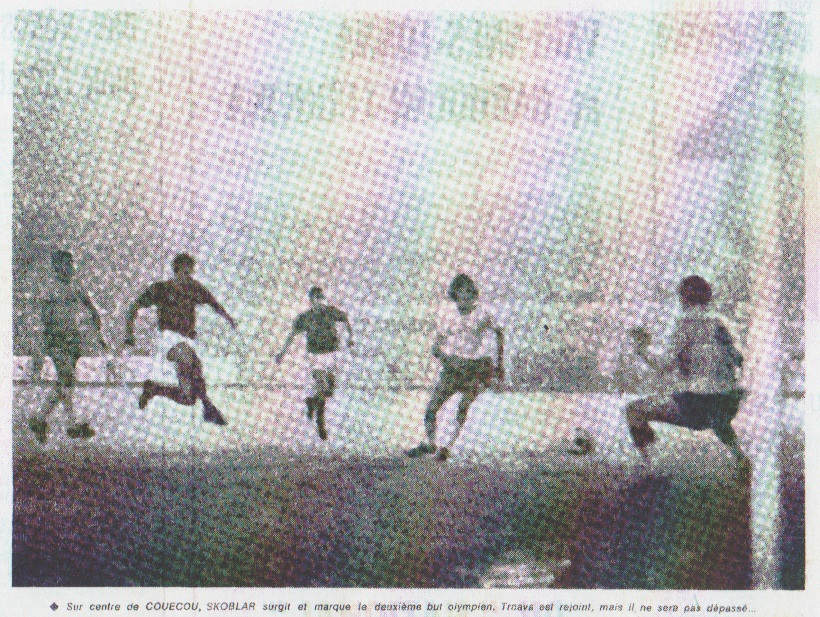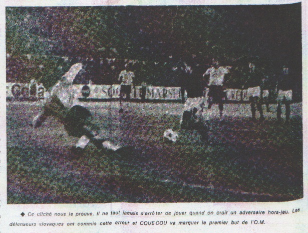 Skoblar et à deux doigts de faire le trou ; il est revenu par Fandel et c'est un coup franc à la limite complètement raté. À la 50e minute, c'est un véritable bombardement du but de Geryk : quatre ou cinq tirs consécutifs etant miraculeusement repoussés. Une minute plus tard, Novi trompe le gardien visiteur mais son tir est renvoyé par le poteau. Geryk soumis à rude épreuve est soigné pour un saignement du nez, cela permet à ses partenaires malmenés de souffler un peu et Trnava obtient deux corners. Le temps passe Loubet réussit un joli centre mais Skoblar de la tête, ne peut ajuster parfaitement sa reprise. Le temps passe et joue en faveur des visiteurs. On emporte un nouveau blessé, Fandel, sur la touche. A la 60e minute, Dobias donne une balle de but à Masrna contré au dernier moment par Zwunka. Un centre parfait de Kabat est manqué de justesse de la tête par Martinkovic. Couecou, bien servi par Bonnel place un très bon tir remarquablement stoppé par Gerik à la 67e minute. La brume est de plus en plus dense, Couecou, encore lui, tente une reprise acrobatique qui va de peu à côté. 73e : Skoblar marque ! C'est de la folie sur le stade quand Skoblar, servi par Couecou, contrôla balle de la poitrine et marque à bout portant. L'O.M. a rejoint son adversaire ! Et tout de suite Gerik doit sauver sur un tir lobé du Yougoslave. Le dernier quart d'heure n'est qu'une sombre pagaïe. Jarabek est emporté sur une civière, Bosik le remplace et on note un début de bagarre générale. On va jouer les prolongations. Le feu aux poudres La prolongation débute par un magnifique pugilat entre Couecou et Majernik et les deux belligérants sont expulsés. Trnava a perdu ses deux arrières centraux. Un peu plus tard Geryk à un nouveau réflexe miraculeux devant Loubet. Dès deux côtés, en attaque à fond, et un coup de tête de Bonnel est encore dévié par le gardien slovaque. Avalanche de boîtes de bière Dobias retient Loubet qui allait aux buts. Et ce même Charly lancé par Hodoul s'en va seul rater sa troisième occasion de cette soirée hors-série. Les deux adversaires épuisés vont s'affronter dans une ultime épreuve, celle des penalties. L'O.M. battu aux penalties Elle va se dérouler dans une atmosphère dramatique et un silence religieux quand Magnusson tire et manque, Kuma tire et marque malgré les sifflets. Kula marque Dobias marque. Skoblar, hyper nerveux, tire le sien au-dessus Hrusecky marque. Geryk arrête celui de Novi tiré trop mollement. Suspense car Escale arrête celui de Fandel. Hodoul marque et égalise. C'est à Kabat de jouer. Il marque et l'O.M. est éliminé. Louis DUPIC |