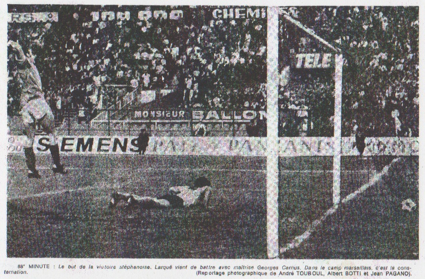 QUE S'EST-IL PASSÉ EXACTEMENT SUR LE TROISIÈME BUT STÉPHANOIS ? Gilbert Fresse, qui se trouvait tout près du lieu de l'action, s'est montré catégorique : le juge de touche à lever son drapeau, et lui a déclaré "Hors jeu de position". M. Wurtz appelé immédiatement n'a pas tenu compte de l'observation de son juge de ligne et a validé le but. Étant seul maître sur le terrain, c'était son droit le plus strict, et ce n'est certes pas la première fois qu'un but est accordé en dépit d'un hors jeu de position. Cependant, dans un match de cette importance, il semblerait souhaitable que chaque faute si bénigne soit-elle, fut sifflée. À l'issue de la rencontre nous n'avons pas pu voir M. Wurtz qui, ferme dans son vestiaire, a refusé catégoriquement de recevoir les journalistes. On peut cependant imaginer que, sur ce point neuf précis, il aurait pu nous déclarer : "J'ai parfaitement vu le Stéphanois en position de hors-jeu. Mais celui-ci étant à l'autre bout du terrain, ne participa pas à l'action et d'influençait en aucun cas le jeu". On le voit, il est bien difficile de trancher ! COUECOU AVAIT-IL MARQUÉ ÊTRE A LA 37 me MINUTE A la suite d'un cafouillage, vers la fin de la deuxième mi-temps, une reprise de la tête de Couecou fut repoussée in extremis par Herbin, alors que Castel était battu. Le capitaine stéphanois était alors à intérieur de son but. Le problème est de savoir si le ballon, lui, est rentré. Rappelons à ce sujet un point formé du règlement qui stipule que la balle doit franchir ENTIEREMENT la ligne pour que le but soit valable. M. Wurtz, qui a pour habitude de suivre le déroulement du jeu de fort près, en était, cette fois, assez éloigné : mains sur les hanches, il se trouvait à 25 mètres environ. Quant au juge de ligne, très bien placé, il n'a pas bougé. Pour Didier Souecou, la question de se pas : "Le ballon était rentré de 30 centimètres quand Herbert l'a sorti". |