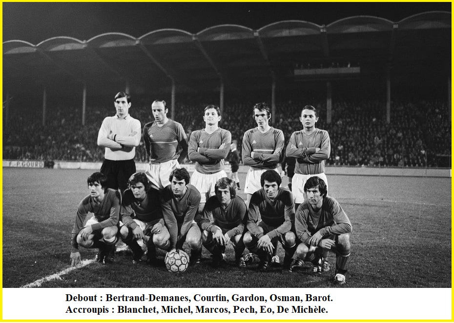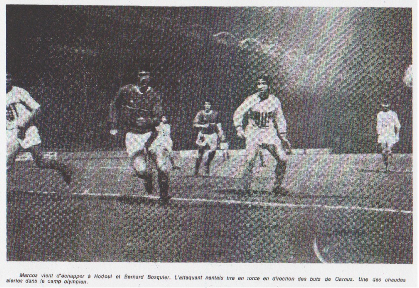 Pendant ce temps, l'O.M. s'efforce de garder la balle, de casser le jeu. Bosquier revient à la 30me minute, à la faveur d'un corner, mais semble gêné et hésitant visiblement à se servir de son pied droit. Carnus arrête bien un tir à ras de terer de Marcos, mais le jeu ne gagne rien en qualité. C'est bien le plus mauvais O.M. - Nantes auquel nous ayons jamais assisté. 38me MINUTE : BUT DE SKOBLAR L'O.M. va pourtant ouvrir la marque la suite d'un dribble de Magnusson, arrêté par un croc-en-jambe de De Michele, excellent jusqu'alors. Le Suédois donne lui-même le coup franc indiscutable, dévié de la tête par Couecou sur Skoblar, dont le tir du gauche claque comme un coup de fusil. Contre toute attente, l'O.M. mène au tableau d'affichage et se trouve même à deux doigts d'augmenter son avantage, à la suite de deux coups de tête consécutifs de Couecou et Bonnel. Et c'est encore un coup de tête signé De Michele qui fait naître le danger devant le but de Carnus. La première période se termine donc de façon plutôt spectaculaire et personne ne s'en plaindra, le début de la partie ayant été assez atroce. Nantes aborde la deuxième période avec autant de détermination que la première, mais son manque de réalisme éclate, quand plusieurs Bretons laissent passer devant le but marseillais une passe remarquable de Marcos. Il faut un coup franc pour que Blanchet, de la tête, inquiète Carnus, qui réussit à aller chercher la balle dans un coin de son but, alors que les 30.000 Nantais croyaient à l'égalisation. Skoblar réplique par une échappée et un tir que Bernard Demanes a du mal à contrôler. 53me MINUTE : BLANCHET ÉGALISE C'est une passe lumineuse de Marcos qui va permettre à Nantes d'égaliser par Blanchet. Sur une longue ouverture de l'Argentin, le petit ailier prend tout son monde de vitesse, se heurte à Carnus, sorti jusqu'à la limite de sa surface, et malgré son intervention désespérée, parvient à redresser sa course et à envoyer la balle dans la cage vide. Un très joli but en vérité, qui encourage logiquement les Nantais. On note ensuite un tir appuyé et pour une fois pas trop aérien de Michel qui frôle la transversale. BOSQUIER S'EN VA On joue depuis une heure quand Bosquier, qui souffre depuis le début, quitte le terrain, cédant numériquement sa place à Leclercq, Novi devenant l'ultime défenseur devant Carnus. Sur le terrain on discute de plus en plus. On coupe les cheveux en quatre. Dans les tribunes on hurle, on trépigne. Nous assistons vraiment à un très mauvais match. Et Blanchet tire pour la troisième fois un corner derrière le but ! Un signe indiscutable de nervosité. Gardon abat Skoblar. Bonnel descend Eo. C'est le règne de l'anarchie la plus complète. Pech, en bonne position, tire nettement au-dessus. Les Nantais unissent leurs efforts pour faucher Magnusson et y arriver définitivement. Pech venant à bout du Suédois par une "ceinture avant". Le public déçu réclame l'entrée en jeu du douzième homme, le jeune Rampillon, et l'obtient, puisque ce dernier remplace Eo à la 80me minute. Les cinq dernières minutes sont très disputées. Le poids de la victoire est en jeu, mais rien ne se passe de tranchant, sauf un corner pour Nantes, et finalement l'arbitre siffle la fin de la rencontre sur un match nul, 1 à 1. Louis DUPIC |