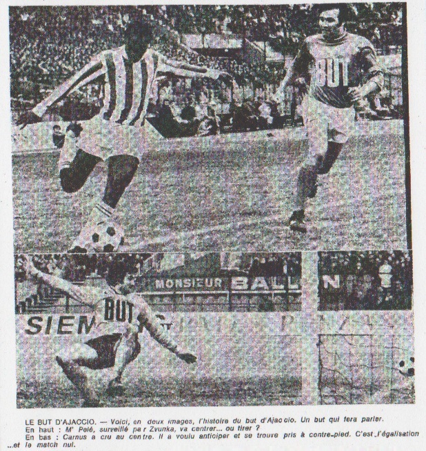 Croyant que M'Pele allait centrer, il a voulu anticiper. Malheureusement pour lui, c'est le contraire qui se produisit. M'Pele a-t-il réussi son tir, ou a-t-il raté son centre. Nous optons pour la deuxième solution, mais il faut toujours accorder à un footballeur le bénéfice du bien joué. D'autant que ce M'Pele n'est pas un mauvais joueur. Bien au contraire. B) LE HORS JEU DE SERRA : Là, il est certain que l'arbitre a commis une erreur. Sur l'une des rares contre-attaques d'Ajaccio, Serra reçut le ballon alors qui se trouvait dans son camp. Entre lui et Carnus vers : personne. C'était, à nouveau, le coup de Cruyff. L'arbitre de touche fit signe à l'Ajaccien de continuer, mais l'arbitre principal siffla hors jeu. Tout le monde se trompe, mais enfin il s'agit là d'une erreur assez grossière. Cela dit, l'arbitrage de M. Coquerille fut bon.