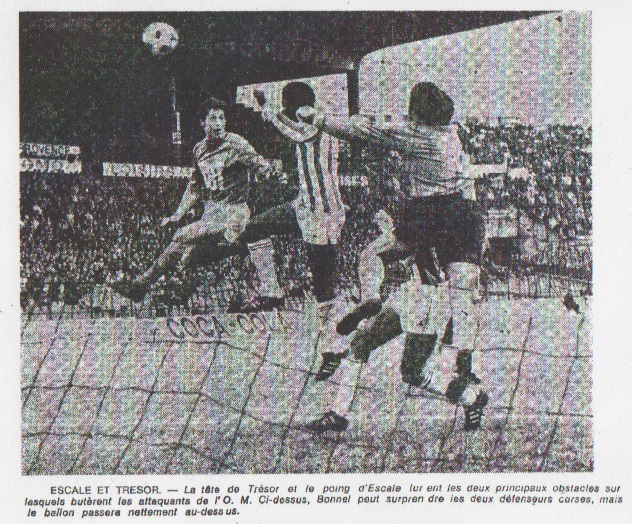 Deux joueurs dominèrent le match. C'est encore une constatation que tout le monde a pu faire. Bosquier et Trésor. Bosquier, se rendant compte que les Ajacciens jouaient franchement le match nul, joua franchement l'attaque. Nous n'avons pas besoin de relire nos notes, pour écrire qu'il fut le seul buteur olympien du match. On notera, surtout en deuxième mi-temps, son tir de 27 mètres environ, sur la transversale. Le seul tir sur lequel Escale parut battu. Trésor, moins offensif et il est inutile d'expliquer pourquoi, fut souverain dans sa zone de défense. Quelle aisance, quel abattage, quelle classe ! Un vrai Trésor. On ajoutera que, les rares fois où il se manifesta en contre-attaque, il se montra clairvoyant et précis.