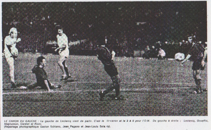 Le merveilleux gauche de LECLERCQ Nous garderonts longtemps le souvenir de ce tir fulgurant qui par la grâce du pied gauche magique de Daniel Leclercq allait se figer sous la barre d'un Bertrand éberlué par autant de puissance et de précision. Et comment ne pas souligner l'ovation populaire qu'il l'accueillit. Pour les milliers de spectateurs enthousiastes, cette action remarquable constituait un régal des yeux, un de ces événements qui longtemps alimentent la chronique. Aujourd'hui et demain et après-demain encore, on évoquera dans tous les lieux ou bat le coeur de l'O.M., la merveilleuse réussite de Daniel. Nous avons longtemps suivi, hier soir, la performance de ce jeune garçon aux cheveux d'or, qui sans l'air d'y toucher se conduit le plus clair du temps en véritable "patron". Durant les quarante-cinq premières minutes, il ne tourna peut-être pas à son régime, mais après le repos ce fut un festival. On ne compta plus ses passes distillées au millimètre, ces immenses transversales trouvant toujours un partenaire démarqué, s'engouffrant aussitôt dans l'espace libre et portant très vite le danger dans le camp adverse. Une telle vision du jeu, une telle pureté dans la trajectoire constituent autant d'armes magiques propres à forcer la décision. De l'aile gauche, ce fut lui l'instigateur du second but, mettant littéralement sur le pied de Skoblar un ballon aussitôt propulsé dans les filets. Et il était normal - et fort juste - qu'il connaisse lui aussi la joie de participer grâce à son but de rêve à la victoire finale. Par la suite, bas retournés sur les jambes roses, il servit de pôle, plaque tournante par laquelle passait la quasi-totalité des actions offensives bien. Mieux, sans avoir l'air d'y toucher avec cette rare décontraction propre aux athlètes déception, il se permit le luxe de dribbler dans un mouchoir de poche deux rivaux décontenancés par autant de technique. Décidément, Daniel Leclercq c'est bien la révélation de l'O.M. de Kurt Linder. Désormais on voit mal qui pourrait le suppléer dans un rôle de distributeur et aussi de finisseur qui lui colle à la peau. Avec lui, les Marseillais ont trouvé l'homme de la situation, et si à Paris, il fut à la base des trois buts marqués par les Olympiens, si au stade de Gerland il se montra aussi souverain dans son face-à-face avec les Italiens de la "Juve", hier soir, il a fait la conquête de Marseille. Gérard PUECH |