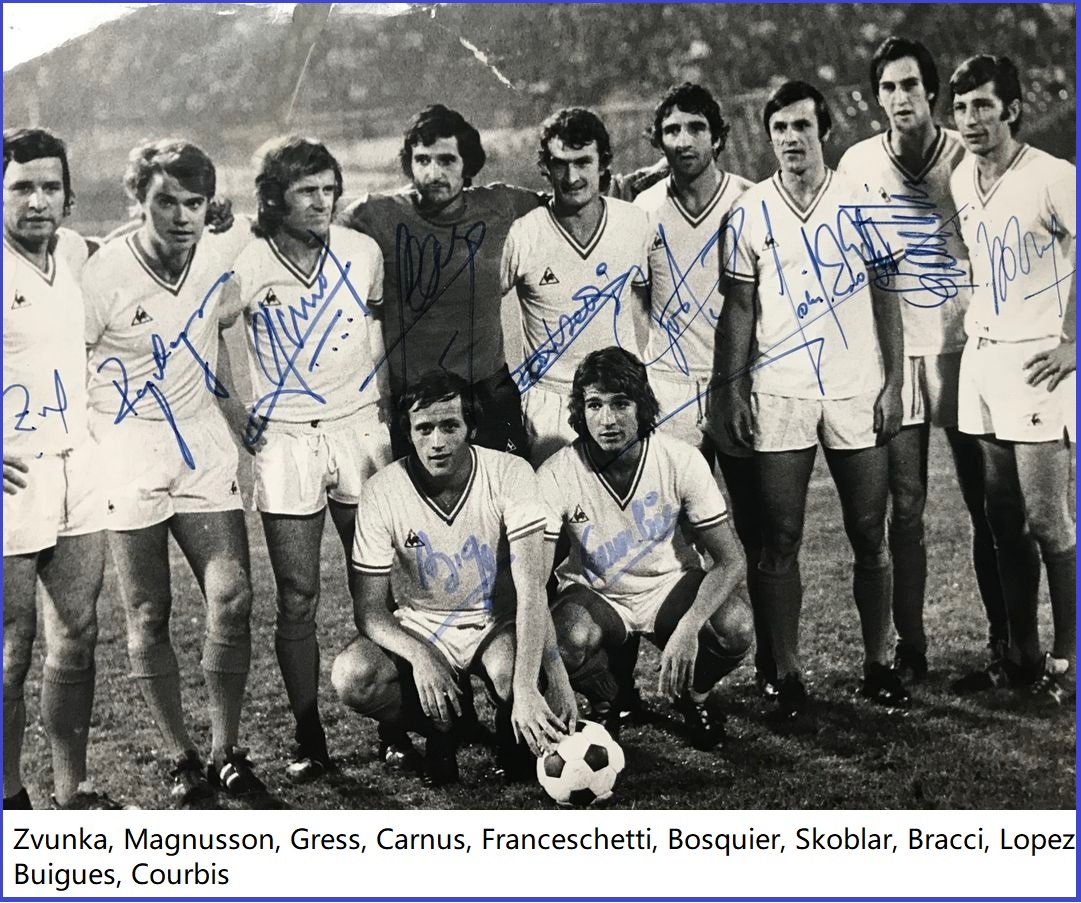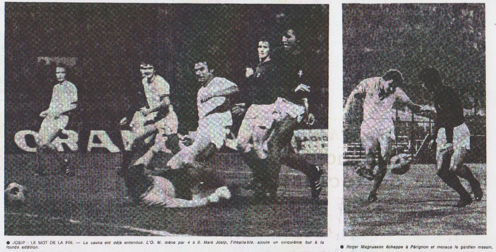 Les Messins apparaissent décontenancer et réagissent mal. Buigues s'écroule (37me), à la suite d'un choc avec Pérignon ; il souffre et va se faire soigner sur la touche ; ce n'est pas grave, et il reprend vite sa place. Une nouvelle tête de Courbis (40me) oblige Baulier à renvoyer de la tête également. À la mi-temps, Muller remplace Pérignon dans le "onze" lorrain. À la 50me minute, Barth est terriblement en danger, le but chauffe, mais Gress se montre malchanceux et la balle finit par sortir. "Allez l'O.M. !" encourage le public. Les Olympiens font le forcing (54me). Au milieu d'un paquet de joueurs, Buigues tire en force, en dehors de l'encadrement des bois. Barth est encore en difficulté (60me), mais un corner botté par Magnusson n'est pas suivi d'effet. Fandino riposte avec force à la 62me minute, mais Carnus détourne sur le montant droit. La partie est toujours acharnée, sans être d'un niveau extrêmement élevé. Bosquier montre le bout de l'oreille en expédiant un bolide de 30 mètres que Barth a du mal à repousser (68me). Combin donne des sueurs froides aux supporters olympiens en bottant de près sur Carnus (70me). À la 71me minute, Skoblar par marque un deuxième but refusé pour hors jeu. Le public siffle l'arbitre, M. Martin. À la 74me minute, sur passe de Magnusson, Skoblar, comme un bulldozer, fonce, Barth lui plonge dans les pieds, mais la balle fuse dans les bois. O.M., 2 - Metz, 0. À la 77me minute, Courbis, qui boîte, sort du terrain et il est remplacé par Leclercq. Le public applaudit à juste titre. Un coup franc de Bosquier est bien arrêté par Barth (80me). À la 82me minute, Magnusson réalisa un véritable exploit ; il s'échappe le long de la touche, shote dans sa foulée et réussit le 3me but olympien. O.M., 3 - Metz, 0. À la 85me minute, Gress adresse un centre en hauteur sur la tête de Franceschetti qui trompe à son tour Barth. O.M., 4 - Metz, 0. L'O.M. est déchaîné, Skoblar part comme une fusée, il est irrésistible et il score ! O.M., 5 - Metz, 0. Alain DELCROIX |