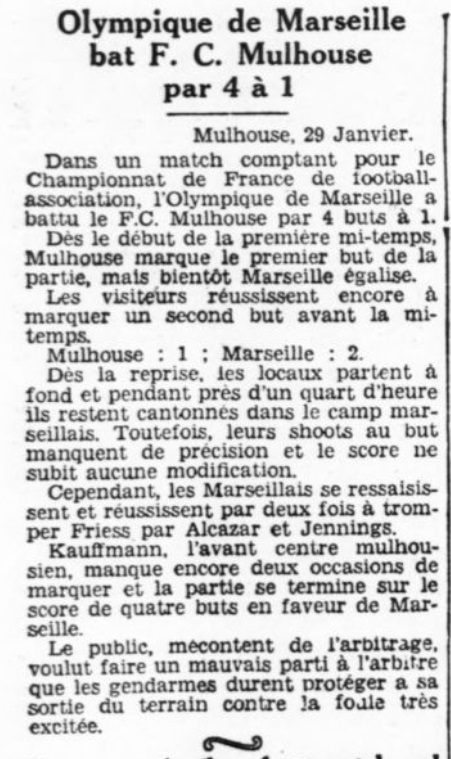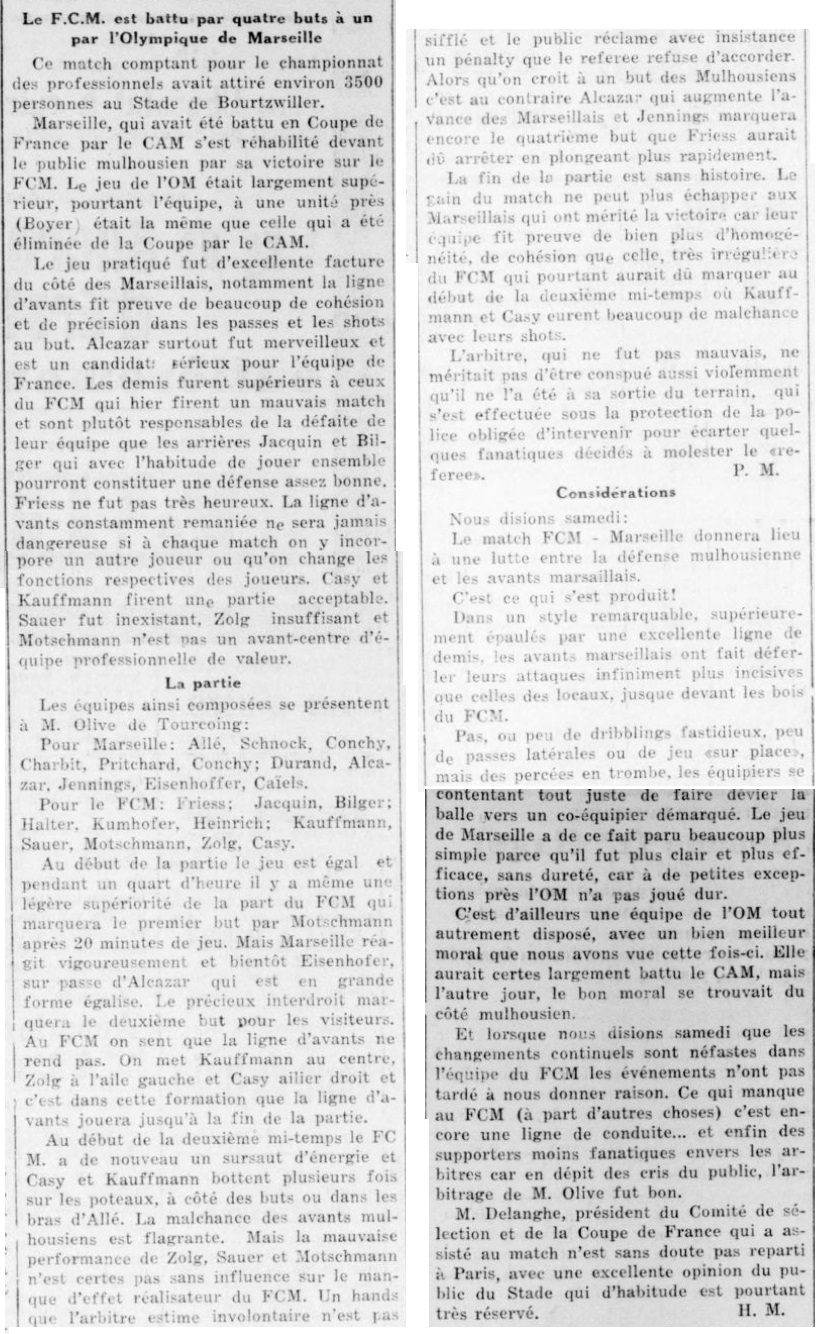 La belle victoire de l'O.M. sur le F.-C. Mulhouse ____________________ O.M. : 4 --- F.-C; Mulhouse : 1 ____________________ (de notre correspondant particulier) ____________________ |