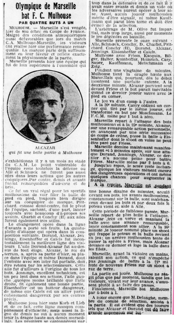 ALLE Qui a fait une superbe partie (Photo Baudelaire) . L'attaque fut la meilleure partie du team et c'est surtout l'aile droite qui fut la plus en vue. Alcazar fut le meilleur homme sur le terrain, tant par son allant infatigable que par la perfection de son contrôle de balle et la précision de ses shots. Durand, après lui, fut le meilleur. Ces déboulés furent toujours dangereux, quoique sa petite taille le désavantageait et lui attirèrent force horions en proximité débute mulhousiens. Jennings fut très actif, alors qu'Eisenhoffer se dépensait beaucoup en soutenant son demi aile débordé et manquant par ce fait dans la ligne d'attaque. L'arbitrage large de M. Olive - non de Marseille mais de Tourcoing - ne fut pas prisé beaucoup par le public mulhousien. Il commis des erreurs, mais ne furent pas trop graves si ce n'est le fait d'avoir refusé un penalty pour main évidente de Conchy alors que la marque était que de 2 à 1. Après le match, les marseillais exultent et se déclarent satisfaits du résultat. L'équipe marseillaise a laissé une très bonne impression par son excellente tenue.