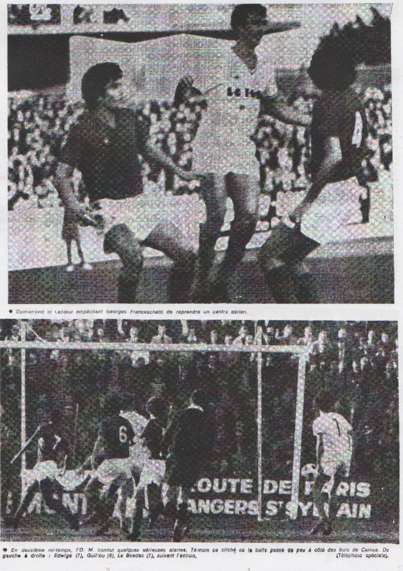 Angers au mois de juin : c'est ce qu'évoque hier la bonne ville du Roy rené, reflétant ses toits d'ardoise aux chauds rayons d'un soleil printanier. "Le soleil d'Austerlitz..." avait laissé tomber, mi-confiant mi-sceptique, le président Gallian, dans le car amenant les joueurs au stade Jean Bouin. On n'allait pas tarder à savoir pour qui le soleil allait briller... Chacun pourtant ne pouvait s'empêcher de penser au fameux "signe indien" ayant invariablement accompagné chacune des apparitions de l'O.M.en terre angevine. "L'O.M. n'a jamais gagné à Angers, ainsi que le titrait hier, sur huit colonnes, l'un de nos confrère de l'Ouest. Etait-ce enfin pour cette fois ? Les deux équipes, en tout cas, se présentent sur le terrain armées d'un égal désir de vaincre, venant toutes deux de subir un passage à vide après un départ extrêmement prometteur. ANGERS ; Gallina ; Bourdel, Lecoeur, Damjanovic, Fievet ; Gillou, Poli ; Edwige, Gaidoz, Lassalette, Antic. Douzième homme : Cassan. O.M. : Carnus ; Trésor, Bosquier, Zvunka, Kula ; Novi, Le Boedec ; Magnusson, Franceschetti, Skoblar, Leclercq. Douzième homme : Emon. L'arbitre était M. Uhlen. Un mot encore sur le public venu très nombreux cette fois, alors qu'il avait pris l'habitude de bouder quelque peu le S.C.O., en dépit des bonnes performances obtenues ces deux dernières saisons.