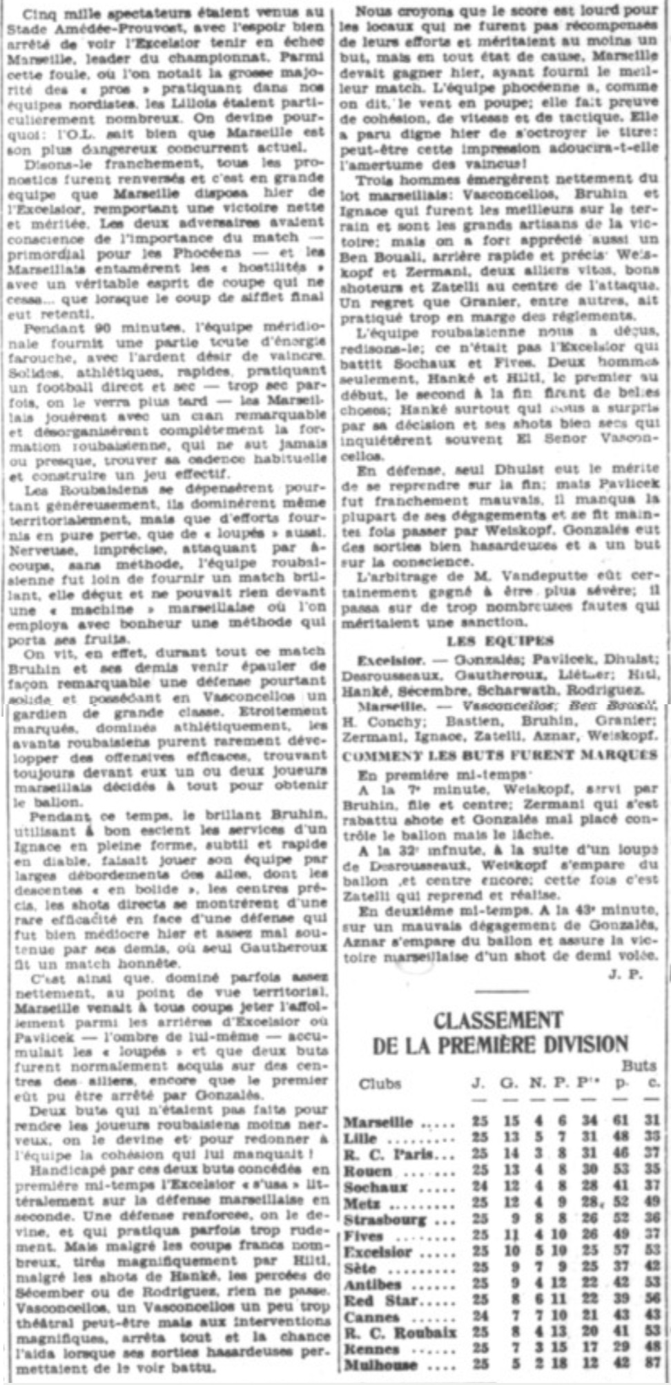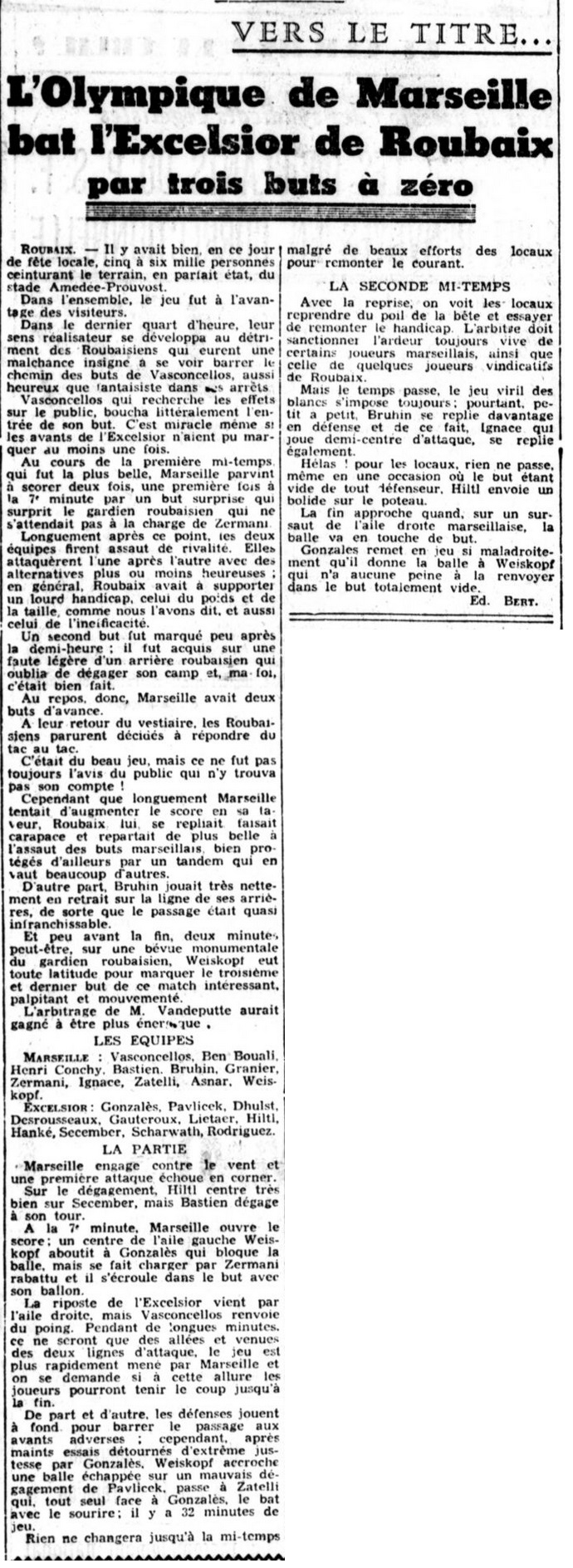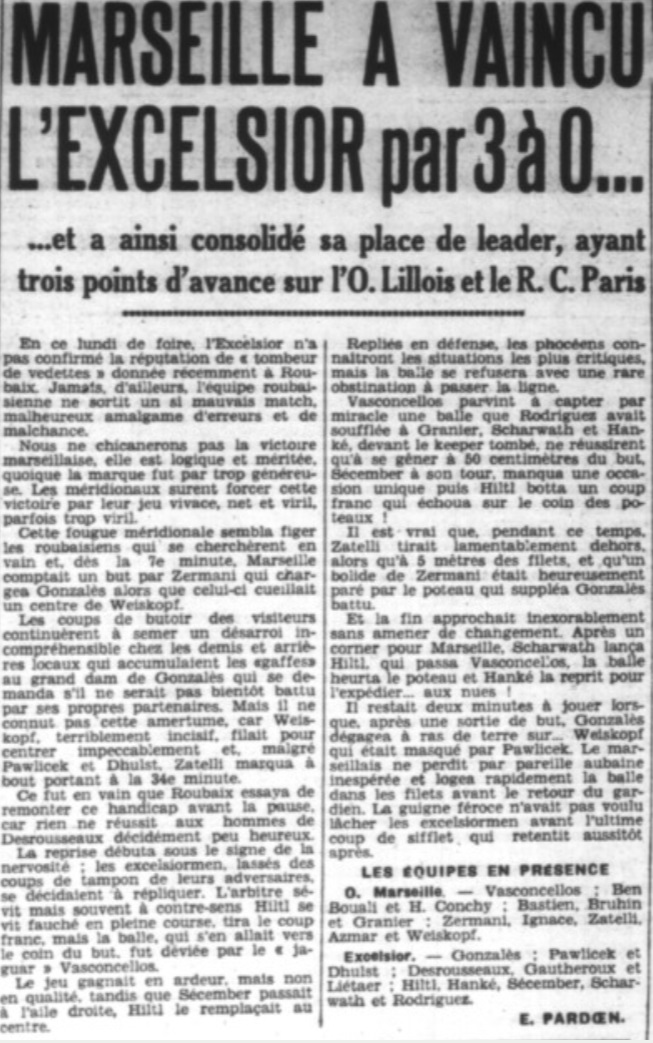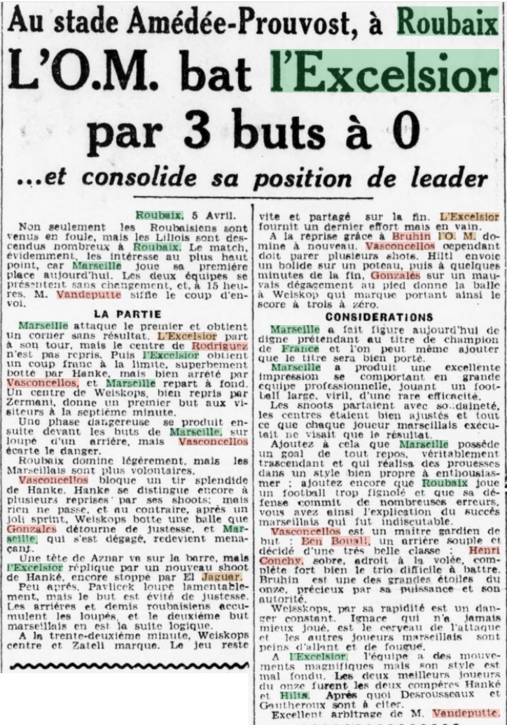 A plusieurs reprises au soir et au lendemain de ce lundi 5 avril qui vit le succès de l'OM, nous avons téléphoné à Roubaix pour avoir des informations directes sur le match. Plusieurs interlocuteurs se trouvèrent ainsi au bout du fil, tous titulaires de l'équipe première. Vint Zatelli, enfin, pour confirmer ce que venaient de déclarer ses camarades : "- C'est exact, j'ai marqué les trois buts contre Excelsior de Roubaix" a-t-il déclaré. L'o, s'étonne, dans ces conditions, que les reporters sportifs aient vu différemment, de telle sorte que l'actif de l'avant centre risque d'être minimiser par erreur. Deux fois Zatelli a cependant marqué sans bravoures sur des centres de ses ailiers. Le troisième a pu donner lieu à confusion, mais la vérité la voici : Weiskopl ayant shooté, Gonzales s'en assura mal le contrôle, et détail précieux, avant que l'arbitre ait sifflé, Zatelli projeta portier et ballon au fond des filets. L'excellent Bruhin, rentre mercredi de Roubaix, nous a confirmé, en tous points ce qui précède. |