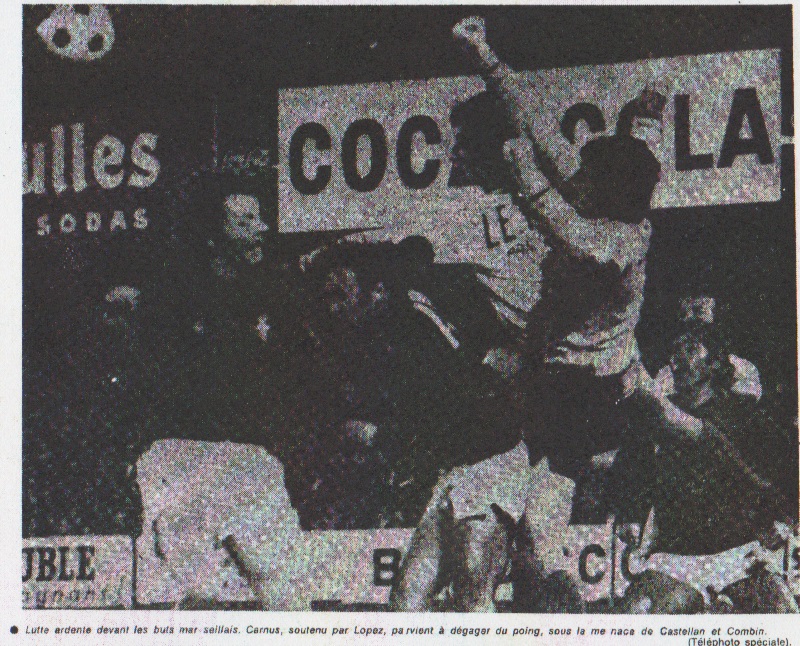 UN TIR TERRIBLE DE NESTOR : BUT ! Mais la situation ne va pas s'éterniser. Combin, malheureux dans ses tentatives en début de match, va prendre une formidable revanche. Mis en possession de la balle à 20 mètres de la cage marseillaise, il résiste tout d'abord à la charge de Zvunka, puis il pivote sur le pied droit, et, du gauche, déclenche en se retournant, un véritable boulet de canon qui va s'enfoncer dans la lucarne des buts olympiens. Carnus, surpris par la soudaineté du tir, n'a pas esquissé le moindre geste de défense. Metz mène donc par 1-0 (34e). Abasourdi par ce but de puncheur, l'O.M. est encore obligé de faire face à des situations difficiles avant la mi-temps. Il parvient toutefois à se dégager et n'a qu'une longueur de retard en rentrant aux vestiaires.