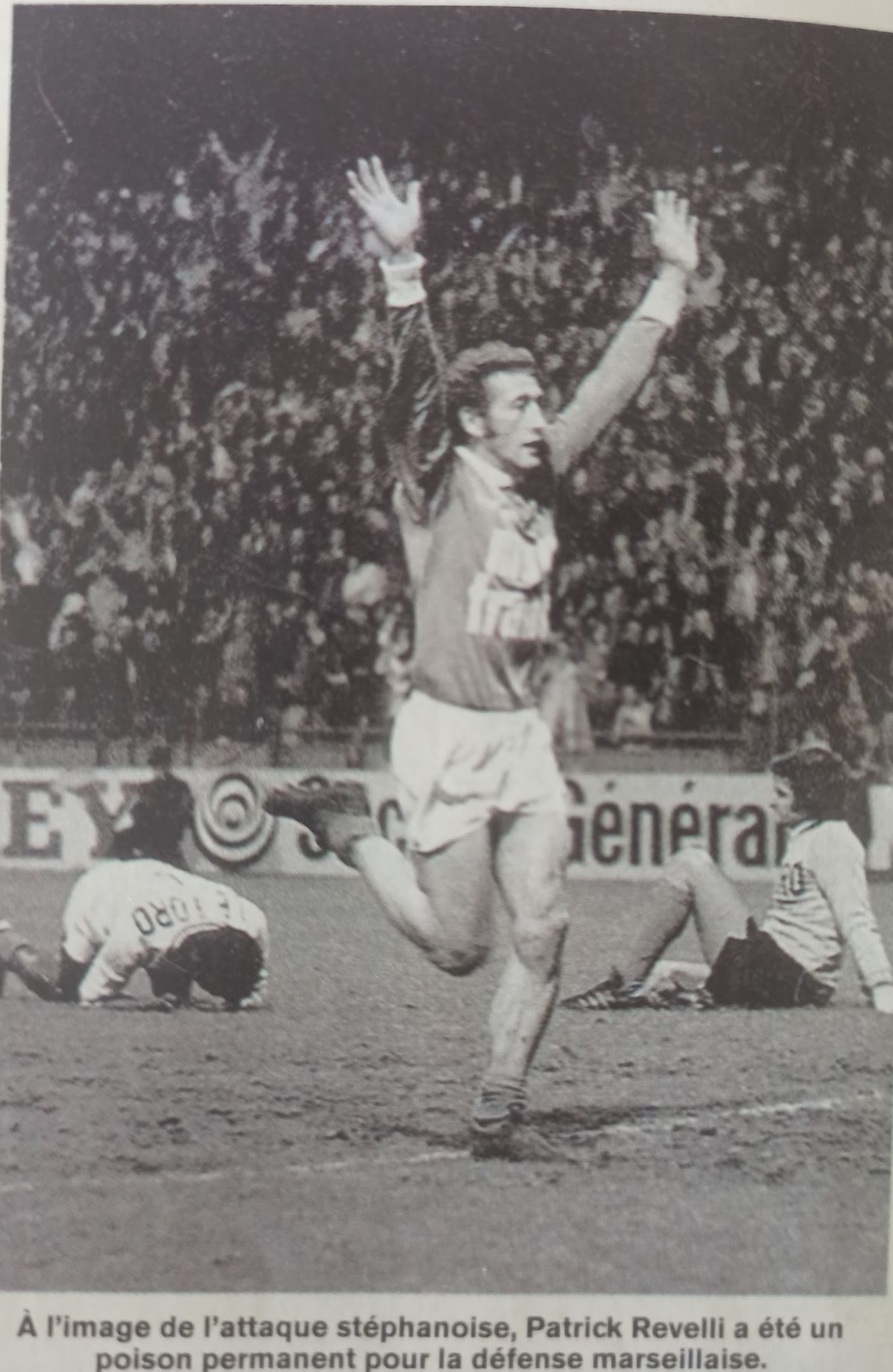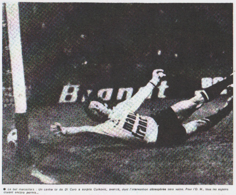 UN EXPLOIT DE DI CARO Pourtant, cette brave équipe olympienne va réussir malgré la tourmente, à combler son retard. Et cette égalisation, c'est Di Caro qui l'arrache, grâce à un bel exploit personnel. Servi par Gress, sur l'aile gauche, Ange s'apprête déjà à centrer, quand il voit Curkovic se placer précisément au milieu de sa cage. Le gardien stéphanois a-t-il commis une petite erreur d'appréciation en laissant une ouverture ? Toujours est-il que Di Caro voit la droite de sa cage dégarnie. Il tir très intelligemment du gauche et prend Curkovic complètement contre-pied (40e minute). Ouf l'O.M. peut respirer en regagnant les vestiaires. LARQUE REDONNE L'AVANTAGE. À la reprise, Repellini prend la place de Mercadier et devient le garde du corps de Keita. À ce propos, vous avez sans doute remarqué qui ne fut guère question de Salif, ni de Magnusson lors de la première période. C'est que les défenseurs stéphanois ne leur ont pas laissé beaucoup d'initiative. Les deux vedettes étrangères n'ont guère plus de chance en ce début de deuxième mi-temps, d'autant que l'arbitre ne leur fait pas la moindre concession. Cependant, les événements vont encore se précipiter sur une offensive des avants stéphanois. Carnus a d'abord un extraordinaire réflexe sur le tir lointain de Larqué, dévié au passage par l'un de ses défenseurs, mais la balle revient dans les pieds de Piazza qui remet aussitôt sur Larqué, dont la reprise fulgurante ne laisse cette fois aucune chance au gardien marseillais. Saint-Étienne reprend donc l'avantage à la 55e minute. Magnusson est ensuite touché au visage dans un choc avec un défenseur adverse. Il laisse son poste à Franceschetti (63me minute) et Bonnel, pour une faute anodine reçoit à son tour un avertissement de l'arbitre. Décidément, ce n'est pas encore la soirée de l'O.M. Pour ne pas changer ! Les minutes tournent, tournent et on arrive dans le dernier quart d'heure avec toujours un petit but d'avance pour Saint-Étienne. L'O.M. se multiplie pour au moins enlever l'égalisation, mais rien n'y fait. Jean FERRARA |