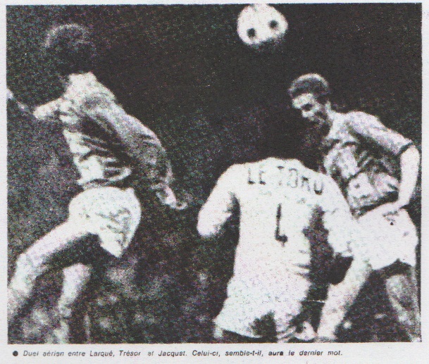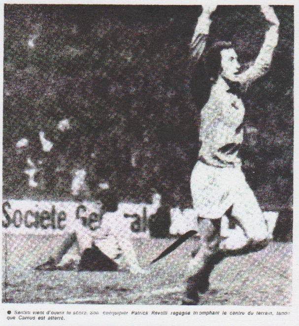 joueurs aussi font des fautes. Mais on avait constaté une fois de plus combien le football est une science curieuse. Les deux buts marqués au cours de cette première mi-temps furent si l'on ose dire, l'oeuvre de deux des footballeurs les plus réputés parmi ceux présents sur le terrain : Trésor et Curkovic. Le loupé de Trésor sur le but marqué par Santini fut tellement franc, tellement inhabituelle de la part du pivot de l'équipe de France, que le brave Marius faillit manger l'herbe de la pelouse de désespoir. On avait noté aussi, toujours au cours de cette première mi-temps, que le tandem Bosquier-Trésor ne tournait pas très rond. Du haut de notre tribune on pouvait se demander lequel des deux était chargé de marquer Patrick Revelli, celui-ci heureusement peu dangereux. Curkovic, considéré comme le meilleur gardien jouant en France, commis une énorme faute de placement dont Di Caro sut profiter très habilement. C'est toujours une erreur, pour un gardien, que de ne pas tenir compte de la position du ballon pour jouer trop franchement en interception. Il est vrai que Curkovic n'avait pas encore pratiquement touché le ballon, ce qui explique mais n'excuse pas sa négligence.