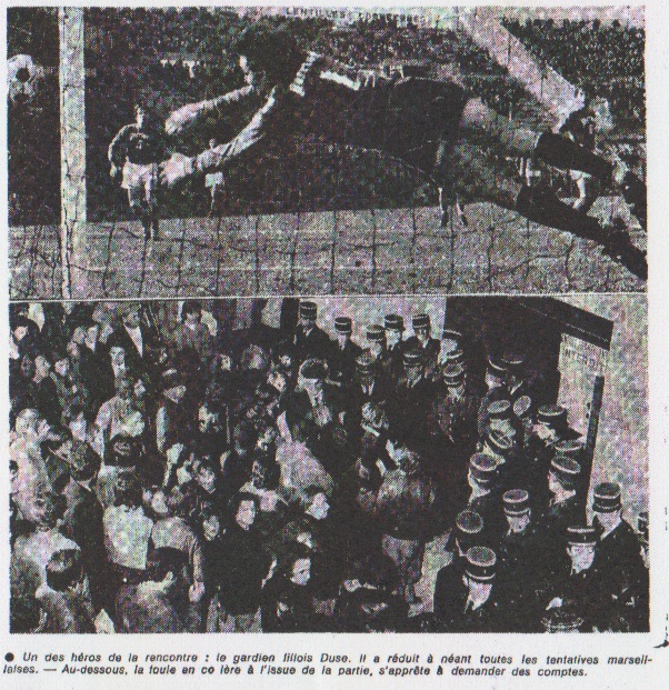 En dépit d'un ciel bleu très pur, un temps très printanier, le premier match O.M. - Lille des huitièmes de finale de Coupe n'a attiré qu'une quinzaine de milliers de spectateurs. Lille aligne Duse, Vermeullin, Deschodt, Mujica, Iche, Fouilloux, Prieto, Verhoeve, Levavasseur, Noguès, de Martigny. Et Marseille fait confiance à Carnus, Bracci, Trésor, Zvunka, Kula, Bonnel, Gress, Magnusson, Keita, Leclercq, Di Caro. Après quelques minutes d'observation, Leclercq (4me minute), déclenche les hostilités en shootant au-dessus de la transversale. Sur un centre de Leclercq, Keita reprend de volée mais en dehors de l'encadrement des bois. Un coup franc de Levavasseur n'inquiète pas Carnus (9me minute). On joue au petit trot de part et d'autre. Trésor brusquement dégage en catastrophe et coûte un corner aux Olympiens qui, heureusement, n'est pas exploité par leurs adversaires. Di Caro se met en relief, en débordant la défense nordiste mais son action se termine mal. Sur un corner de Leclercq (15e minute), Bonnel surgit, fait un heading qui donne chaud au gardien du Duse. Et à la 19me minute, c'est la surprise : Noguès subtilise la balle à Trésor et envoie la balle dans la cage de Carnus qui paraît médusé. Lille : 1 - O.M. : 0. Le public murmure. L'O.M. recherche l'égalisation. Di Caro botte au-dessus la transversale ; Lille, bien groupé en défense, prend confiance dans ses propres moyens ; Levavasseur s'échappe, il est stoppé in extremis par Trésor et Zvunka (30me minute). Lille mène le jeu à sa guise, mais Bracci obtient un corner, tiré par Leclercq et repoussé des deux mains par Duse (35me minute). Keita donne à Gress qui tout seul, hésite et se fait souffler le cuir par Duse, sorti courageusement (40me minute). L'O.M. engage la deuxième mi-temps avec l'intention de se racheter ; Leclercq tire en dehors de la cage (49me minute), Keita enlève trop sa balle qui part dans les nuages. De Martigny, qui a une grosse activité, riposte. Novi s'apprête à rentrer. Qui va sortir ? Les joueurs se regardent, finalement Gress quitte le terrain, il à un geste de dépit, le public le siffle (60me minute), puis l'applaudit et réclame la démission de M. Gallian. Phase confuse devant les bois de Duse qui s'en sort ! Duse doit arrêter un shoot de Di Caro (70me minute), concède un nouveau corner, mais le score demeure inchangé. Levavasseur se trouve seul devant Carnus, il le dribble, le gardien lui retient la jambe, arbitre ne siffle pas penalty (73me minute). Sur un corner, se produit une phase confuse devant le gardien lillois, Duse demeure inanimée après un choc avec Keita (88me minute). Quelques instants après, Duse reprend sa place. Et la partie se termine sur la victoire de Lille par 1 but à 0 ! Alain DELCROIX |