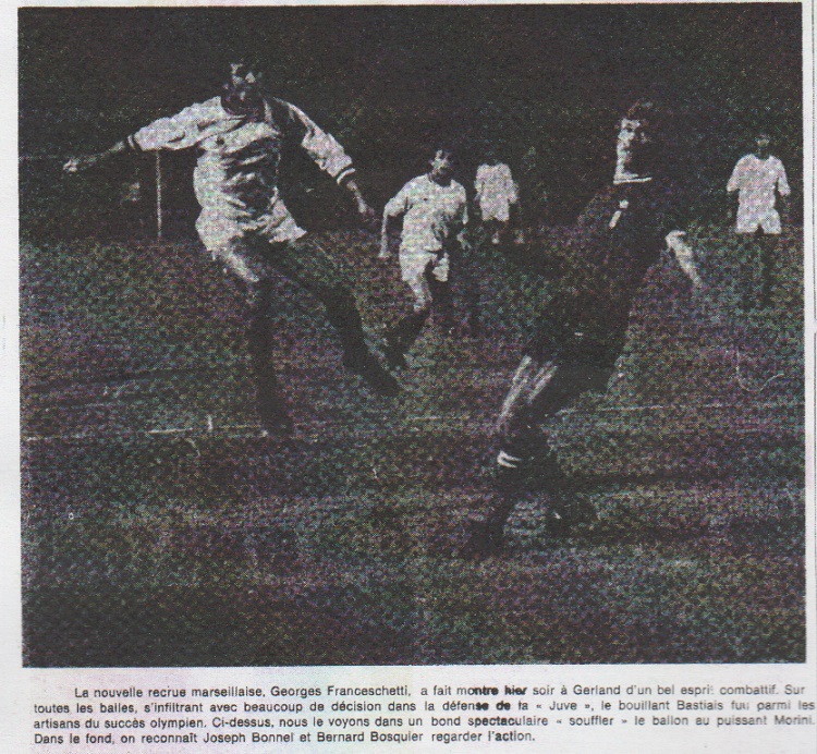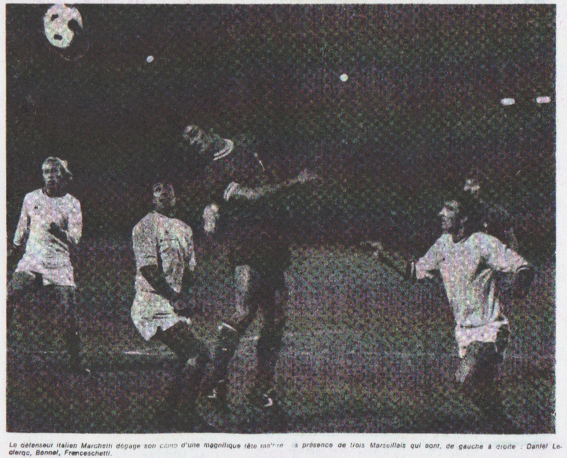En fin de rencontre, un de ses tirs de loin, de son fameux pied gauche, fit sensation, obligeant le gardien italien Zoff à réussir le seul véritable arrêt de la rencontre. On accordera également une assez grande attention à la performance de Bonnel. Le plus vieux des joueurs sur le terrain se manifesta sur tous les points avec une jeunesse et une vivacité absolument remarquables. Faisant équipe, si l'on n'ose dire, avec l'Italien Capello, il prit souvent le dessus sur son adversaire en défense, tout en n'hésitant pas à se porter à la pointe de l'attaque. Troisième olympien ayant joué au-dessus du lot fut Bosquier. Dans son rôle de libéro, il se montra absolument exemplaire. Mais répétons-le qu'une fois encore, aucun des olympiens présents ce soir à Lyon ne mérite la moindre critique.