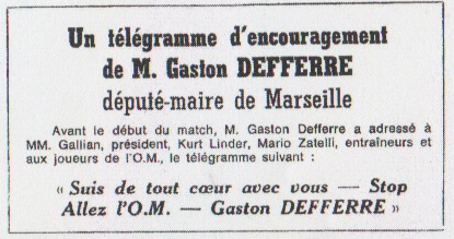 "Les 20 premières minutes nous ont été fatales. Nous n'avons jamais pu récupérer de ce premier but inscrit dans les quatre premières minutes, mais vous voyez, je ne suis déçu ; les Italiens ont été très bons en début de match : ensuite, nous avons montré, quand même, que nous étions des interlocuteurs valables. J'ai été impressionné par cette extraordinaire défense." Que pensait maintenant l'entraîneur Kurt Linder : "Vous comprenez, quand une équipe encaisse un but dès la 4me minute sur terrain adverse, il est ses assauts. "Mais enfin, j'accepte le résultat du moment qu'on perd devant un adversaire supérieur. J'ai été quand même un peu déçu de m'apercevoir que le football français et celui de l'O.M. en particulier n'avaient pas encore atteint le niveau international. Et c'est valable aussi pour le public italien. Vous avez vu notamment de la manière qu'il a encouragé ses joueurs. Sur le terrain, la Juventus savait que Skoblar était dangereux. "Ils l'ont marqué de telle façon qu'ils l'ont pratiquement empêché de respirer pendant les 90 minutes. - Et si c'était à refaire, adopteriez-vous la même tactique ? - Je crois, même si nous avions joué à douze, répondit l'entraîneur marseillais, il aurait été impossible de gagner. Les Italiens nous ont donné une leçon". L'opinion des autres joueurs : Kula. - Les Italiens étaient complets dans tous les compartiments de jeu. Di Caro. - Le premier but nous a littéralement coupé les jambes, et puis en attaque, les défenseurs italiens ne nous ont laissé aucun champ libre. Leclercq. - La Juventus a beaucoup mieux attaqué le match que nous avons fait. Kraft. - Il m'a semblé que mes camarades étaient contractés en entrant sur le terrain. Bonnel. - Que voulez-vous que je vous dire ? Que nous avons mal joué ? Tout le monde s'en est aperçu. Comme les qualités de la Juventus ont été de même façon mise en évidence. Le mot de la fin a Mario Zatelli : Les Italiens sont partis à 100 à l'heure, ils nous ont asphyxiés. "Pour espérer réaliser un résultat nul tard, il aurait fallu atteindre la mi-temps par un score de 0 à 0. "Vous l'avez vu, ce ne fut pas le cas. Il reste maintenant à réaliser réagir, car samedi, le championnat de France continue. Et pour nous, à Valenciennes, ce ne sera pas non plus un déplacement facile". Jean FERRARA |