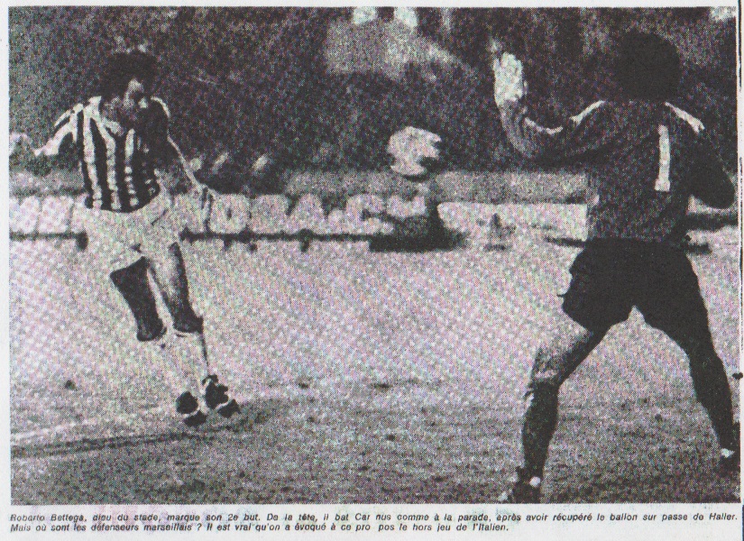 D'entrée, la Juventus montrait nettement ses intentions, se ruait à l'attaque et obtenait deux corners en moins d'une minute devant une défense marseillaise désorientée. À la 4e minute, Gress ayant bousculé Haller, les Italiens obtenaient un coup franc. Le blond joueur allemand le tiré lui-même de la gauche. Bettega s'élevait au-dessus de la mêlée et ouvrait la marque sur un superbe coup de tête. Ca partait vraiment mal pour l'O.M. : la Juventus ayant d'entrée porté un coup terrible à son moral en annulant le léger handicap concédé à Lyon. L'O.M., pressé de toutes parts, parvenait enfin à s'organiser et obtenir deux corners. Les supporters retrouvèrent un peu d'espoir lorsque son adversaire éprouvé le besoin de souffler un peu avant un départ très rapide.