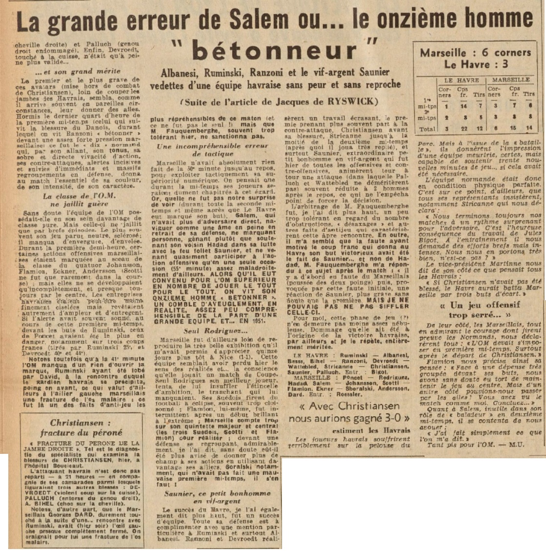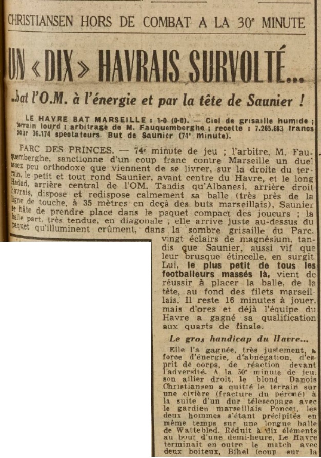 Un but contestable dans sa genèse. Sans que le fait atténue, en quoi que ce soit, les mérites des Normands et les erreurs de l'O.M. convient cependant de souligner que le but réussi par Le Havre à la 73e minute de jeu, est très discutable dans sa genèse. A son origine, se trouve en effet un coup franc qui, dans l'esprit de M. Fauquemberghe devait sanctionner une faute de Haddad sur Saunier. Le Marseillais a-t-il chargé Saunier dans le dos ? A notre sens, c'est bien plutôt ce dernier qui pratiqua, aux dépens, de Haddad, une obstruction punissable. Mais cette mauvaise décision se limitent les excuses qu'on peut faire valoir à la décharge des Olympiens. "La Coupe ne sourit qu'aux trentaine de mètres et de la droite par Albanesi La balle parvint en cloche devant les buts, et les trois Marseillais, Haddad, Scotti, Salem, qui entouraient le petit Saunier, ne purent empêcher celui-ci de sauter et de battre de la tête Poncet. Les mérites du Havre Bien qu'il soit regrettable, aucun doute plane sur la régularité de la victoire normande, il faut convenir que celle ci vient récompenser la magnifique énergie employée par les Havrais qui lutèrent à dix une heure durant. "La Coupe ne sourit qu'aux ardents" écrivions nous samedi. Le Havre ne baissa jamais les bras. De bout en bout, sa défense se montra intraitable. Pourquoi fallut il d'ailleurs que Ruminski se fit une nouvelle fois remarquer par sa brutalité en blessant Georges Gard ? Le portier normand repoussa une shoot - le seul - particulièrement violent d'Andersson à la soixante huitième minute Albanesi et Besse abattirent un travail extraordinaire. Ranzoni - bien secondé par De Vroet - fut l'âme de son équipe L'attaque parut manquer d'efficacité, mais Christianssen (avant sa blessure), Saunier et Stricanne, par leurs montées et leurs dribbles, Palluch par ses percées, créèrent maintes situations dangereuses. Techniquement dominés dans la conduite du jeu, au cours de la première mi-temps surtout les Havrais, soucieux de jouer vite, animés d'un allant magnifique, ont remporté leur victoire sur un coup de dé. Mais ils ont su, aussi, forcer le dessin. |