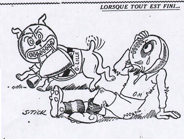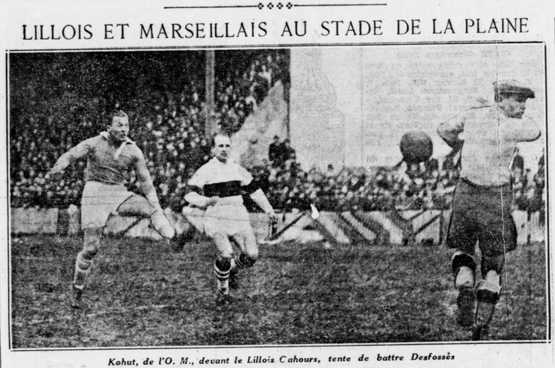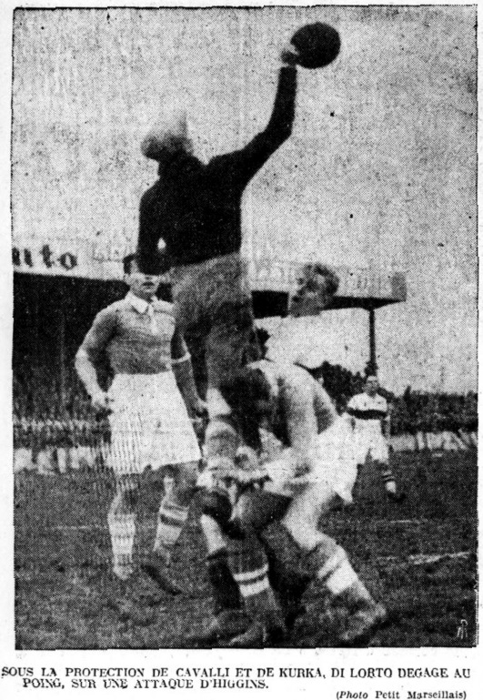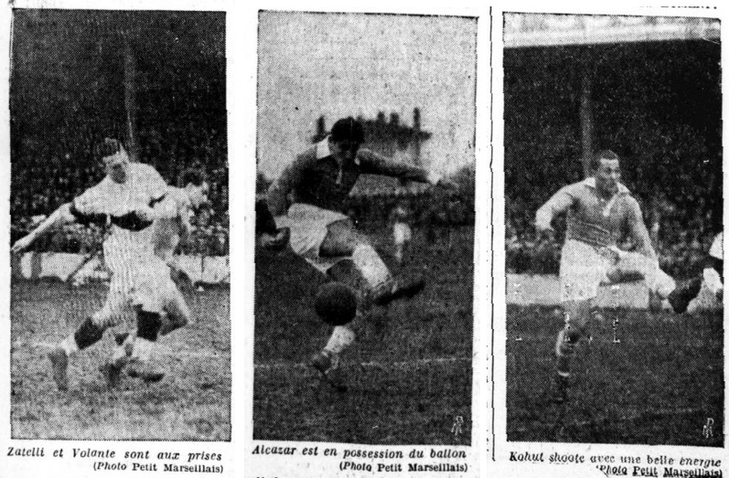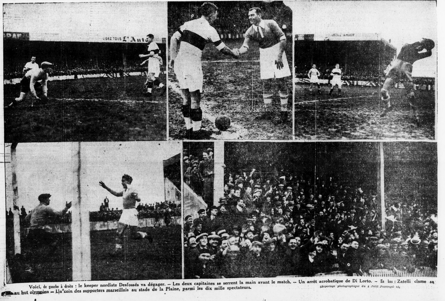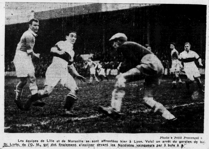 Bruhin, en voulant dégager son camp offre aux Lillois le premier corner de la partie, que Di Lorto stoppera avec autorité, comme d'ailleurs un shoot de 25 mètres de Bigot. Marseille contre attaque. Kohut réceptionne hors jeu. Zermani reprend et marque ; hélas ! M. Conrié avait aperçu la faute et le but n'est pas valable. Un coup franc en faveur des Marseillais n'est pas sifflé contre Beaucourt, alors que Zermani s'apprêtait à effectuer un joli centre. Kohut réussira le sien que Desfossés bien placé arrête. DEUX OCCASIONS DE PERDUES Attaque des Lillois, sans grand danger. Di Lorto arrête, à la suite d'une série de "heading" des Lillois. La balle voyage d'un camp à l'autre. Les Marseillais jouent avec autorité. Service de Roviglione qui permet à Kohut de passer Cahours et Vandooren. Il sert Alcazar qui manque la réception et une belle occasion de marquer. Sur le renvoi, les Lillois contre attaquent. Bigot et Delannoy deviennent dangereux, mais la sûreté de Di Lorto ne permet rien attaquants nordistes. Alcazar manque une nouvelle fois sur service de Kohut. Zatelli et Roviglione secondés de brillante façon par un Durand très en verve, alertent sérieusement le tandem nordiste. Les attaques de Marseille sont beaucoup plus incisives que celles de Lille. Une mésentente entre Cavalli et Bruhin, permet à Higgings de foncer seul et il faut toute la vigilance de Di Lorto pour éviter le but. Un shoot de Cahours donne le frisson aux supporters marseillais. Di Lorto est remarquable de brio, particulièrement sur un shoot plongeant de Decottignies. Belle contre attaque par Kohut, terminée par un heading de Roviglione. Les Lillois sont pleins d'allant, Decottignies prend de vitesse Cavalli se rapproche des buts et centre. Di Lorto plonge trop précipitamment - C'est le but - Non. Kurka réceptionne sur la ligne de but mais ne peut empêcher Delannoy survenu au dernier moment, de placer la balle dans les filets. Service de Durand qui provoque une algarade devant les buts lillois. Desfossés sort, bloque la balle et Zermani le plaque et marque. M. Conrié siffle coup franc pour charge irrégulière, C'est à notre avis un peu osé. Le repos survient sur le score de un but à zéro en faveur des Lillois. APRES LE REPOS Dès la remise en jeu, Marseille attaque un shoot, de Kohut surprend Desfossés qui peut cependant se dégager en corner. L'olympique domine. Durand et Bastien font un énorme travail. Départ en force de Zermani qui passe à Zatelli, lequel s'entête à vouloir placer la balle alors que Kohut est entièrement démarque. Faute grave qui prive les Marseillais d'un résultat possible. MARSEILLE DOMINE Entente Kohut-Zatelli, ce dernier malgré Vandooren, tire au but et manque de peu. Quelques minutes seulement se sont écoulées, que Kohut, de 25 mètres, bat Desfossés de splendide façon. Marseille : 1 ; Lille : 1 La foule et surtout les supporters Olympiens applaudissent à tout rompre. Les drapeaux blancs se déploient. Le public est en pleine effervescence. Les Olympiens reprennent courage, les Marseillais dominent maintenant de façon manifeste. Les nordistes ont de la peine à enrayer les offensives adverses. LES MARSEILLAIS JOUENT DE MALHEUR Alcazar place un bolide légèrement au-dessus, alors que Roviglione, de vingt cinq mètre réussit un shoot qui frappe la transversale alors que le keeper était battu. Mais voila une offensive lilloise. Decottignies déborde Cavalli, shoote en coin et malgré le plongeon de Di Lorto, Lille obtient un deuxième but. Il reste quinze minutes à jouer. Malgré ce handicap, Marseille donne à fond. Un shoot de Zatelli est arrêté par Desfossés. Kohut passe à nouveau inter et Kurka se joint à l'attaque. LILLE S'IMPOSE Attaque lilloise, Delannoy passe à Bigot, Bastien et Cavalli laissent Decottignies entièrement démarqué aussi le centre avant lillois, d'un revers, passe à son extrême droit qui n'a aucune peine à battre Di Lorto. Marseille : 1 ; Lille : 3 A la remise en jeu. Durand revenu de loin boucle "in extremis" le jeune Bigot alors qu'il était seul devant les buts. Malgré leurs efforts, les Olympiens marseillais ne peuvent remonter le handicap de deux buts et la fin survint sur la victoire des Lillois, alors que la pluie fait son apparition. |