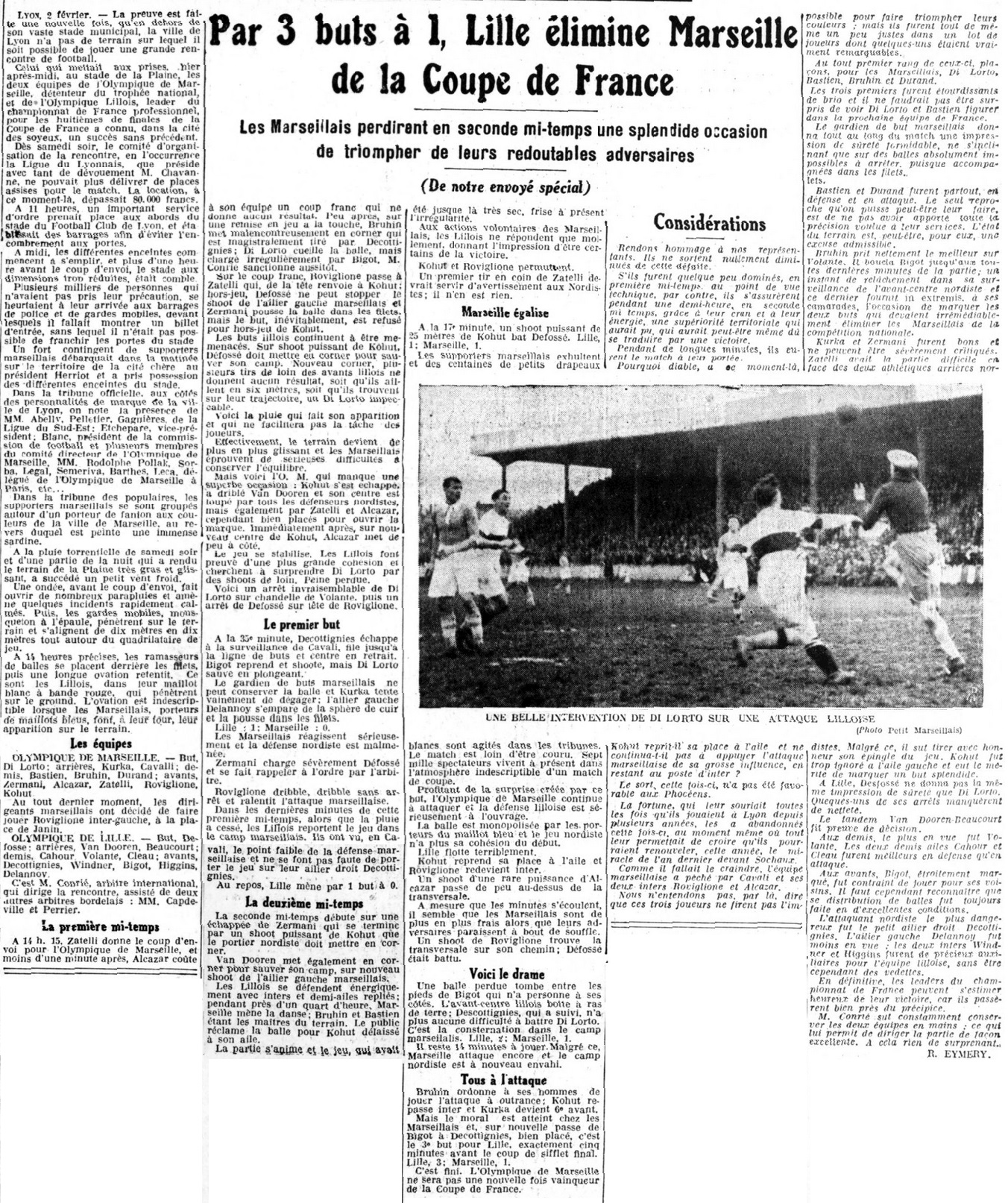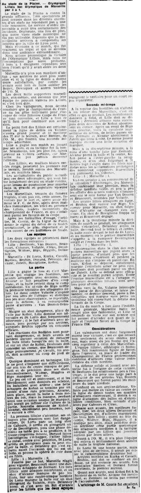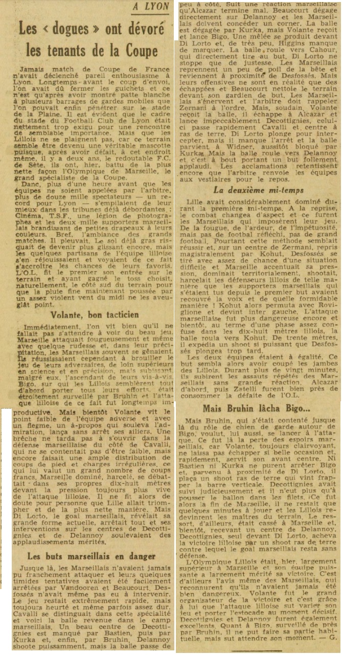 (De notre envoyé spécial) ------------------- Lyon, 2 Février. Lyon comme à l'ordinaire s'est éveillé ce matin sous un ciel grisaille hivernale, les nuages sont bas, l'air plutôt frais, aussi les conditions atmosphériques ne sont-elles pas très rassurantes. Hier selon la coutume du moment, il a plu ; en sera-t-il de même aujourd'hui ? C'est peu probable. Peu importe, les gônes sont tout heureux à la pensée que dans quelques heures, il leur sera possible d'assister à un match aussi important, le plus important de la journée. Le Nord contre le Sud-Est est en effet un évènement sensationnel, d'autant que les deux équipes sont les meilleures de leur régions respective. Lille, leader actuel du championnat professionnel, redoutable par son quintette, cherche sa consécration en Coupe. Marseille compte de son coté un succès inattendu sur la belle formation sétoise et de plus est l'une des équipes s'adaptant e mieux à la formule de Coupe. C'est donc à un match très serré que les lyonnais assisteront. Qui triomphera ? les deux équipes se valent, quoi que les Nordiste partent légèrement favoris ; le terrain sera-t-il un handicap pou les Phocéens ? Cette incertitude qui fait le charme de ma Couple plane certainement dans tous les coeurs de sportifs et accroît l'intérêt du choc Lille-Marseille. VERS LE STADE DE LA PLAINE Il n'est que 13h20, lorsque nous parvenons au stade lointain de la Plaine et déjà on se plait à répéter sans crainte d'être démenti que les records d'affluence seront battus, est-ce possible. Malgré le mauvais temps de ces derniers jours la pelouse n'a pas énormément souffert, le sol est gras, les lignes qui délimitent la surface de jeu ont tout leur éclat, les tribunes sont déjà au complet. La pelouse er les populaires grouillent aussi d'un public impatient. Ou vont donc se placer tous ceux qui ne veulent ou qui ne peuvent arriver un quart d'heure avant le coup d'envoi ? Que va t-il advenir de cette cohue de cars, taxis, et voitures particulières ? Par groupe, par files même, les gens arrivent sans cesse... C'est le succès, c'est un beau jour de fête pour la balle ronde. Parmi des milliers de sportifs anxieux de voir les deux équipes aux prises, il y à une ambiance extraordinaire faite de joie et de nervosité. "Alors Marseille ou Lille ?" Vous entendez cette question un peu partout. Il y a aussi la réponse immédiate des partisans de l'un ou l'autre club. Le Marseillais venus nombreux par le train spécial font preuve d'une grande exubérance et leur tempérament fait de galéjades, de cette jovialité et de cette chaleur propres aux méridionaux se donne libre cours ; ils ont foi en leur équipe et soutiennent ardemment la discussion avec les partisans des Lillois tout aussi nombreux. On crie, on applaudit, les nerfs se tendent, l'atmosphère s'électrise ; la Coupe, la plus belle et vigoureuse compétition nationale confirme une fois de plus sa puissance d'attrait auprès du public. Le Stade est comble, les photographes et les cinéastes ont pris place sur la pelouse. L'heure avance voici les joueurs de Marseille qui pénètrent sur le ground. Bruhin en tête, suivis peu après des Lillois très applaudis. Un instant encore, M. Conrie, arbitre du match, siffle, les équipes se placent, la bataille est engagée. Les équipes OLYMPIQUE DE MARSEILLE But : Di Lorto Arrières : Kurka, Cavalli Demis : Bastien, Bruhin, Durand Avants : Zermani, Alcazar, Zatelli, Roviglione, Kohut. OLYMPIQUE DE LILLE But : Desfossés Arrières : Vandooren, Beaucourt Demis : Cahours, Volante, Cléau Avants : Decottignies, Windner, Higgins, Delannoy. MM Capdeville et Perrier officient en qualité de juges de touches. La partie Comme nous l'indiquions plus haut, la partie va se dérouler à guichets fermés, de très nombreux spectateurs ne pouvant avoir accès sur le stade. D'ailleurs pour y parvenir, i faut franchir plusieurs barrages de gendarmes. Marseille donne le coup d'envoi. Alcazar lance en avant. Volante renvoie, Roviglione sert de nouveau Pepito mais il est crédité d'un coup franc. |
