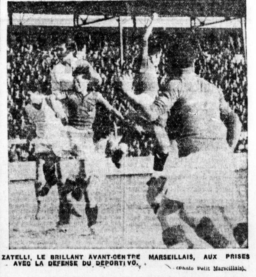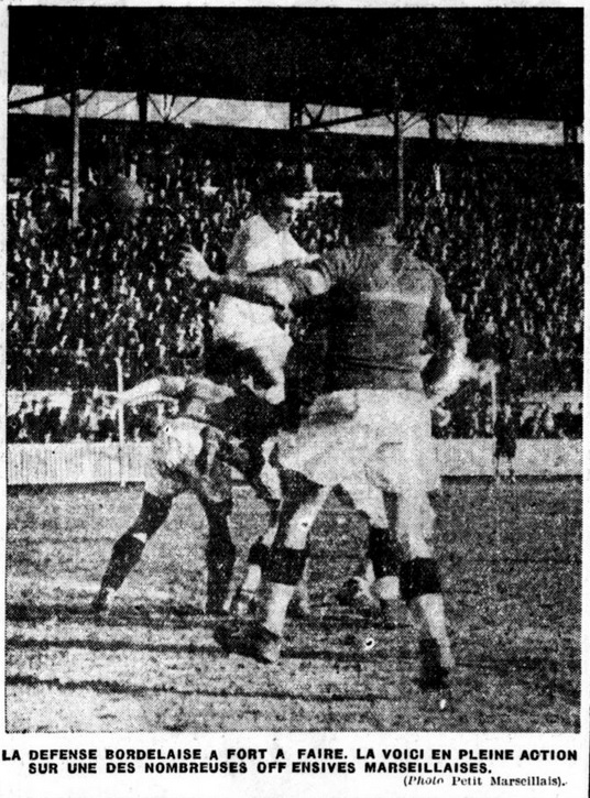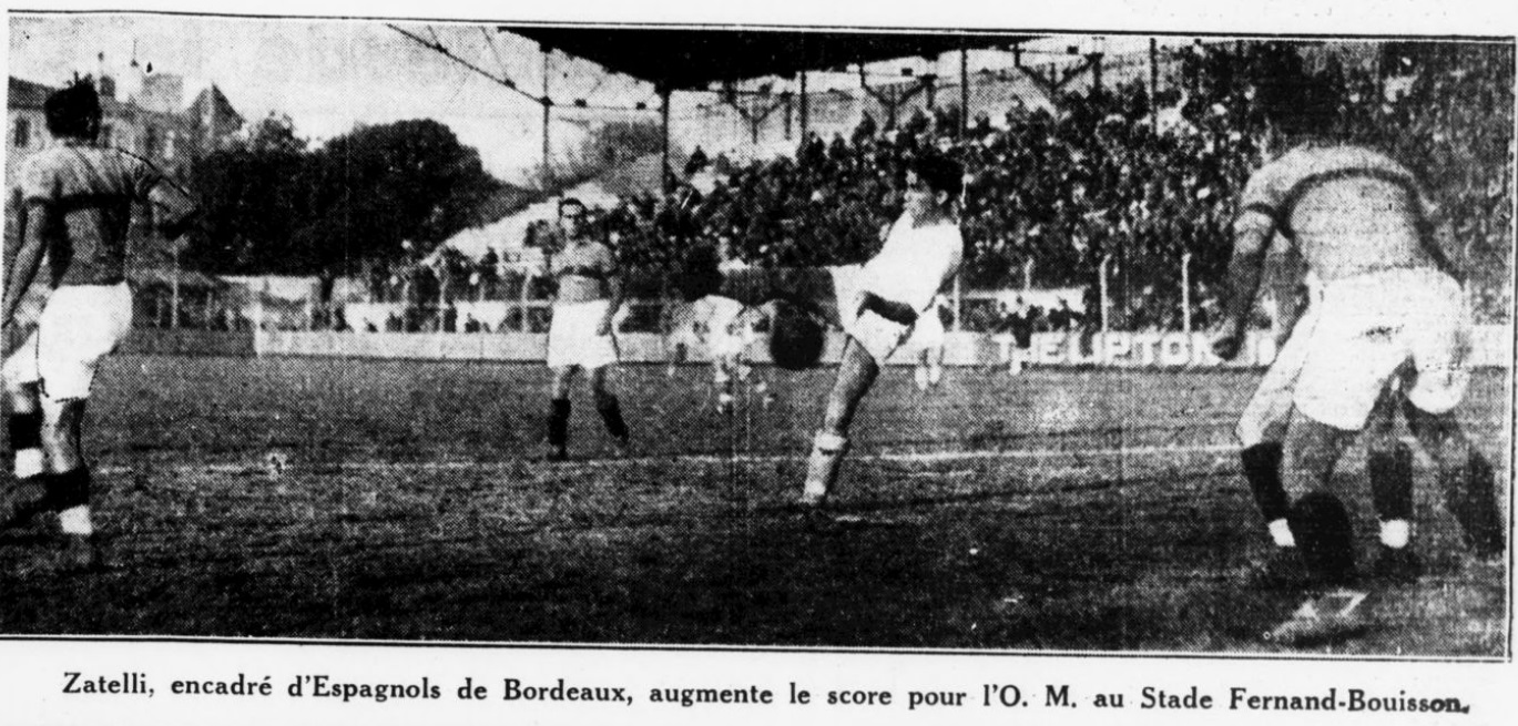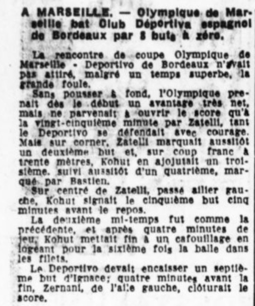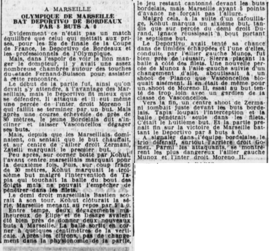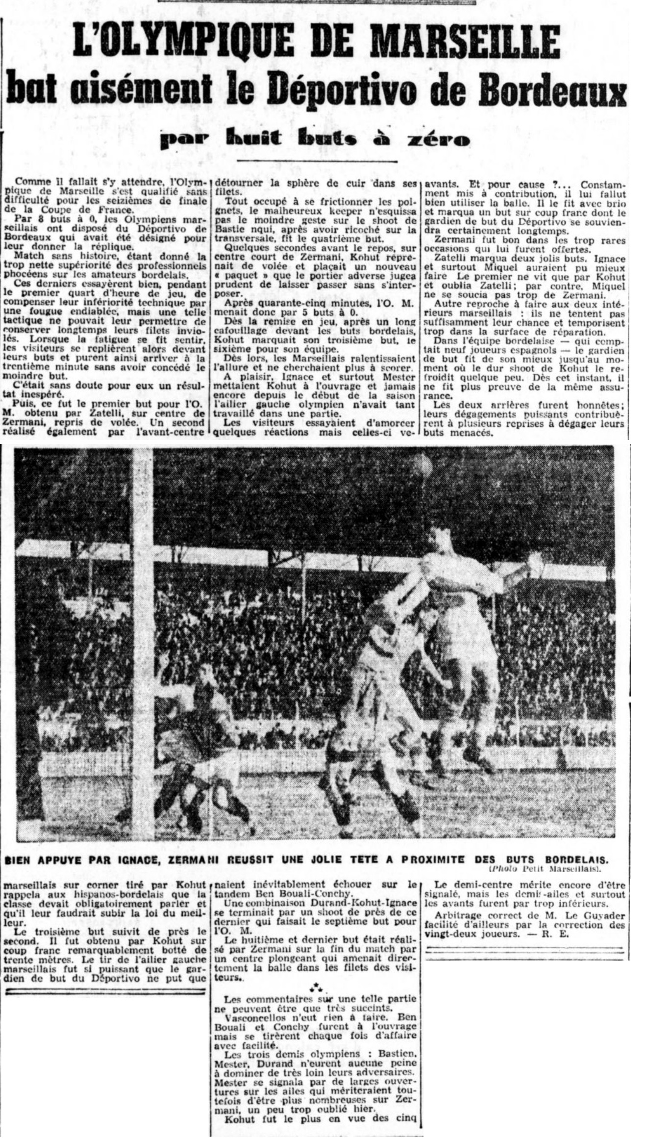 Olympique de Marseille bat le C.D. Espagnol de Bordeaux par 8 à 0 L'O.M. faisait hier, son entrée en Coupe de France. Une affluence assez nombreuse garnissait les touches du stade Fernand Bouisson pour assister à ce match de début. Au coup d'envoi, les équipes se présentent dans les formations annoncées. Dès le début l'O.M. prit la direction du jeu, les Espagnols de Bordeaux, ne sifflet final. Le résultat du match ne faisait aucun doute pour personne et le score de 8 buts à 0 en faveur des Marseillais reflète bien la physionomie de la partie. Dominés dans tous les compartiments du jeu, les Espagnols de Bordeaux ne durent qu'à leur défense de ne pas subir une défaite plus sévère. Constamment sur les boulets, les arrières visiteurs et le goal en particulier firent montre de courage devant les pressantes attaques des forwards olympiens. Battus à cinq reprises au cours du premier half, les visiteurs ne se découragèrent pas, et ne fermèrent jamais le jeu, ce dont il faut les féliciter. Ils eurent bien à leur actif quelques réactions, mais la paire H. Conchy, Ben Bouali était intraitable. Le onze olympien a eu le match bien trop facile pour qu'il soit tenu compte de la performance de tel ou tel joueur. Maîtres du terrain pendant 90 minutes, les Marseillais évoluèrent à leur aise se permettant même quelques fantaisies. Seul Kohut qui eut fort à faire pour se dégager de la surveillance dont il était l'objet, est à signaler. Battu, le Deportivo ne sort nullement diminué de la rencontre à la victoire de laquelle les locaux n'acquirent pas une gloire particulière. Donc l'O.M. a passé avec succès le cap des 32e de finale. Que nous réservera le prochain tour ? Le jeu de l'élimination a sévi dans toutes les rencontres et certainement le morceau sera plus dur la prochaine fois. La formation présentée par l'O.M. quoiqu'on ne puisse trop épiloguer sur ce match facile, parut satisfaisante avec ses trois étrangers dont deux, Vasconcellos et Kohut sont indiscutables et le troisième Mester qui fit preuve d'assez d'aisance, mérite d'être revu dans un match plus équilibré avant qu'il soit possible de le préférer à Bruhin, qui a lui, depuis longtemps fait ses preuves. LES BUTS Après demi-heure de jeu passée dans les dix huit mètres visiteurs, Zatelli reprend un centre de Zermani et ouvre le score O.M. : 1 ; D. Bordeaux : 0 Dix minutes après, le même Zatelli marque de nouveau d'un bel heading à la suite d'un corner tiré par Kohut. O.M. 2. Un coup franc permet après à Kohut d'inscrire un nouveau but. O.M. 3. Bastien score à son tour en shootant dans sa foulée et Kohut, une minute avant la pose, porte à cinq buts le score en faveur des Marseillais. Avantage copieusement au tableau, les locaux ralentissent sensiblement l'allure tout en conservant l'avantage territorial. Kohut continue la série en marquant le sixième but après une phase construit devant les buts visiteurs. Peu après Ignace aggrave la marque alors que Zermani, malheureux jusque là par ses essais au but, clôture la série en inscrivant fort élégamment le huitième but. Arbitre satisfaisant |