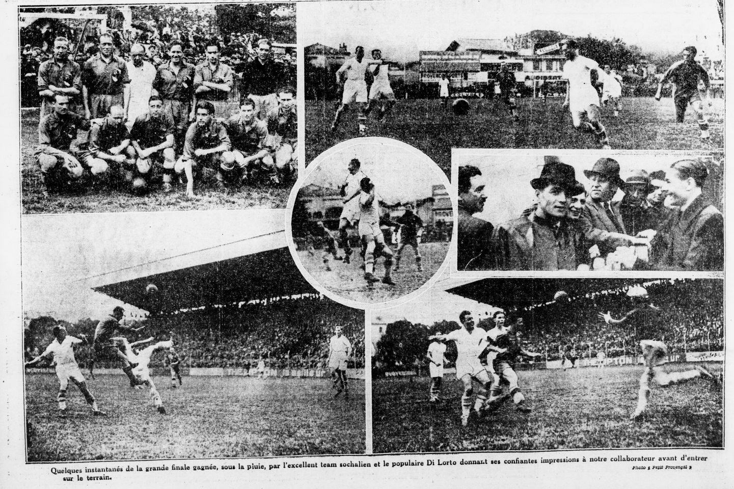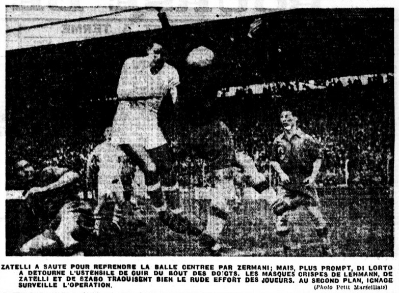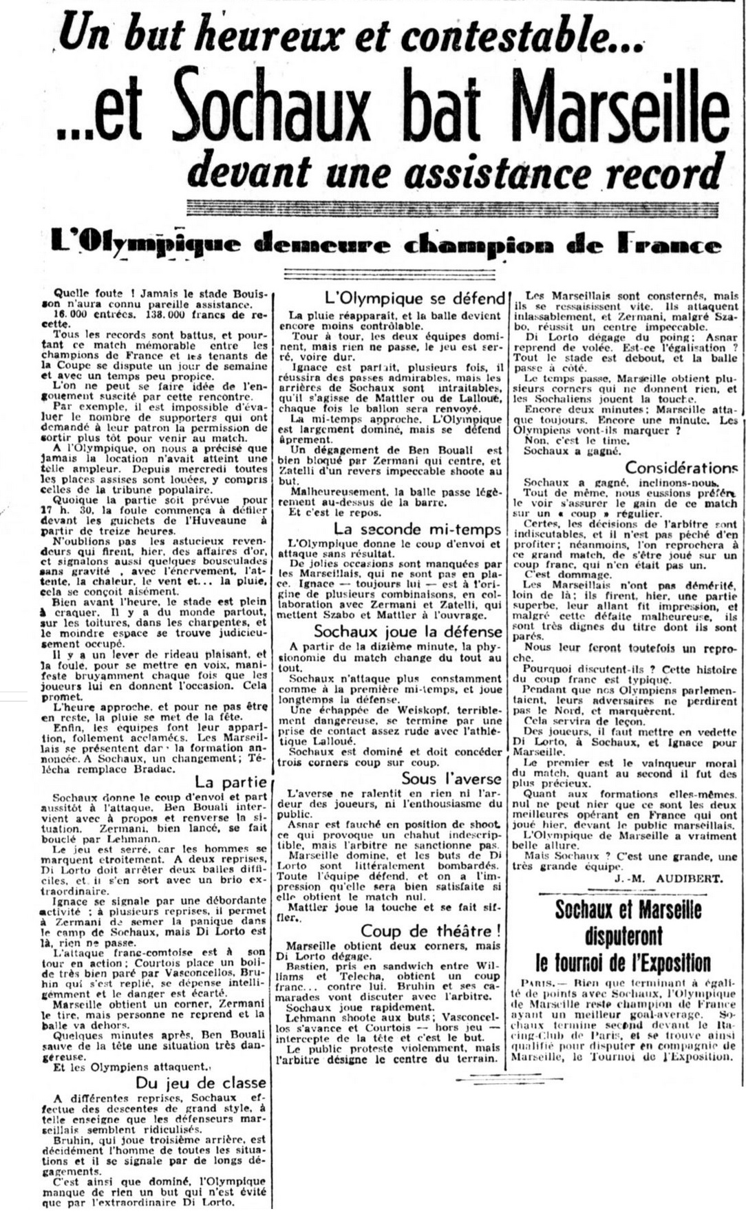 C'était dimanche, hier au stade Fernand Bouisson, c'était même plus qu'un dimanche car l'ambiance des grands jours fut dépassée au-delà de toutes les prévisions. On savait certes que l'Olympique de Marseille possédait déjà son titre de champion de France de par le nombre de ses victoires incontestable. Mais on connaissait également la valeur du Football club de Sochaux qui détenteur de la Coupe de France, voulait obtenir la seconde place du Championnat professionnel qu'enviait aussi le fameux Racing-Club de Paris, classé seulement à un point des Sochaliens. Cette seconde place comportant la participation avec l'O.M. au futur Tournoi de l'Exposition Internationale en compagnie de Chelsea, Bologne, Slavia enfin les meilleurs "onze" d'Europe. D'autre part les Doubistes que nous avons eu l'occasion d'interviewer avant le mach de nous cachaient pas que l'acte final du Championnat se terminerait pour eux en une réelle apothéose s'ils battaient l'O.M. Pensez donc, les tenants de la Coupe 1937, vainqueurs des champions de France. Dans un coin, Di Lorto, modeste comme nous le connaissons, devine notre interrogation ; "Oh ! vous savez un petit match nul arrangerait tout le monde". Et le jeune Martiguais de nous rappeler ce bon public de l'Huveaune qui l'acclama si frénétiquement : "Cela me fait tout de même quelque chose de rejouer sur un terrain en de pareilles circonstances". Notre meilleur gardien de buts français - Di Lorto, jouera dimanche contre l'Irlande - n'est pas étonné de la massive publicité qui s'est faite sur le match de ce jour. Mais il est surpris par l'analogie établie par un de nos littérateurs sportifs avec le combat des Horaces et des Curiaces. Sans entrer dans l'histoire romaine, sous Tullus Hostilius, nous lui expliquons qu'il s'agit seulement d'une question de prééminence. "Panem et Circences". Nous avons les jeux aujourd'hui, mais, aurons-nous du pain demain ? Dès 14 h 30, tous les moyens de transport sont utilisés pour se rendre à l'extrémité du Prado. Bien entendu, tout est loué depuis le matin. Des contestations s'élèveront naturellement pour les places réservées, mais les discussions diminueront à mesure que s'approchera l'heure du grand match. Un supporter acharné ne pouvant s'asseoir, s'écrira à la ronde parodiant le vers de Rostand : "C'est un match qu'il faut voir debout !". Près de nous, les joueurs basques qui tiendront la vedette après demain contre l'O.M., s'installent pour juger du mieux possible le jeu de leurs futurs adversaires. Ils ont battu deux fois le Racing à Paris et espèrent battre l'Olympique à Marseille. Nous verrons. Le ciel noir de nuage ne laisse rien présager de bon. Mais on n'y pense guère et il faudra l'orage peu avant le match pour que ceux qui n'ont pas la change de posséder un ticket en tribune, cherchent vainement à s'abriter et finalement, demeurent stoïques sous la pluie. Heureusement des éclaircies se produisent, permettant aux supporters d'applaudir aux prouesses des juniors de Lambèse, venus donner la réplique à ceux de l'O.M. au lever de rideau. Une grande finale C'était véritablement une grande, une très grande finale qui, malgré le jour de semaine et malgré le temps aussi, avait attiré sur le ground du stade Fernand Bouissons un public qu'on peut évaluer à près de quinze mille personnes, le temps était fort incertain quand M. Vandeputte assistée de MM. Vezolles et Oliva, appela les équipes sur le terrain. Tour à tour Sochaux, en chemisettes or et en culottes bleues, sous la direction de Mattler, puis l'O.M. Toujours en blanc, suivant Bruhin, pénètrent sur le terrain, sous les applaudissements nourris de la foule. La partie Voici la balle au centre et Sochaux engage. La balle, poussée par Abbeglen, va vers le camp local, mais Granier renvoie et le ballon sort en touche. C'est Ignace qui ouvre sur Weiskopf, mais le ballon sort à nouveau et Abbeglen, sur la remise en jeu, s'en empare et en profite pour lancer Lauri : mais Granier surveillait étroitement son homme et une touche met un terme à cet essai. Voici maintenant Zermani, qui part en trombe le long de la touche ; il n'y aura pas de suite à cette action. La pluie tombe fine, rendant glissant le terrain. Teletcha est dépossédé de la balle par Asnar. Jusqu'à présent, Sochaux donne une meilleure impression par sa cohésion et sa précision. L'O.M. joue en retrait. Bruhin renforçant ses backs. Zermani part et centre sur Zatelli qui file sur sa gauche, mais Weiskopf avait quitté son poste, d'où il en résultat un service à Courtois, qui déboule avec puissance et n'est arrêté qu'à vingt mètres des bois par Ben Bouali et Bastien, accourus. Sur le renvoi, c'est au tour de Di Lorto d'intervenir sur un service de Weiskopf à Zatelli, qui, d'un retourné très précis donne au keeper sochalien l'occasion de montrer son brio ; de suite après, c'est Asnar qui shoote sans plus de succès. Le Ballon mieux contrôlé par les visiteurs évolue un temps au centre du terrain ; un shot trop mou à ras de terre est cueilli sans peine par Vasconcellos aux aguets. Jeu au centre à nouveau ; Abbeglen repart à l'attaque, c'est Henri Conchy qui intervient et sur son renvoi, Weiskopf file, mais son tir est gêné et la sphère sort en touche. |