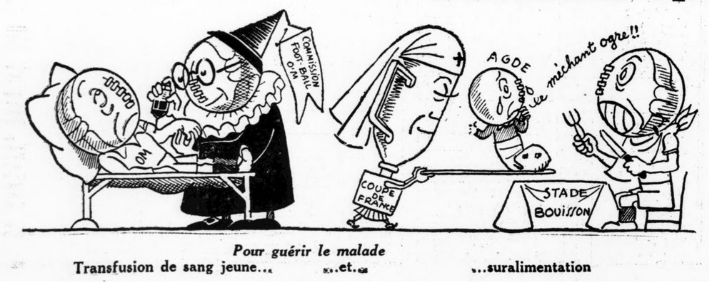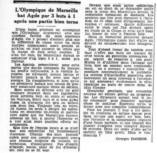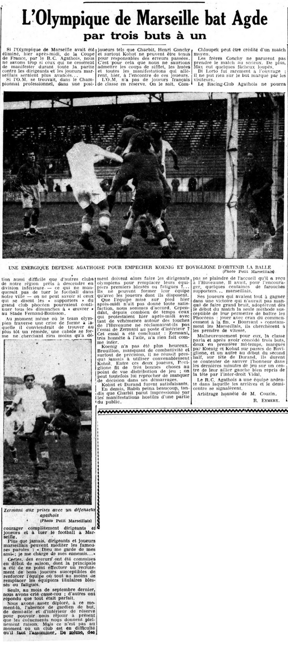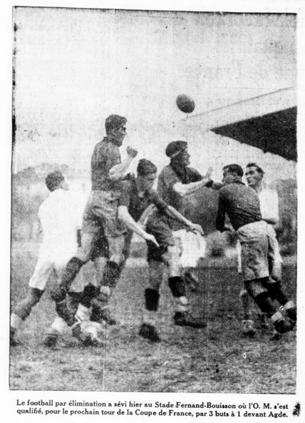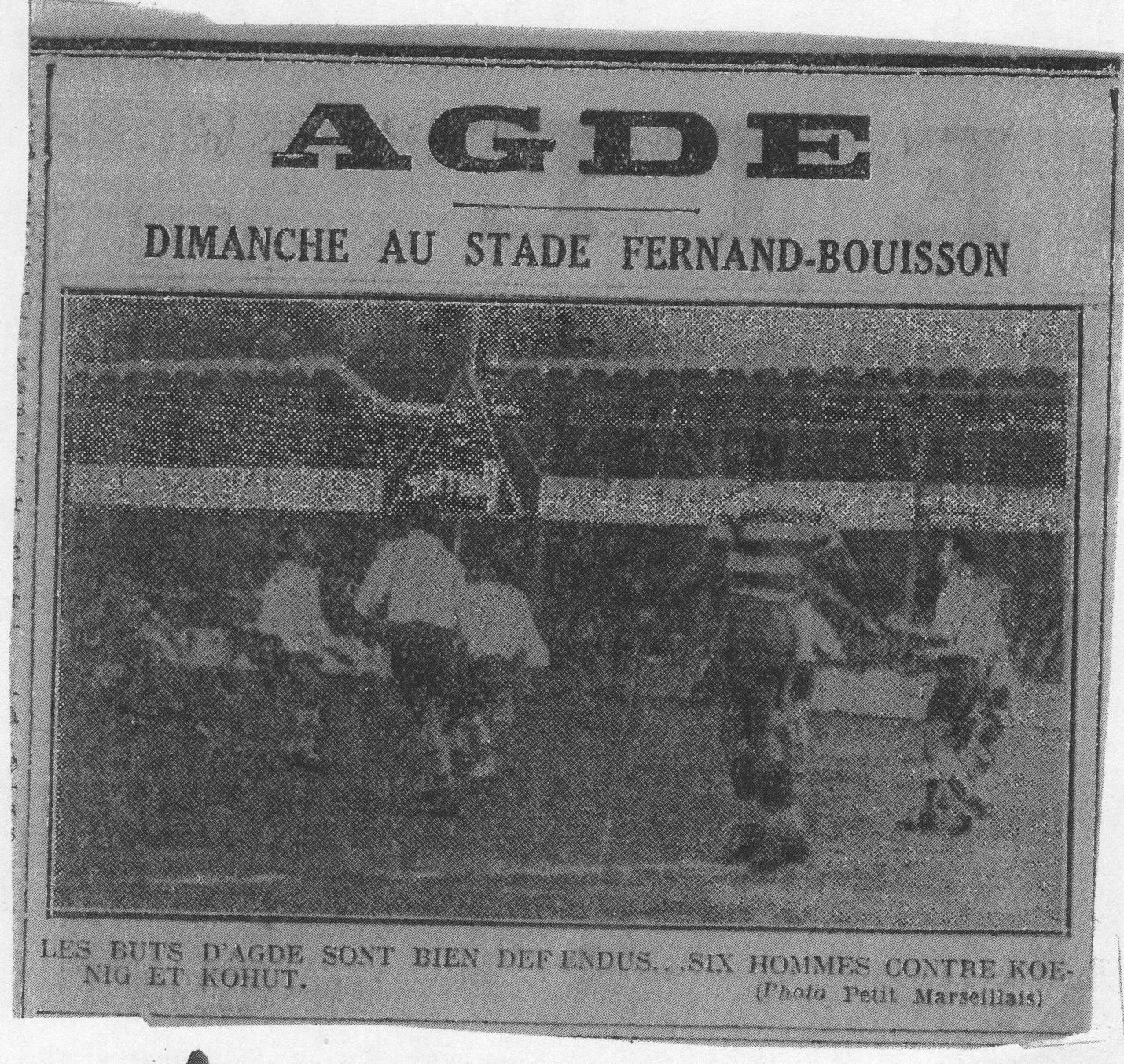 Résumé du journal local "agathois" du 15 décembre 1934 ______________________ Depuis une semaine les " nerfs étaient tendus à bloc" à cause de cet évènement. Le fanion du Racing flottait au siège social à coté d'un immense drapeau tricolore. La veille un grand nombre de supporters fanatiques étaient partis et le matin même le train de nuit avait emporté le reste. Age paraissait désert. Cependant il restait bien quelques personnes qui par dévouement ou pour toute autre raison étaient demeurés mais auraient volontiers donné beaucoup pour être à partir de 13h.45 sur le terrain de l'Huveaune. Il suffisait de les voir nerveuses et préoccupées pour en être persuadé. Où aller ce dimanche ? Au foot bien sur. Les délaissés étaient tous là, une seule idée en tête " qui sait ce qu'ils ont fait et qui sait ce qu'ils font". On s'abordait. Alors ? alors on ne sait rien encore. Enfin la mi temps vint. Un express cycliste dépêché en vitesse rapporta du "Centre" la nouvelle. Marseille 2; Adge 0. On l'afficha à la porte du vestiaire - C'est sérieux ? - Mais oui - Pas possible - C'est merveilleux - ils tiendront. Et l'on attendit la fin du petit match pourtant bien intéressant mais que ne l'on regardait que par distraction pour tuer l'attente et puis on se précipita vers les nouvelles. L'annonce s'était répandue par la ville. Nous avons sauvé l'honneur, nous ne perdons que par 3 à 1, c'est un triomphe. Le match faisait à nos yeux figure d'évènement nationale. Et puis dans le café, en tête des résultats de la journée s'étalèrent : Marseille 3, Adge 1 Les consommateurs, à la dérobée, ou bien béatement, regardaient encore le résultat et sur toutes les figures s'épanouissait la joie de cette "Victoire". D. B. |