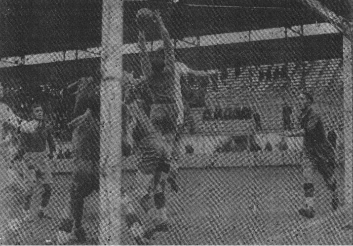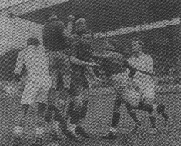 De face, à droite, l'avant centre olympien Roviglione paraît impressionné par la vitalité des amateurs. Bosc va vers le ballon, dévié par la tête de Pujol, le grand demi centre. Gleizes, qui porte son légendaire bandeau, est à la peine, tout comme Castanier. |
