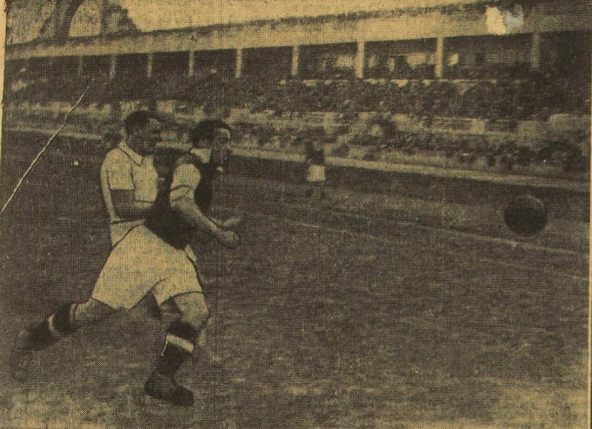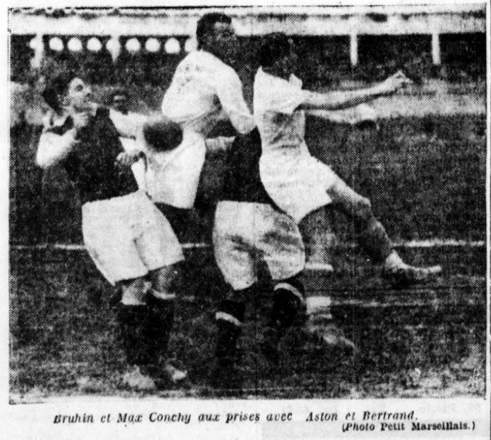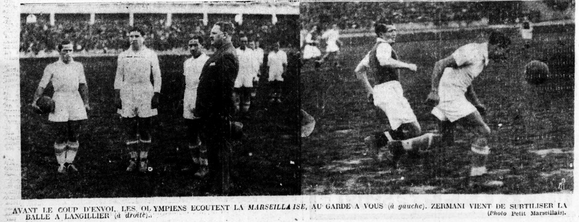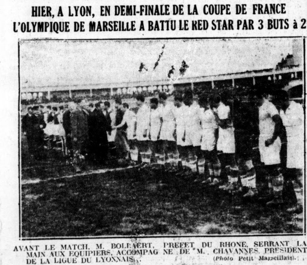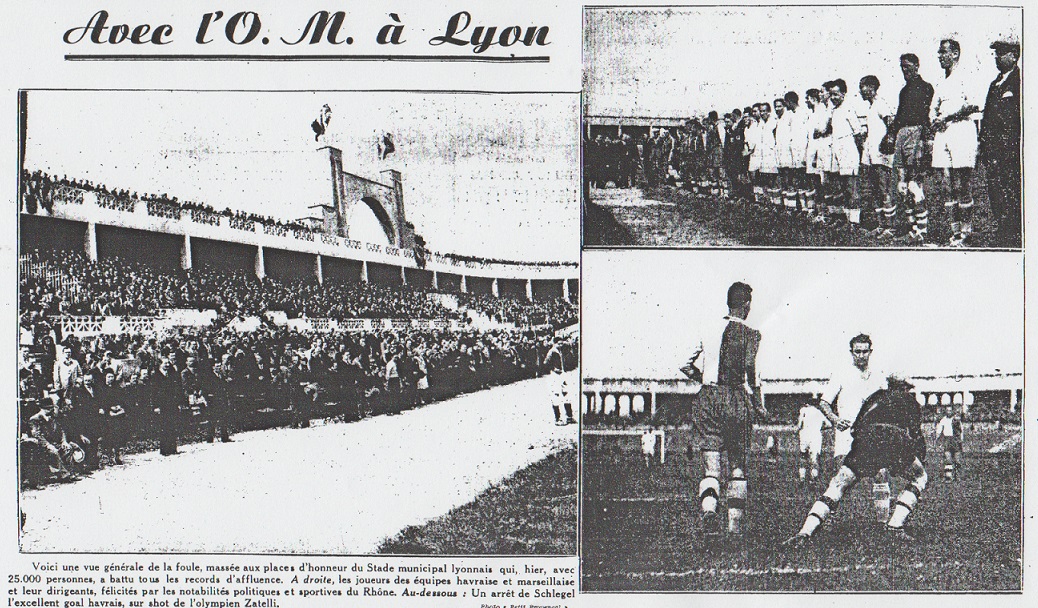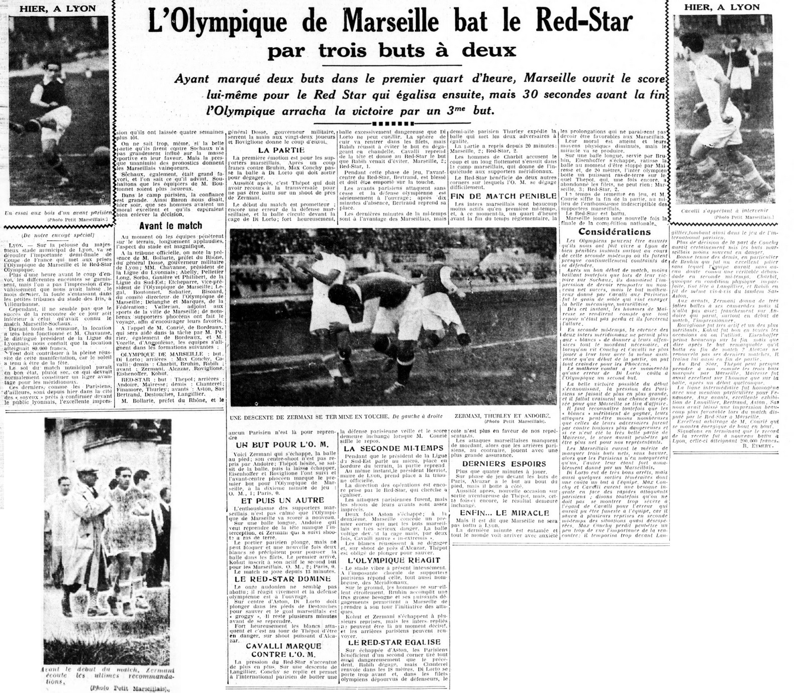 Nous voici enfin dans l'immense stade aménagé spécialement pour cette rencontre ; la pelouse est parfaite, les lignes blanches qui la délimitent et la marquent ont tout leur éclat. Le coup d'oeil est magnifique. Toutes les enceintes sont copieusement garnies d'une foule impatiente ; le succès et complet. Alors Marseille ou Paris ? On entend cette question un peu partout, et aussitôt la réponse des partisans de l'un ou l'autre club. À ce jeu, le Red Star à une légère préférence. Maintenant tout le monde est debout et manifeste par des applaudissements les équipes qui font leur entrée sur le terrain. Avant le match Le Stade Municipal est véritablement grandiose, sa piste de course à pied de 500 m et celle servant aux cyclistes donnent une impression de grandeur comparable seulement à Colombes et au Parc des Princes. En effet, dans les galeries qui ceinturent majestueusement le terrain 35 mille spectateurs peuvent prendre place et suivre aisément la rencontre. À la tribune officielle nous relevons au hasard la présence de M. le préfet du Rhône, le représentant du maire ; Chavannes, président de la Ligue du Lyonnais ; M. le gouverneur de la Place de Lyon ; MM Abelly, Pelletier, Gagnaire et Philibert, de la Ligue du Sud-Est ; Sorba et Mme, sélectionneur unique ; Etchepare, Legal, Boutonnet, Sabatier et Bizoard, du Comité directeur ; M. Valérian, adjoint aux sports de Marseille ; le général Benoît, Delanghe etc... En attendant le grand match, les juniors de Saint fons et de Rive-de-Giert se livrent à une lutte fort intéressante et font montre de belles qualités prometteuses pour l'avenir. Enfin les équipes de mettre sur le terrain ; elles sont présentées à M. Bollaert, préfet du Rhône et au gouverneur, puis M. Conrié prend possession des deux teams et la partie commence. La partie Roviglione donne le coup d'envoi ; Zermani effectue un joli déboulé que Thurley arrête. Destouches s'échappe, Max sert maladroitement Di Lorto, le keeper marseillais arrive juste à temps pour stopper la balle. Sur la contre attaque, Zermani renouvelle son exploit premier, évite Andoire et à six mètres shoote malheureusement sur la barre ; la balle n'est pas reprise et c'est une jolie occasion de perdue. Conchy commet une grave erreur en négligeant une balle qui va en six mètres ; Langillier la reprend, centre et fort heureusement elle passe devant les buts de Di Lorto s'en trouver un adversaire. ROVIGLIONE MARQUE L'Olympique attaque à son tour par la gauche, Roviglione et le dernier possesseur, il se heurte à Mairesse, mais aidé par Pepito, il poursuit son effort et triomphe du grand blond en plaçant la balle dans la cage. KOHUT L'IMITE Ce but stimule les Marseillais, ils foncent à nouveau vers les buts parisiens, Zermani en belle forme se déploie admirablement ; il centre, Andoire manque la reprise de la tête et Kohut intervient au tout dernier moment, bat Thepot. O.M. 2 ; Red Star 0. Ce but et follement ovationné par un public en délire. Après la remise en jeu, Di Lorto doit plonger sur un shoot de " la Caille ". LE RED STAR REAGIT Quoique battu au score, le Red Star essaie par Aston mais le brillant ailier ne peut s'échapper selon son désir, étroitement surveillé par Rabih et Cavalli. Sur service de Sas, Aston réalise enfin un superbe centre ; Max loupe et Di Lorto doit s'élancer dans les pieds de Bertrand. On a eu chaud, d'autant que le keeper marseillais aurait pu dans ce choc être touché ; fort heureusement il n'en fut rien. Eisenhoffer et Kohut mettent maintenant la défense parisienne à l'ouvrage. Max intercepte une très adroite échappée de Sas, puis le jeu se reporte sur la gauche olympienne ou Mairesse a beaucoup de mal à s'en tirer heureusement. CAVALLI MARQUE POUR PARIS Sur le départ de Langillier, Max s'élance pour éviter le centre, il n'y parvient pas, Di Lorto manque la balle, Rabih sauve mais Cavalli en voulant intervenir de la tête alors qu'il n'y a plus danger place la balle dans ses propres filets. O.M. : 2 ; Red Star : 1. Charbit fait une énorme besogne et sert très intelligemment ses avants. Un long moment la défense du Red Star est à l'ouvrage et rient ne peut passer. La partie est animée, les parisiens en mettent un coup et parfois ça sec. Les Marseillais conçoivent un très joli football, mais le repos arrive sans qu'il n'y ait eu de changement. Le deuxième half À la reprise le match se poursuit avec une égale ardeur, cependant on a l'impression que les Parisiens veulent combler le handicap ; les arrières jouent long à suivre, mais voici que le président Herriot arrive, très applaudi. Le sympathique premier magistrat de la cité a tenu à marquer toute sa sympathie pour les sportifs en honorant cette véritable fête de la balle ronde de sa présence effective ; c'est là un geste à retenir et qu'il honore grandement. Mais pendant ce temps les marseillais peinent, le Red Star attaque sans désemparer ; il faut toute la virtuosité de la défense et des demis marseillais pour enrayer ces dangereuses attaques. Cavalli est admirable, par deux fois il sauve in extremis. L'O.M. ATTAQUE Mais voici que sur attaque des Phocéens, un service de Bruhin et très bien repris par Zermani ; son centre léger échoit à Alcazar qui tire aux buts ; Thépot plonge et dévie la balle. Kohut et Alcazar ne réussissent pas en deux circonstances différentes, l'ailier gauche marseillais donne le frisson aux supporters adverses ; sur un de ses centres au cordeau, dont il a le secret, Zermani dribble trois adversaires, mais place à côté. |