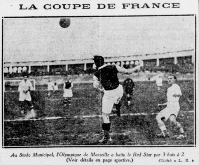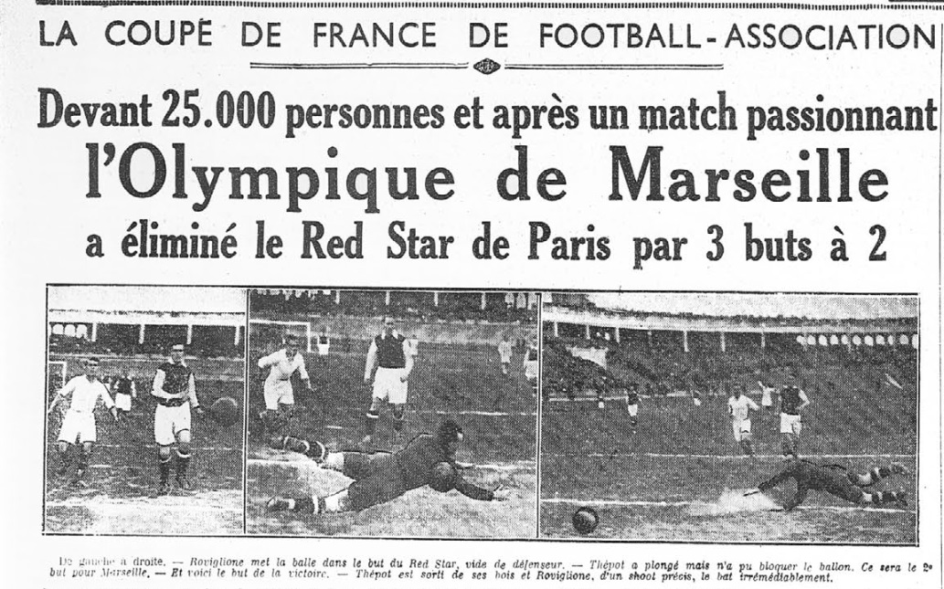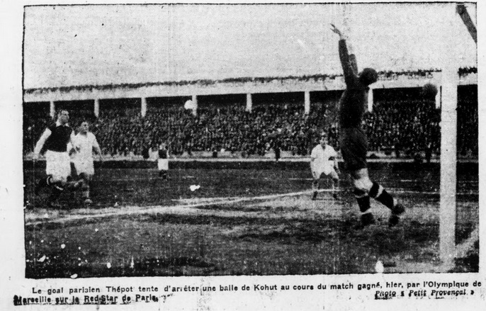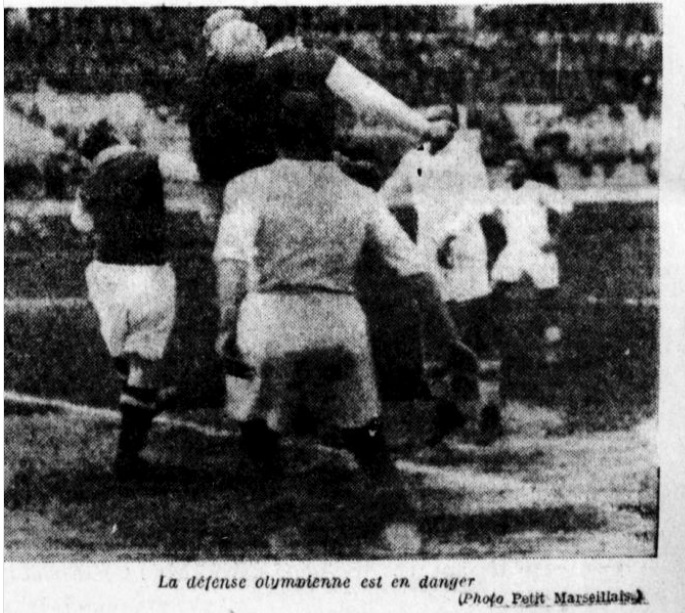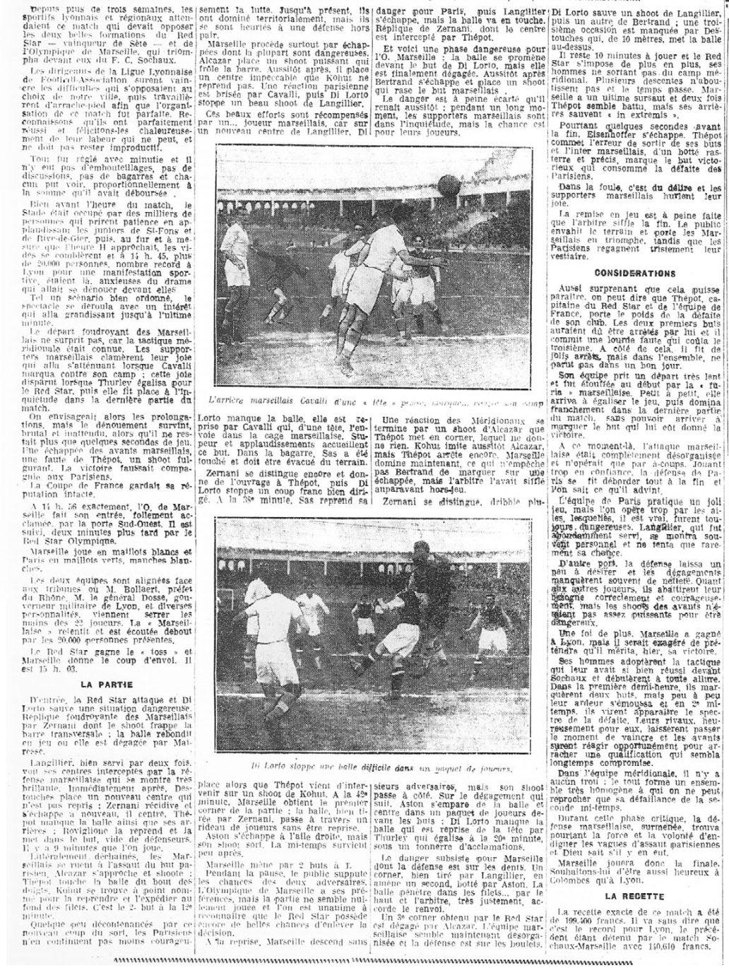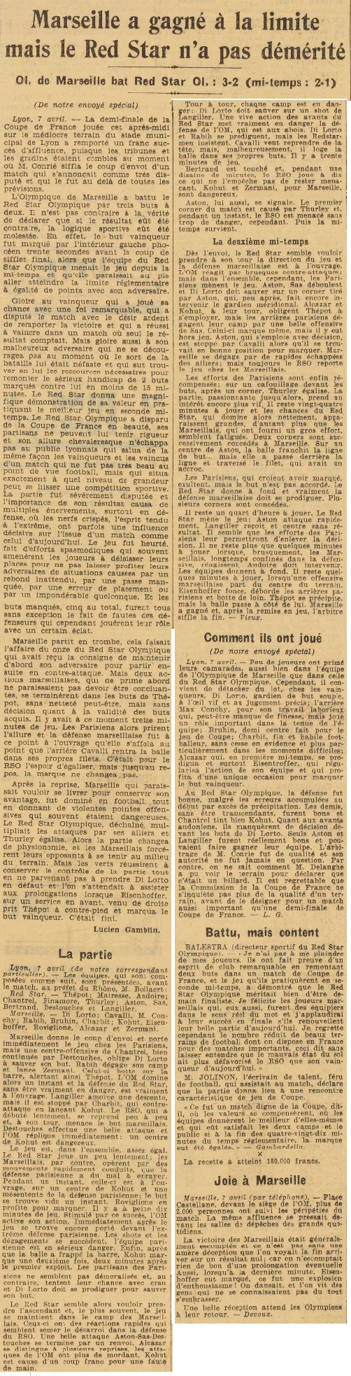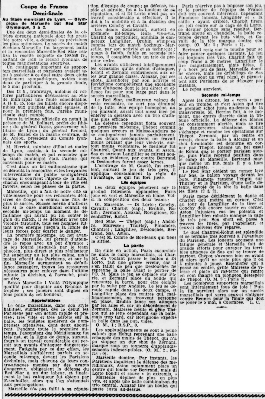 LE RED STAR EGALISE Sur corner, alors que rien ne l'obligeait, Di Lorto sort de ces buts pour happer la balle et Thurley n'a aucune peine pour ajuster son tir. Les deux équipes sont donc maintenant à égalité. Les inters Olympiens ne suivent plus avec la même ardeur, de même que Rabih. L'équilibre du " onze " s'en ressent et à ce jeu, la défense parisienne a beaucoup de facilité pour enrayer les quelques offensives phocéennes et permettre la contre-attaque. Di Lorto intervient sur loupé de Charbit et Bertrant est sifflé pour faute, alors que le but était à portée de ses pieds. EISENHOFFER MARQUE LE BUT VAINQUEUR Alcazar tarde trop et manque une très belle occasion de gagner le match ; Eisenhoffer s'empare de la balle, s'échappe et dans son style particulier trompe Mairesse et Thépot à la fois : c'est le but de la victoire, car il ne reste plus qu'une minute de jeu. La foule est en délire, le jeu reprend, les Parisiens attaquent avec l'énergie du désespoir ; un corner, vont-ils égalisaient ? Non car l'arbitre siffle le coût final. C'est ce qu'on appelle une victoire à l'arrachée, le terrain est envahi par un public enthousiaste ; les joueurs sont portés en triomphe par leurs admirateurs. Appréciations Nous disions, samedi, que la défense du Red Star était solide, mais point invulnérable. Hier on en fit l'expérience. Devant une attaque rapide et contrôlant parfaitement la balle elle ne put empêcher les Olympiens de marquer en moins d'un quart d'heure deux buts. Si Thépot a montré qu'il savait conduire un onze, il a perdu hier ses prétentions à la sélection nationale. Il apparaît ne plus posséder la défense, la souplesse et la vista des keepers de marque . Dire que les Marseillais menèrent la partie à leur guise seraient déguisés la vérité. Après une bonne première mi-temps, ils furent submergés par les offensives incisives de Langillier et Aston au cours du deuxième half. On eut à ce moment l'impression que le bénéfice de leurs efforts pouvait leur échapper. C'est qu'en effet le Red Star ne joua jamais battu. Au contraire, les Parisiens, bien enlevés par Finamore, forcèrent l'allure du match et il s'en fallut de peu qu'un résultat inverse ne se produise. Fort heureusement Bertrand et Destouches ne furent pas des shooteurs émérités et les interventions opportunes de Charbit et Bruhin préservèrent de façon suffisante la cage de Di Lorto. On allait cependant l'impression qu'au cas de prolongation les Marseillais, fatigués et quelque peu déséquilibrés, ne pourraient arracher la victoire. Eisenhoffer, fort heureusement, mis un terme à cette incertitude une minute seulement avant la fin. Chez le Red Star, ce fut la défense comme nous indiquons plus haut, qui supporte le poids de cet échec et en particulier Thépot. Des demis, Thurley fut le plus régulier,Finamore se signala en seconde mi-temps et son action fut bienfaisante pour l'équipe. En attaque les meilleures furent le tandem Aston-Las et aussi Languillier. Dans l'ensemble, le team parisien fit preuve d'un cran admirable et d'un très bel esprit de discipline. La volonté que déployèrent Audoniens auraient pu trouver un meilleur sort. Le Red Star a été le onze le plus dur, le plus difficile pour les marseillais, et si leur victoire est acquise d'extrême justesse, elle n'a que plus de mérite en raison de la valeur de l'adversaire. Hier les Olympiens ne jouèrent pas leur partie habituelle. Les inters baissèrent visiblement de pied en seconde mi-temps, alors que Rabih éprouvait une énorme difficulté à stopper les excellents Las et Aston. D'autre part, Cavalli, après son erreur qui coûta un but à son équipe, perdit une partie de ses moyens et Max manqua un peu de hardiesse sur les ballons. Il est vrai que le terrain qui n'a rien d'une pelouse rendait la tâche ingrate du fait d'un contrôle presque impossible de la balle. Charbit et Bruhin devant le danger surent se maîtriser et succomber avec une ardeur inlassable de la défense phocéenne. L'Olympique a pris sa revanche sur son coriace adversaire. Il convient que les Marseillais ne s'endorment pas en présence de ce succès. Ils ont à parfaire la condition de certains de leurs éléments et à harmoniser le rouage de l'équipe en vue de la finale. Côté jeux, on ne peut dire que ce match fut beau. Au contraire, il fut heurté, passionnant par son indécision. Seul Kohut, Zermani, Aston, Sas et Languillier réalisèrent quelques jolies phases. Cette manifestation dont le résultat rempli d'aise les Olympiens et sportifs marseillais fut pleinement réussi et la recette preuve irréfutable du succès atteignit près de deux cent mille francs.