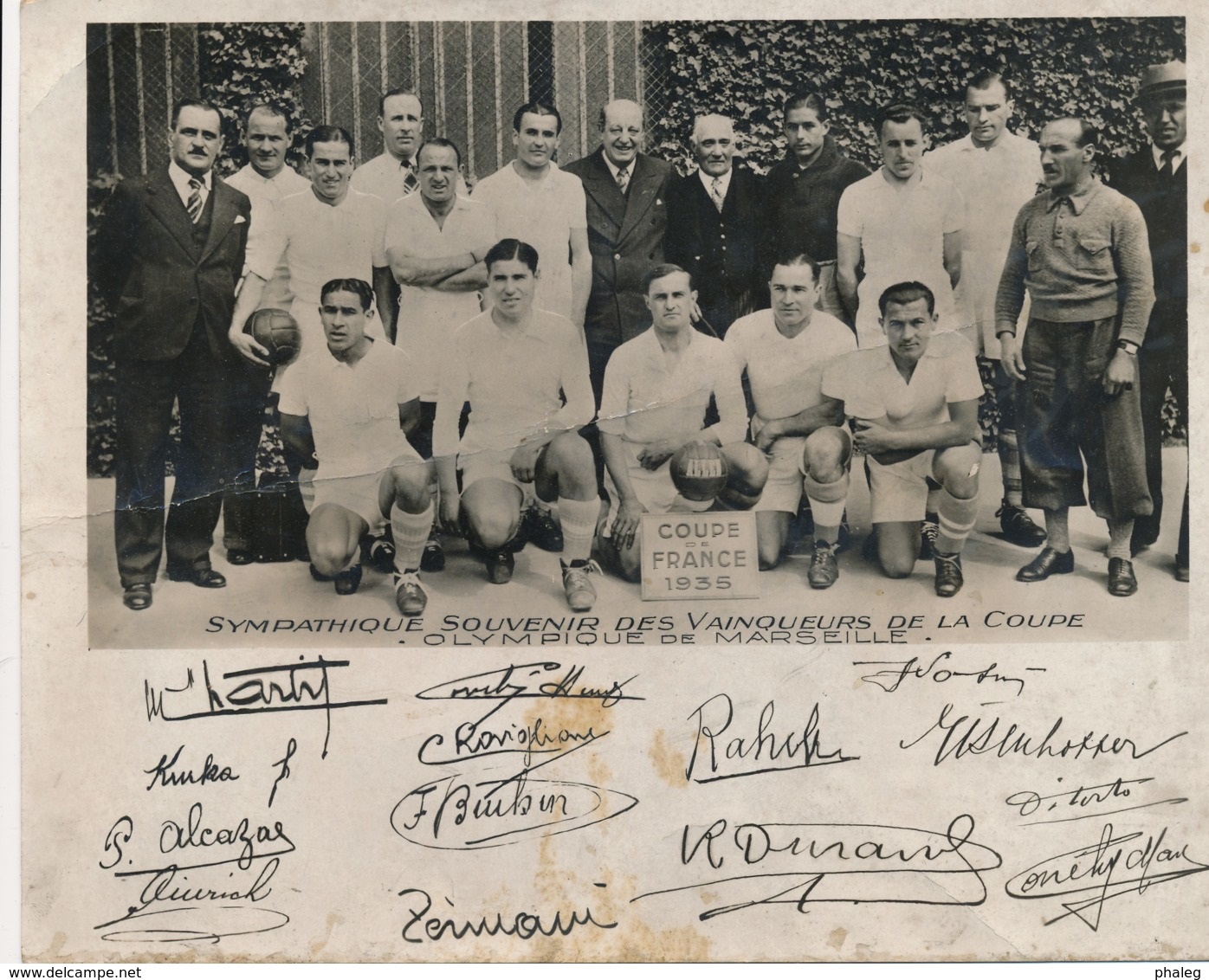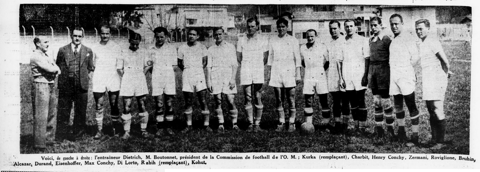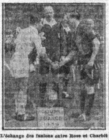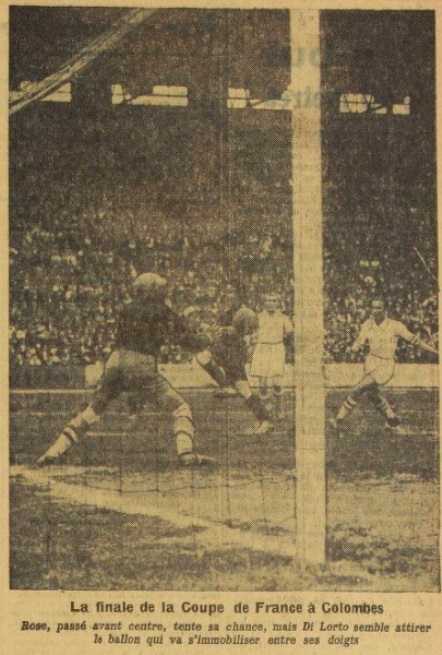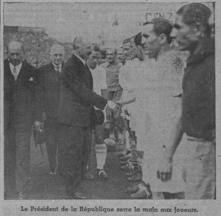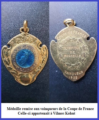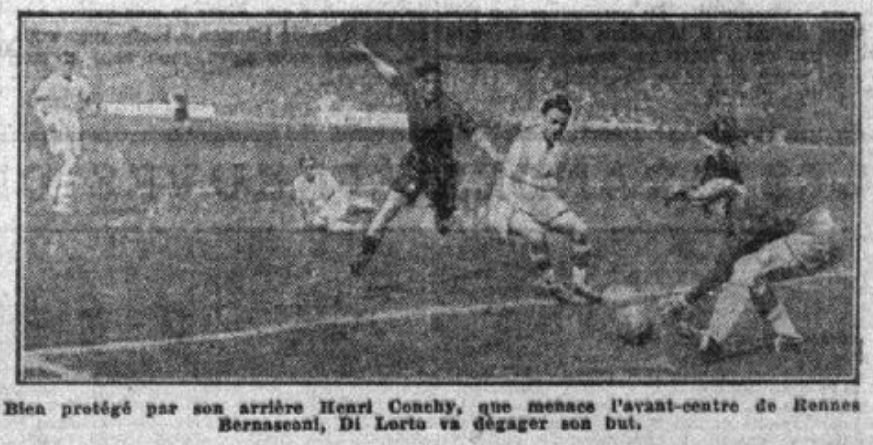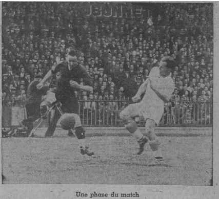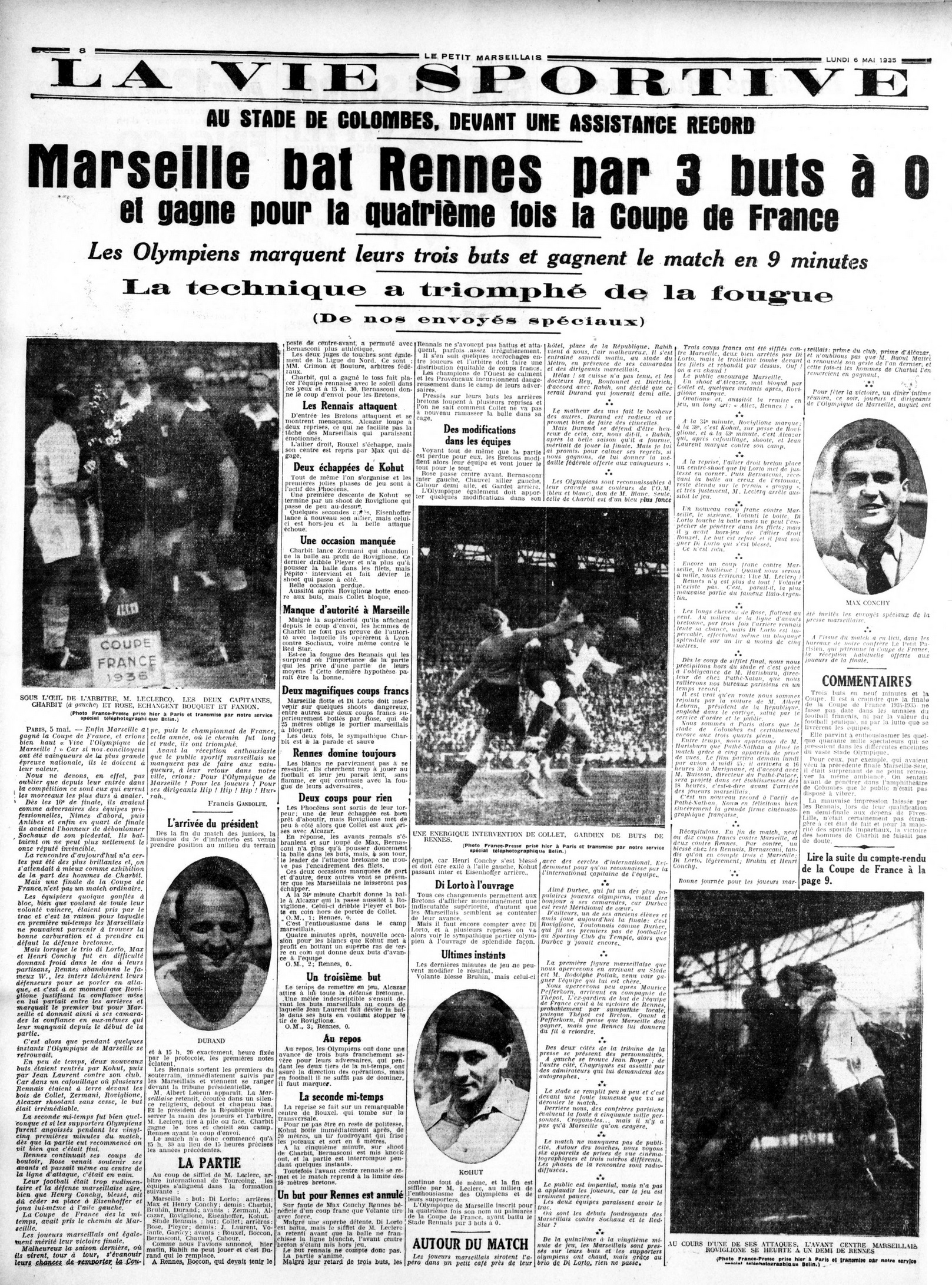 La partie Au moment ou la partie commence le soleil à définitivement percé la brume qui faisait peser sur Paris un plafond d'ombre. Ainsi nous aurons pour cette finale un ciel tout à fait méditerranéen. Les équipes pénètrent sur le stade follement ovationnées. Le cérémonial habituel se déroule dans le silence. M. Lebrun serre la main aux joueur, échange de fanions et bouquets, tirage au sort, la partie s'engage. La Coupe de France 1935 s'achemine vers l'histoire. L'O.M. gagne le toss, Rennes donne le coup d'envoi. Le jeu s'engage et demeure un bon moment vers le centre, puis une attaque sérieuse de Rennes échoue à la faute de Rouxel, qui laisse passer une balle facile. Eisenhoffer contre-attaque, mais Rose intercepte. Sur le renvoi, Chauvel amorce une offensive que Bruhin arrête. Il sert Alcazar qui lance vainement Kohut, Rose intervenant fort à propos. Un dégagement de Di Lorto repris par Eisenhoffer permet à Roviglione de shooter. La balle passe largement au-dessus. Peu après, Alcazar utilise de la même façon un centre de Kohut cependant bien ajusté. Le premier moment de surprise passé l'O.M. organise son jeu et prononce quelques attaques. Cependant Rennes ne se laisse pas imposer la tactique adverse et réagit même avec brio. Un coup franc pour les Marseillais ne donne pas de résultat. Peu après c'est au tour des Bretons de bénéficier de la même pénalité. Di Lorto dégage et lance Zermani arrêté par Pleyer d'une façon brutale. Nouveau coup franc qui donne à Zermani l'occasion d'attaquer. Alcazar et Roviglione partent à la conquête de la balle et se gênant laissent passer une excellente chance de conclure. C'est le troisième shoot qui est raté par les Marseillais. Mais nos Olympiens s'installent dans le camp breton ou la défense aux abois fait feu de toutes ces pièces. Kohut, Alcazar, Zermani bottent sans succès. Cependant, une échappée dangereuse se produit par l'intermédiaire de Rouxel qui envoie dehors. Les réactions bretonnes sans être dangereuses sont cependant sérieuses. Un hors-jeu arrête net Bernasconi qui s'apprêtait à shooter. Ensuite Roviglione fonce, sert Alcazar dans le trou et c'est un shoot de nouveau à côté. Pepito est plutôt malheureux aujourd'hui. Par contre Di Lorto arrête superbement un autre shoot de Rouxel devant trois adversaires très décidés. Peu après Di Lorto réédite le même exploit. Cette réaction bretonne va-t-elle durer ? C'est possible. En tout cas L'O.M. réplique du tac au tac et Kohut voit sa course arrêtait in extremis par Rose. Après demi-heure de jeu contre toute attente la partie est demeurée très égale. Jusqu'ici le résultat est incertain. De fait Rennes fournit une exhibition autrement supérieure que contre Fives en demi-finale. Un moment menacé l'O.M. se réorganise et attaque. Alcazar oblige Collet à mettre en corner. Une faute de Durand nous vaut coup franc à 20 mètres. Boté durement par Rose il est stoppé par le rideau formé par les joueurs de l'O.M. massés devant les buts. Et toujours le jeu est égal avec des avantages partagés. Les lignes de demis se prodiguent et reste à savoir celle qui aura assez de ressources pour continuer la rencontre à l'allure engagée. Mais la vitesse de l'attaque marseillaise se manifeste dangereusement. Un service de Bruhin atteint Kohut qui centre, Roviglione gêné ne peut shooter alors que Collet était battu. La pression olympienne s'accentue mais ne produit le résultat escompté. Au contraire, sur une échappée de toute la ligne bretonne, Bernasconi place une tête au-dessus. Sentant le danger, les joueurs marseillais activent l'allure. Eisenhoffer, véritable tacticien de l'équipe, déplace Zermani qui ne peut assurer le contrôle de la balle. Charbit le supplée, centre et Roviglione marque sans opposition. O.M. : 1 ; Rennes : 0. Mis en confiance, l'O.M. continue sur sa lancée et joue nerfs moins tendus, semble-t-il. Aussi le résultat ne se fait pas attendre. Sur faute de Cahour, Charbit s'empare de la sphère, sert Zermani qui feinte, déplace sur Kohut qui, d'un shoot puissant, bat de nouveau Collet. O.M. 2, Rennes 0. La contre-attaque qui suit cet exploit permet à Di Lorto de faire montre de ses qualités. Puis de nouveau l'O.M. attaque et Kohut place une droite dans la main de Collet, après qu'Alcazar, de 20 mètres, ait placé à côté. Les Bretons semblent désemparer. L'O.M. en profite pour accentuer l'allure. Les attaques se multiplient, un cafouillage se produit devant les buts de Rennes et finalement Laurent rentre la balle dans ses filets. O.M. 3, Rennes 0. La mi-temps est sifflée peu après. Que nous réserve les quarante-cinq minutes suivantes ? Dès le début, L'O.M. attaque par Zermani, mais le centre de ce dernier est raté par Eisenhoffer, qui ne cache pas son désappointement. La balle, immédiatement dégagée, échoit à Rouxel, qui de l'aile, place de peu au-dessus. Le renvoi est favorable au Phocéen qui, de nouveau, envahissent le camp breton, où Kohut, dernier possesseur de la balle, place également bien au-dessus de la barre transversale. Désormais, à peu près tranquilles sur le résultat final, les Olympiens essaient de pratiquer un jeu agréable. Ils y parviendraient si les Rennais n'entravaient leurs combinaisons part de longs dégagements qui heureusement, ne sont pas repris par les ailiers franchement maladroits. Par contre, l'O.M. se montre dangereuse à chaque attaque. Di Lorto participe à de rares instants, très rares d'ailleurs, à la jolie exhibition phocéenne. Un coup franc sifflé à contre-sens soulève l'ire populaire et n'était qu'un hors-jeu de Chauvet, Volante aurait battu Di Lorto. Les marseillais font maintenant preuve de nonchalance et naturellement Rennes met à profit ce détachement que nous voulons croire momentané. L'arbitrage quelque peu fantaisiste de M. Leclercq, soulève à nouveau le mécontentement d'un public qui, un moment partial, dispense égal