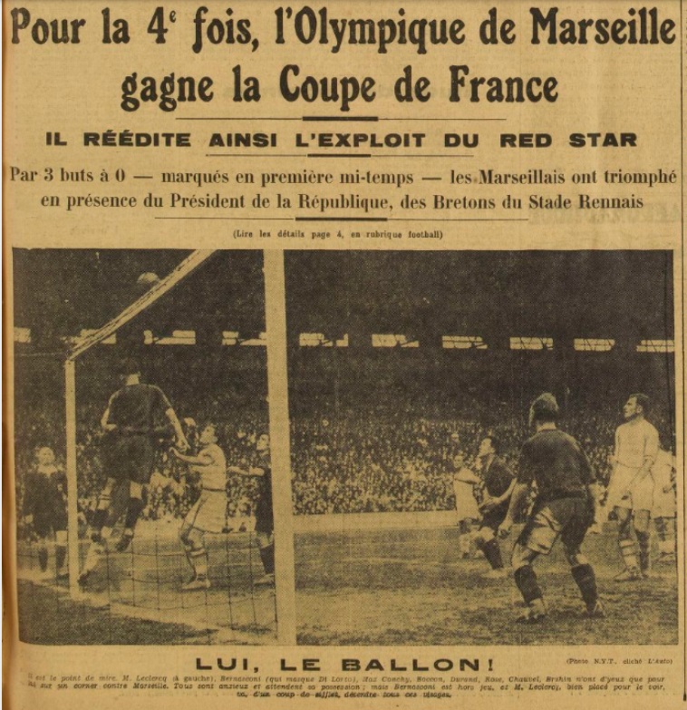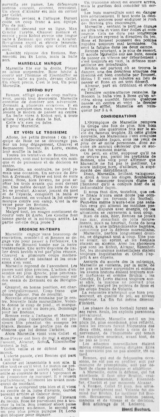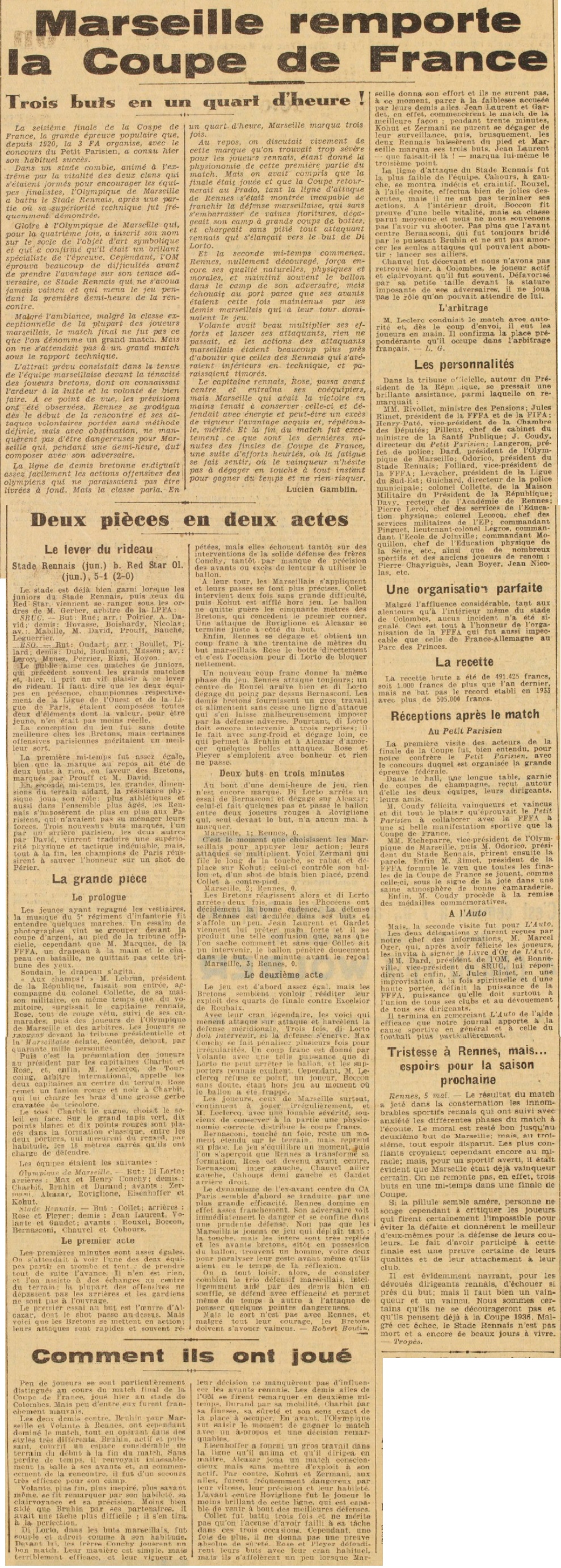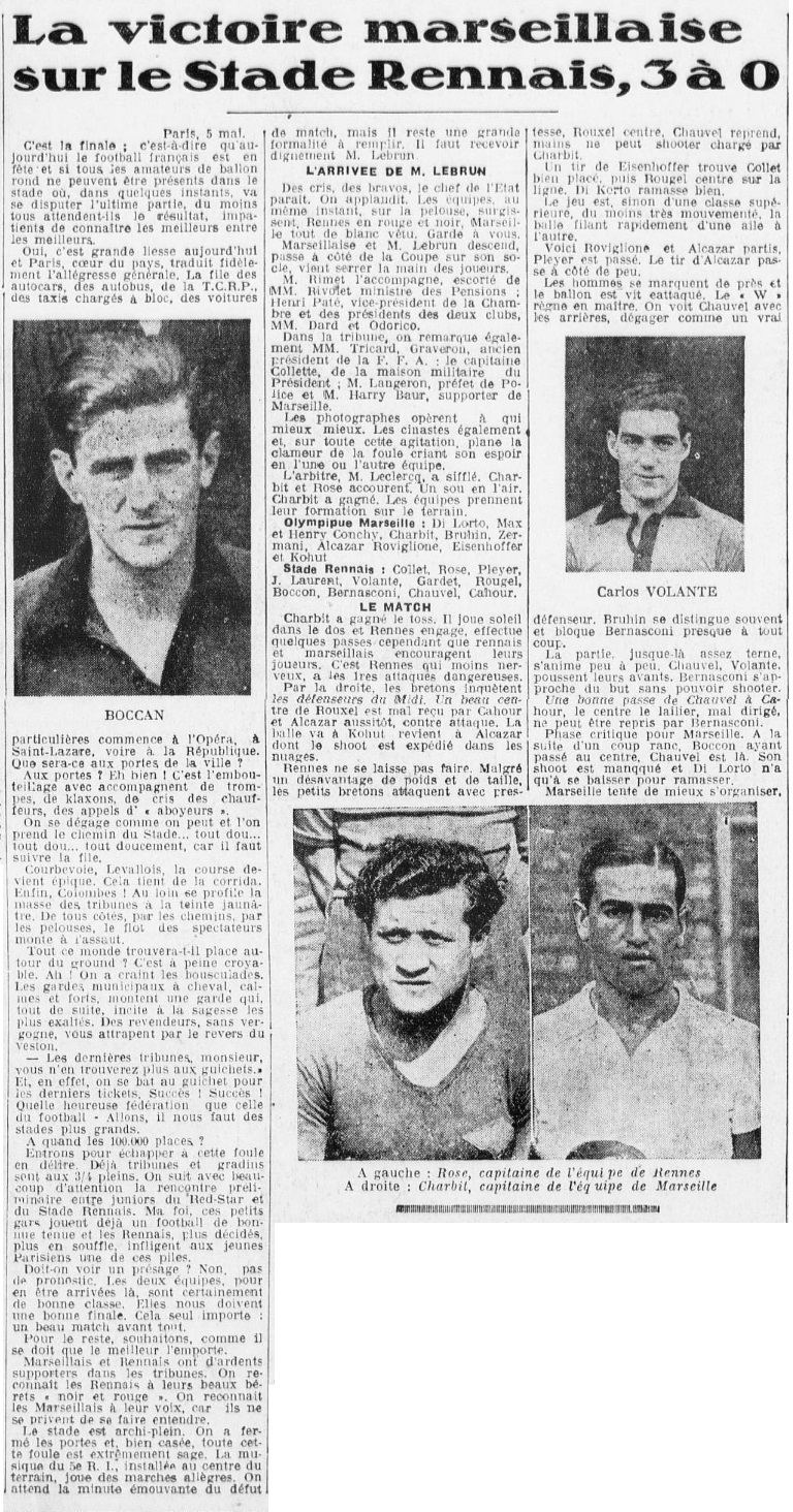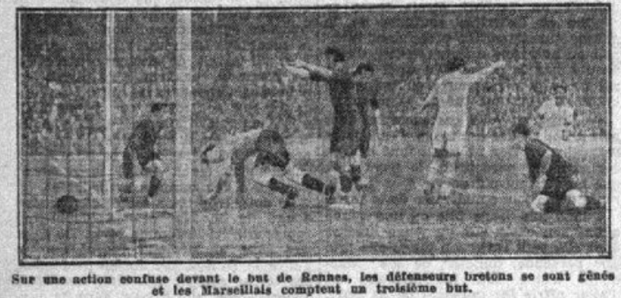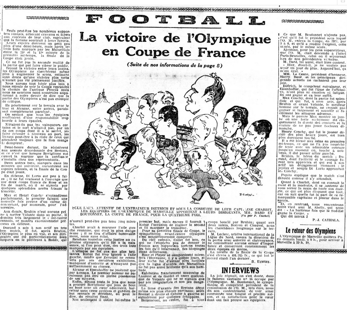 L'APOTHEOSE DU FOOTBALL NATIONAL . MARSEILLE GAGNE LA COUPE DE FRANCE _________________________________________ Les Rennais, battus par 3 buts à 0 avant le repos, opposent une opiniâtre défense à nos valeureux olympiens infiniment supérieurs _________________________________________ Les Marseillais, égalant le record du Red-Star de Paris, inscrivent pour la quatrième fois leur nom au palmarès de la classique compétition _________________________________________ |