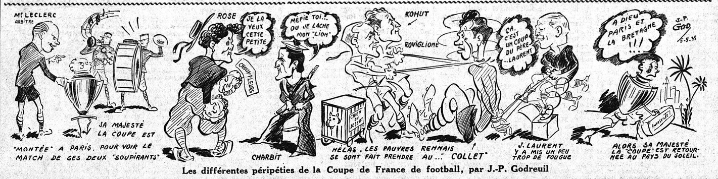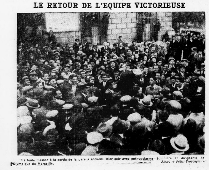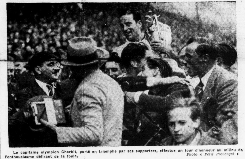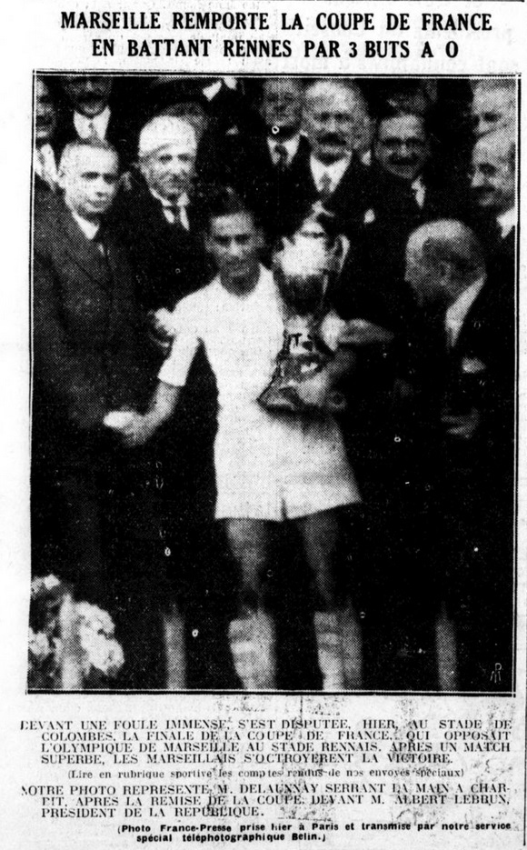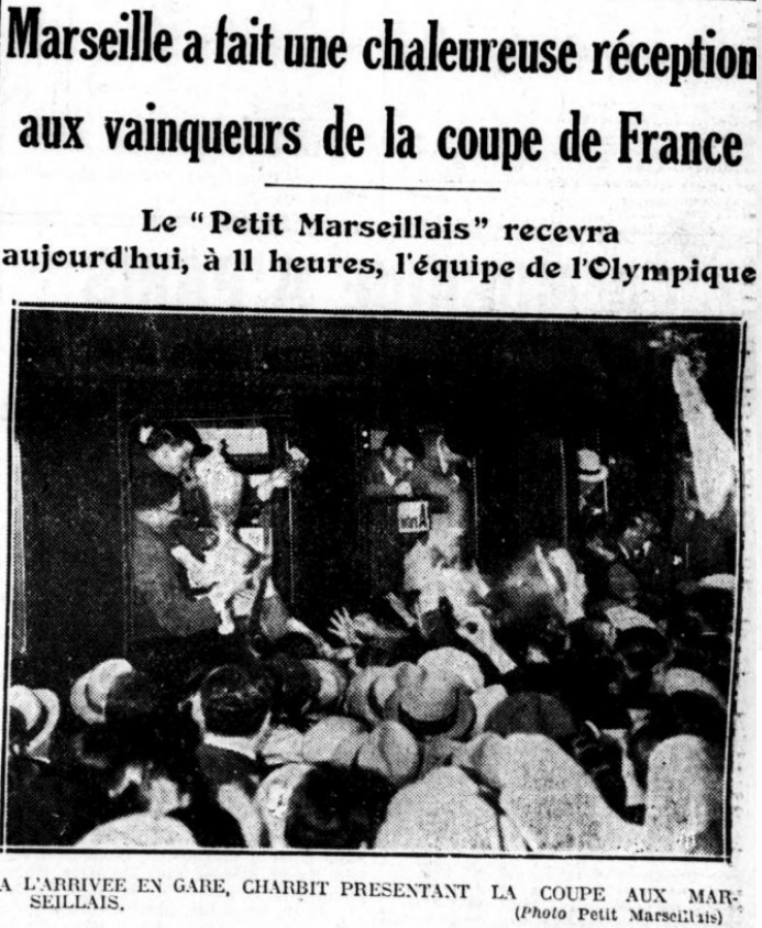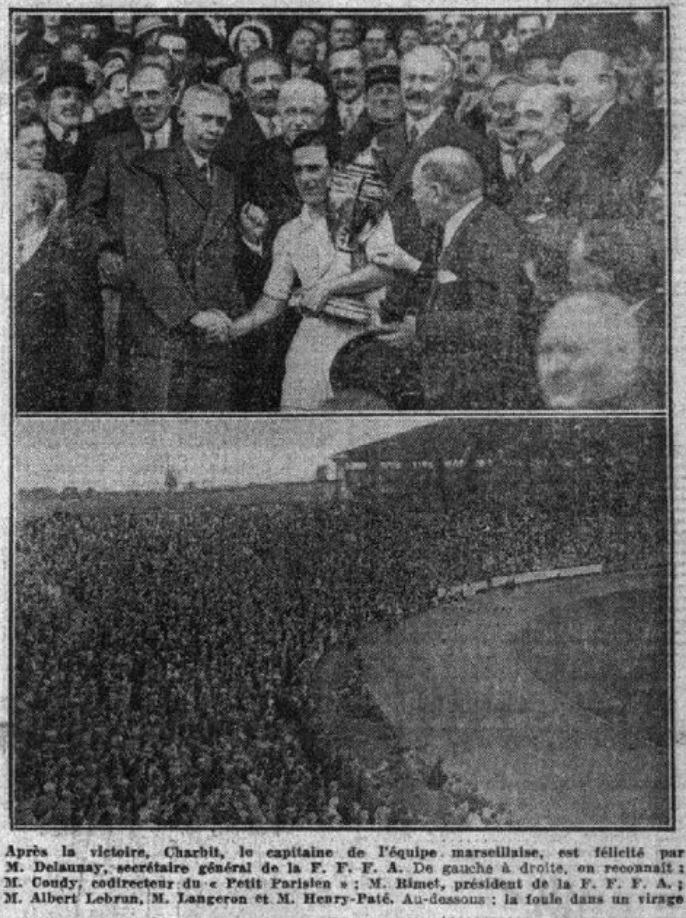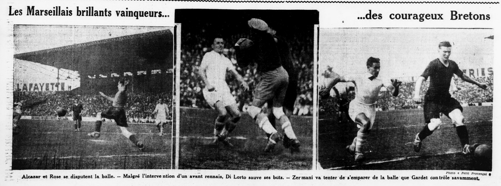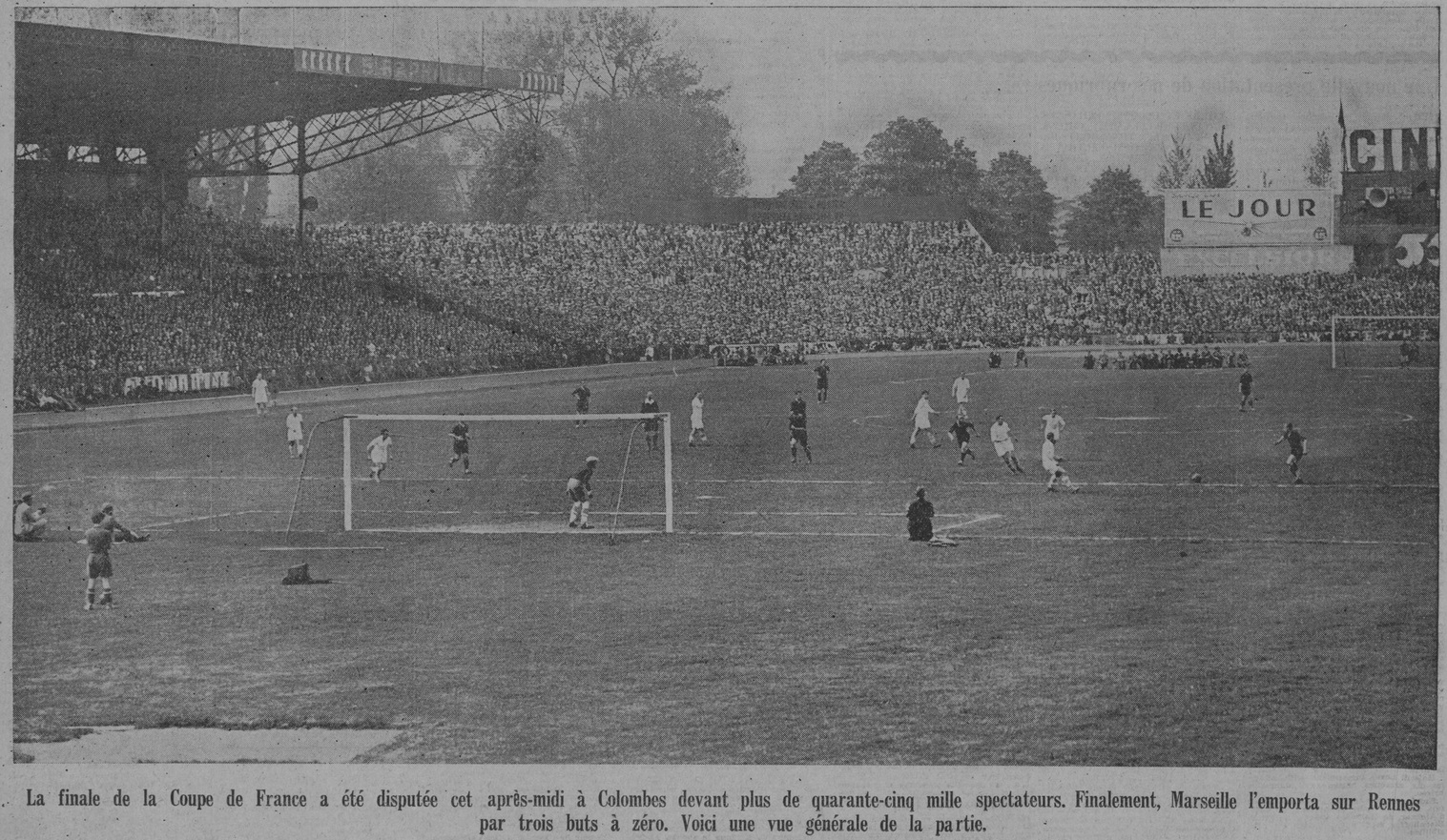 L'APOTHEOSE DU FOOTBALL NATIONAL . MARSEILLE GAGNE LA COUPE DE FRANCE _________________________________________ Les Rennais, battus par 3 buts à 0 avant le repos, opposent une opiniâtre défense à nos valeureux olympiens infiniment supérieurs _________________________________________ Les Marseillais, égalant le record du Red-Star de Paris, inscrivent pour la quatrième fois leur nom au palmarès de la classique compétition _________________________________________ |