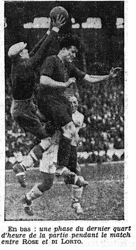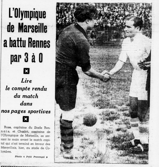 En fait, du côté rennais, rien de sensationnel. Un désir évident de bien faire, mais absence de moyens. Rose abandonne la défense et passe avant centre. Le jeu languit, la partie est, semble-t-il jouer. Cependant, Rose, très en vedette, vient inquieter Di Lorto. Il faut tout le brio de celui-ci pour empêcher l'avant-centre de marquer. Un peu plus tard, sur corner, même intervention efficace du portier phocéen. Eisenhoffer passe arrière, Kohut inter et Henri Conchy extrême gauche. Jusqu'à la fin cette formation restera inchangée, de même le résultat que Marseille n'a pas voulu aggraver et que les Rennais ont essayé d'améliorer. J'ajoute qu'avec Rose au poste d'avant-centre, l'espoir breton faillit se changer en réalité. La fin est sifflée sur la victoire largement méritée de l'Olympique de Marseille. _________________ Appréciations _________________ Ainsi une fois de plus l'Olympique remporte la Coupe de France. Mais avant toute chose, il est important de souligner que la partie qui consacre la supériorité des Phocéens ne fut pas tant s'en faut aussi périlleuse, aussi dangereuse que les deux rencontres qui lui permirent de se qualifier. Il importe maintenant de savoir comment nos concitoyens acquirent la victoire. On sait qu'elle se manifesta au cours de la première mi-temps grâce à une action plus liée, plus soutenue, à une plus grande technique surtout. Malgré la résistance opposée par les Bretons, il ne faisait pas de doute que le succès était à la portée de nos amis olympiens. Accentuant leur pression, tout en paraissant ménager leur effort, ils fatiguèrent, usèrent leurs adversaires qui, après demi-heure de jeu devait s'avoue vaincu. Tel le boxeur qui sans cesse harcelé par son rival, résiste aux attaques, riposte quelquefois, il relâcha son action comme le pugiliste petit à petit baisse sa garde par fatigue. De fait en peu de temps l'O.M. marqué trois buts décisifs, victorieux. Ces trois buts consacraient à la supériorité olympienne sur une formation, certes valeureuse, pleine de courage, mais vraiment trop inférieur. Au cours de la première mi-temps, car nous ne parlerons pas de la deuxième qui meubla le match d'épisode tout simplement modestes, il nous fut donné d'admirer le jeu plein d'allant et d'autorité de Kohut. Malgré Laurent qui s'attacha à lui comme une véritable arapède, il accomplit des promesses qui laissaient ses opposants sur place. Mais il dut se de se faire valoir aux qualités transcendantes de Eisenhoffer, véritable tacticien, animateur incontesté du onze olympien. Ce cerveau de l'équipe multiplia ses ouvertures, sut attirer à lui la défense adverse afin de faciliter la tâche de ses coéquipiers. Quand Eisen était en possession de la balle, la crainte entrait du même coup dans le camp breton. Bruhin, également accomplit un labeur digne d'éloges. Supérieure dans le jeu de tête, il fut constamment sur le chemin que suivaient les avants opposants. L'O.M. tient en Bruhin un pilier dont j'avais signalé la puissance et efficacité en temps voulu. Charbit fut lui-même. Son titre de capitaine n'est pas usurpé et aux qualités morales il joint des qualités physiques qui en font un footballeur de grande valeur. Durand avait pour excuse d'opérer à une place qui ne lui est pas familière. Il accomplit néanmoins sa besogne avec conscience et assez de bonheur, mais je n'en dirai pas autant d'Alcazar. Pepito n'était certainement pas en forme parfaite. Sa conjugaison avec Zermani, par trop d'intermittence, plongea trop souvent dans l'ombre l'aile droite olympienne. De plus il versa dans le double travers de manquer et d'abuser de l'opportunité. Grâce à lui, ou pour mieux dire par sa faute, Roviglione manqua un but facile sans aucun doute. Ce dernier dont l'extrême vitalité est connue de tous, ne négligea pas sa peine, bien au contraire. Constamment en flèche, il se fut pour Rose et Ple yer un danger constant. La défense, Di Lorto compris, quelquefois bousculée, acculée, se tira à son avantage des situations mêmes critiques. Victoire amplement méritée de L'O.M. Que dire des vaincus ? Ils s'opposèrent aux assauts de l'Olympique avec une abnégation, mais aussi un courage qui reçut sa récompense jusqu'à la trente-quatrième minute. Ensuite la pression olympienne porta ses fruits. De tous les joueurs rennais, Volante fut naturellement le meilleur. Mais que pourrait-il faire devant les vagues d'assaut qui, sans cesse, déferlaient vers les buts de Collet. Il essaya, il y parvint d'ailleurs plusieurs fois d'amorcer des attaques ; il lança ses ailiers, servit Bernasconi, participa efficacement à l'attaque, mais sans succès. Après lui, Rose constitua à lui seul un sérieux rempart aux offensives olympiennes. Mais la volonté s'effrite, le courage s'émousse, la résistance faiblit à la longue. Dès avants, peu de choses sauf qu'ils ne furent pas à la hauteur de leur tâche. Pris constamment de vitesse et bridés par une ligne de demis active et décidée, ils laissèrent leur chance loin, bien loin des buts gardés par Di Lorto. La victoire amplement méritée de l'O.M., couronne justement une saison particulièrement brillante. Plus heureux que l'an dernier, les Olympiens revoient à nouveau la Coupe rejoindre les bords ensoleillés de notre belle Méditerranée. M. RAFFAELLI |