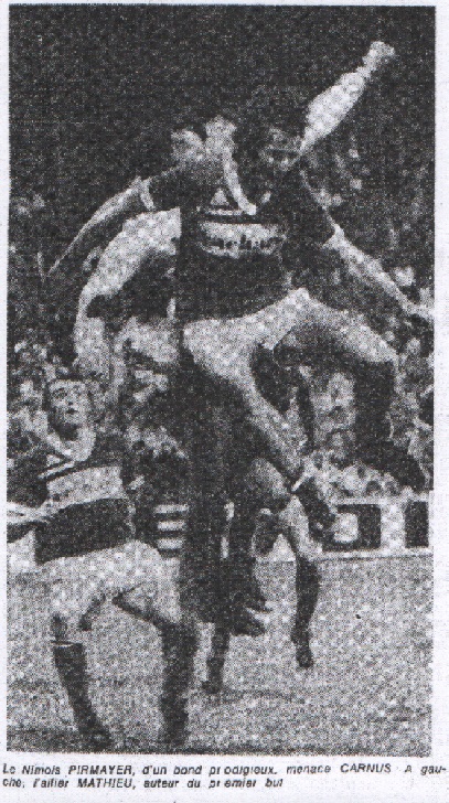 La victoire de Nîmes Olympique fut longue à se dessiner. Rien n'était joué au repos, après une première mi-temps très égale. Les Nîmois avaient mis longtemps à trouver la bonne distance et leurs premiers tirs, puissamment ajustés s'étaient égarés nettement en dehors du cadre. En fait, Carnus n'avait pas eu la moindre balle à arrêter, quand la défense marseillaise se laissa surprendre une première fois par un coup de tête du jeune Mathieu. L'O.M. montra alors ses possibilités en répliquant immédiatement par un but assez extraordinaire de Roger Magnusson. Même scénario au début de la seconde période... Nouveau coup franc de Mezy et reprise de la tête irrésistible de Pintenat, un bon spécialiste en la matière. Mais encore une très bonne réaction deux des meilleures offensives de la partie menée par Kusowski puis Keruzore échouant sur un Landi bien inspiré, qui préservait alors la victoire de son équipe. |
