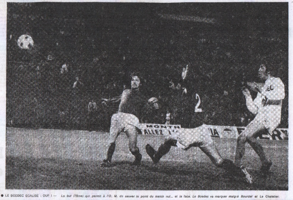DE LA 1re MI-TEMPS La première mi-temps avait ressemblé à une partie de hand ball jouée au pas de gymnastique. Quand une équipe était en possession du ballon, l'autre semblait la regarder jouer jusqu'au moment où l'offensive s'approchait de la zone de tir. À ce petit jeu, assez agréable, mais manquant un peu de tonus, la douceur angevine fit des ravages dans la défense de l'O.M. Deux buts en souplesse, l'un d'Antic, l'autre offert à Edwige par ce même Antic : le premier obtenu à 2 minutes du coup d'envoi, glaça littéralement le public, bien que la température fut très douce pour la saison. Bref, sans avoir l'air d'y toucher, cette Antic là, technique plus sang-froid, avait réduit à moins que néant tous les efforts de l'O.M. On ajoutera pour être complet, que lorsque le ballon passait par les pieds de Guillou, Poli et autre Edwige ou Damjonovic, le ballet angevin ne manquait pas de charme.