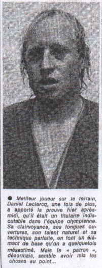 "Cela nous semble évident, car il fut l'un des meilleurs hommes du match et l'animateur de son équipe. "Celui que nous appelons amicalement "le patron" a les défauts de ses qualités. Un athlète de grand gabarit, qui manifeste une pareille activité, a besoin de temps de récupération. Il n'est certes pas très efficace en défense. |