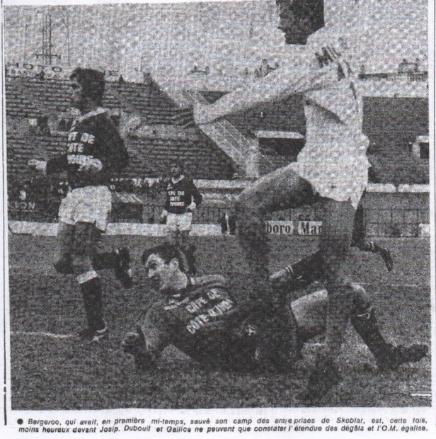 UNE BONNE DEUXIÈME MI-TEMPS Un ciel noir, menaçant, présidait le match de championnat O.M. - Bordeaux, disputé devant une faible chambrée n'atteignant pas 5.000 personnes. Dans les rangs girondins on notait les absences de Rigoni, Rico et Tokoto ; dans ce de l'O.M., celles de Bosquier de Magnusson. Dès le coup de sifflet, les Aquitains paraissaient plus à leur aise - sur un terrain gras et glissant - que leurs adversaires, et à la 4me minute de jeu Gallice fonçait dans le trou et transmettait le ballon à Giresse qui, d'un tir fulgurant, trompait Carnus. O.M. : 0 - BORDEAUX : 1. Skoblar voulait répliquer, mais son tir s'écrasait sur le montant droit et sa seconde et sa troisième tentatives se terminaient dans les pieds de Bergeroo. Sur un corner, Dos Santos sauvait sur sa ligne devant Franceschetti (19me minute). A la 32me minute, Giresse ratait d'un cheveu un second but pour les Girondins ! Skoblar, à deux reprises, obligeait Bergeroo à se surpasser, mais le score jusqu'à la mi-temps demeurait inchangé. La partie n'était reprise que depuis quelques dizaines de secondes lorsque Emon, remplaçant Kuszowski à l'aile gauche, débordait et adressait une jolie balle à Skoblar qui, d'une reprise magistrale, obtenait l'égalisation. O.M. 2 - BORDEAUX 1. Les poulains de Phelippon réagissaient. Giresse était fauché à l'intérieur des 18 mètres marseillais, mais l'arbitre, M. Amiotte, très large, ne sifflait qu'un coup franc. Puis (59e minute), Leclercq, en position d'ailier gauche, expédiait une longue balle vers le centre, Bergeroo la manquait, et Buigues, de la tête logeait la sphère dans les bois. O.M. 2 - BORDEAUX 1. L'Olympique paraissait alors libéré. Bergeroo était légèrement touché par Skoblar (74me minute). À la 85me minute, Skoblar glissait le cuir à Emon qui, en position d'avant-centre, trompait Bergeroo sorti à sa rencontre. La balle pénétrait dans la cage vide. O.M. 3 - BORDEAUX 1. La victoire et en plus le bonus, l'O.M. n'en demandait pas tant ! Alain DELCROIX |