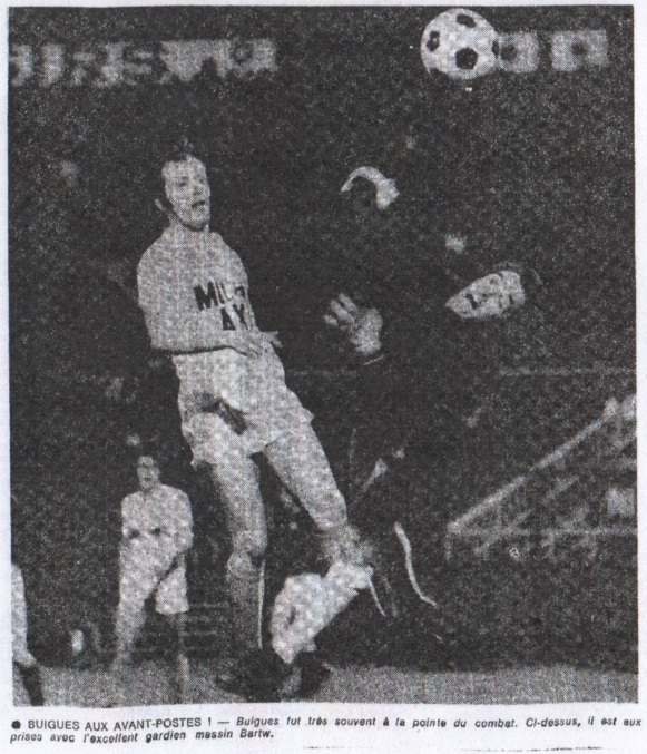 LE B DE BUTEUR. La première mi-temps nous avait d'abord permis de faire une constatation curieuse : les footballeurs ayant paru s'accommoder le mieux du vent soufflant sur le terrain avait été les joueurs messins. À terre et par passes courtes, c'est la solution vieille comme le football. Devant une équipe messine jouant avec beaucoup de calme et dans les rangs de laquelle Jeitz et Hausknecht jouaient les chefs de file, l'O.M. fut assez malheureux. Un penalty raté, un tir sur le poteau... et à son passif un but de contre-attaque. Les seuls tirs, pas très nombreux de cette mi-temps furent l'oeuvre de Bosquier (deux fois) Braun (2 fois) et Buigues. On peut donc dire qu'au cours de cette première période, le B avait vraiment été celui de buteur. Mais les deux principales événements avaient été le penalty raté par Skoblar et le but marqué par Di Dominico. Skoblar, qui avait enlevé son masque, n'en fut pas moins "emmasqué" suivant la formule populaire. Gêné par le vent qui déplaça plusieurs fois la balle, tira trop mollement sur la droite de Barth, lequel pu intervenir efficacement. Quant au but messin, il fut surtout l'oeuvre de Braun - la bourrasque. Le Luxembourgeois de Metz effaça Trésor et, d'un crochet du gauche à la Cerdan, contraignit Carnus à lâcher le ballon, ce dont profita l'autre Luxembourgeois Di Dominico pour marquer le seul but de cette mi-temps.