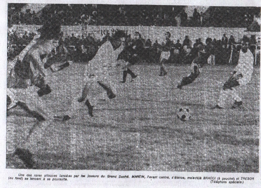 On sait que de nombreux joueurs du Grand Duché ont brillé dans des équipes françaises ou étrangères. Citons actuellement Jeitz et Braun à Metz. On sait que Pilot fut l'une des vedettes du Standard de Liège, qui était une formation de bonne renommée européenne. Pour ce qui est de l'U.S. Luxembourg, son ailier gauche Zangerie, un peu perdu au milieu d'une formation limitée, fut un professionnel en Belgique. Sur ce que nous avons vu hier soir, le gardien et capitaine Pletschette pourrait faire le bonheur de beaucoup d'équipes françaises. Il est athlétique, racé et a une excellente prise de balle.