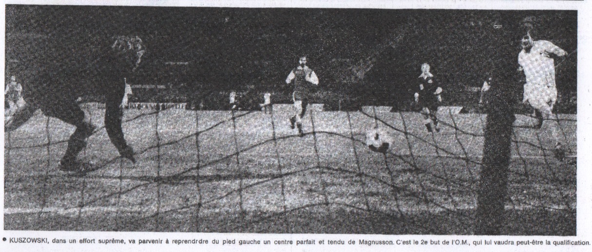 On n'avait encore rien vu. En deuxième mi-temps, l'O.M. se mit soudain à appuyer ses actions et l'on vit l'équipe allemande, le plus souvent replié devant son but, subir la rencontre, sans trop oser contre-attaquer. Ce fut la grande période olympienne et le triomphe d'un joueur ordinairement qualifié de modèle : Lopez. Il devait marquer le premier but de son équipe, par un tir aéré, qui trompa complètement le gardien allemand. Puis, en fin de rencontre, il sauva deux fois son but sur la ligne, alors que les Allemands étaient sur le point de réduire le score. Entre-temps, une admirable combinaison amorcée par Magnusson, devait se terminer par un centre ras de terre de Keruzore et une reprise acrobatique de Kuszowski, laquelle devait assurer à l'O.M. son deuxième but.