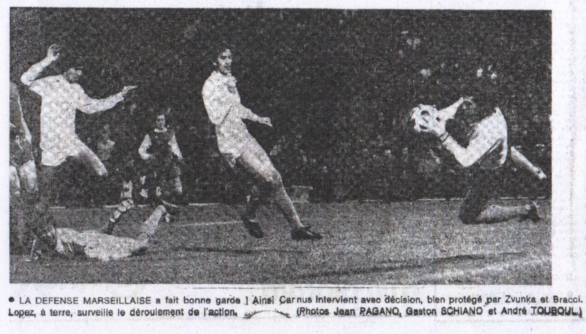 - 2 à 0, est-ce que le score paraît suffisant ? - Puisque vous demandez mon avis, a poursuivi le président en souriant, je vous dirai que j'aurais accepté volontiers un troisième but. À 2-0, toutefois, nous avons une marge confortable, mais, ne l'oublions pas, une rencontre de Coupe d'Europe se joue en deux ans. Il s'agit maintenant de tenir bon à Cologne. Pour ma part, je fais confiance à mes joueurs. La souffrance de SKOBLAR Josip Skoblar, lui aussi, a été satisfait mais faisait plutôt la grimace avant de passer sous la douche : "J'ai encore beaucoup souffert de ma blessure, nous a dit Josip. En fin de partie je ne pouvais presque plus respirer. Je crois qu'il faudrait que je me repose pendant une dizaine de jours. Je ne sais pas si je pourrais me rendre samedi à Bastia". - Que pensez-vous de l'équipe allemande ? - Ma foi, nous répondit Josip, elle est moins redoutable que nous l'avions supposé. À mon avis, nous avons eu tort d'être plus ou moins impressionnés par le F.C. Cologne. Nous sommes aussi entrés sur le terrain quelque peu contractés, ce qui nous a peut-être privés d'une victoire plus large. Mais enfin, le résultat est bon. Espérons qu'il sera suffisant pour permettre à l'O.M. de disputer le troisième tour ! L'opinion de Josip était partagée par Georges Franceschetti : "C'est exact, nous a dit le capitaine. Si nous avions abordé le match comme en deuxième mi-temps, je crois que nous aurions pu remporter un succès plus large. Comme tous mes camarades, toutefois, je suis satisfait de ce résultat. L'opinion de François Bracci, a qui l'arbitre M. Jones n'avait rien pardonné lors de ses interventions : "Je n'ai absolument rien à reprocher à l'arbitre, nous a déclaré le grand François. Il est très bien dirigé le jeu. Mais, dans une telle partie, il faisait jouer un football de contact, c'est à ce prix, je pense, que nous avons tenu tête d'abord et ensuite battu notre adversaire allemand. "Au match retour, je suis persuadé qu'il faudra employer la même tactique". Enfin le point de vue de Magnusson, qui tenait une véritable conférence de presse sous les projecteurs de la télévision. "Vous voyez, lança-t-il en allant au devant de notre question, on dit que je ne suis pas très bon contre les équipes étrangères. Ce soir, tout au moins, j'ai pu prouver le contraire. Comme quoi, quand un joueur est en condition, il peut s'exprimer devant n'importe quel garde du corps. Jean FERRARA |