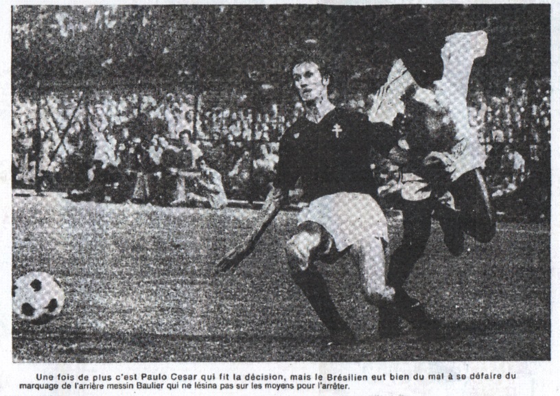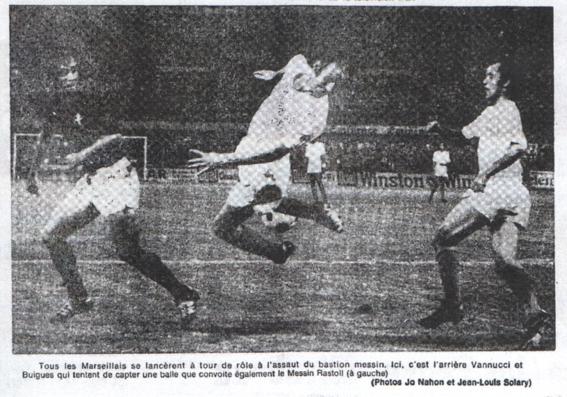 La première phase dangereuse est à l'actif de l'arrière messin Baulier qui, 35 mètres, à la 10e minute, adresse un shot plongeant à Charrier qui doit sortir de sa cage et repousser le ballon des deux poings. Ensuite l'arbitre distribue de nombreux coup franc, puis César est fauché par Baulier. Le public proteste et c'est un coup franc dangereux donner à quinze mètres des buts lorrains. Il en résulte un corner. La reprise est faite par Eo, malheureusement sa balle s'écrase sur la barre transversale (23e). Quelques instants plus tard Braun est balancé et il obtient un coup franc ; il est donné de façon redoutable par Coustillet dans le coin gauche. Il oblige Charrier à plonger (29e). On note ensuite un tir de Perrignon et une tête de Skoblar. Et la mi-temps est sifflée sur le score de 0 à 0. À la reprise Noguès est abattu à proximité des dix huit mètres mais l'arbitre ne siffle aucune sanction contre les Lorrains. Bracci s'énerve, déborde et shote de trente mètres, mais il rate la cage. C'est ensuite Emon qui fonce et oblige Barth a exécuté un plongeon spectaculaire à la 56e. À la 57e Noguès est descendu dans la surface de réparation ; le penalty paraît flagrant mais l'arbitre ne siffle rien. Le public est mécontent et c'est une véritable bronca qui s'abat sur ce dernier. À la 69e Bracci déborde de l'aile gauche et shoote dans sa foulée mais Barth se détend magnifiquement César s'infiltre dans la défense messine, feinte trois adversaires, et il est fauché impitoyablement par Baulier ; cette fois-ci c'est le penalty. César le tir et marque le seul but de la rencontre : Marseille 1 Metz 0. Alain DELCROIX |
