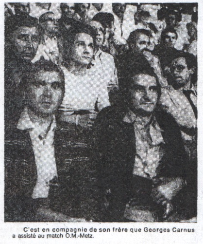 GEORGES parmi nous... Le fait du match hier, circonstance exceptionnelle, n'eut pas directement la pelouse pour cadre. Non pas d'actions d'éclat eussent été parfaitement en dehors du débat. Mais c'est avant même que ne débute la rencontre, qu'était intervenu un moment d'émotion bien particulier. Pas l'émotion entre guillemets, celle du sport, mais la vraie. Conséquence d'une petite phrase lancée au micro par le président Meric : "Nous avons la joie d'accueillir ce soir, parmi nous, Georges Carnus". Une petite phrase à peine audible, dans le brouhaha fébrile de l'avant match. Que tout le monde, néanmoins, entendit comme par enchantement : dans un même mouvement, trente mille personnes se levèrent. Spontanément. Et durant toute une longue minute applaudirent. Sans un cri, sans une de ces paroles que l'on croit de réconfort et qui sont celles qui font le plus mal aux être en détresse... Ces applaudissements que Georges n'aurait pas voulu, n'aurait jamais dû entendre, doivent raisonner à ses oreilles comme autant de cadeaux. On fêtait, hier, au stade, le retour d'un ami. Sans vaine et cruelle compassion, sans artifice : Georges Carnus, son enfant chéri, lui était revenu. Et le public, heureux, ne voulait penser à rien d'autre. Georges pensait, sans doute, avoir connu chacune des multiples sensations qui flottent au flanc des stades. Trente mille frères qui lui ont prouvé, hier soir, le contraire... Alain PECHERAL |