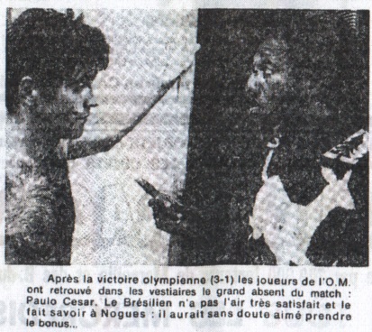 La porte des vestiaires marseillais est resté fermé pendant de longues minutes après la rencontre. Les dirigeants avaient tenu à parler à leurs joueurs pour leur dire ce qu'ils pensaient de cette partie face à Angers. Et d'après ce que nous avons compris, les Olympiens n'ont pas entendu seulement des paroles de félicitations. M. Meric, que nous avons retrouvé le premier nous déclarait, avec son soupir de soulagement habituel : "Eh oui ! voyez-vous, il me manque un point, ce qui gâche un peu mon plaisir. Je trouve que l'équipe s'est relâchée après le troisième but. Mais enfin, n'en parlons plus, j'ai tout de même trouvé quelque chose d'encourageant au cours de cette rencontre. Depuis le début du championnat on prétendait ici et là que l'O.M. valait surtout par un ou deux joueurs. Je parle donc notamment de Paulo César. Et bien, en l'absence du Brésilien l'O.M. a prouvé qu'il était capable de marquer trois buts. N'oublions pas que Vannucci, blessé, a dû céder sa place en deuxième mi-temps ce qui était un handicap indiscutable. Je dois, par ailleurs, rentre aux Angevins qui n'ont jamais fermé le jeu. À l'O.M., Charrier comme toujours, a été excellent, de même que Trésor, ce qui devient maintenant une habitude. Mais je voudrais pour ma part tirer un grand coup de chapeau à Noguès qui, ce soir, a été vraiment remarquable. On ne peut parler de révélation à son sujet, car nous savons tous qu'il est un excellent joueur. Ce soir, il a néanmoins éclaté en démontrant ce dont il était capable, je vous le répète, tout cela est encourageant pour l'avenir". PAULO CÉSAR : "L'O.M. A BAISSÉ DE PIED EN DEUXIÈME MI-TEMPS" Bien qu'il n'y ait pas joué ce match, Paulo César était bien entendu très entouré dans les vestiaires : "Ce fut une excellente rencontre, nous dit-il. Et, ce qui ne gâte rien, O.M. a remporté une nette victoire. Il est dommage, bien sûr, que l'équipe n'ait pas pu réussir à marquer un but de plus qui nous aurait valu un point supplémentaire. Mais ne faisons pas la fine bouche, c'est très important, vous savez, de gagner devant ses supporters. Dommage quand même que l'O.M. après avoir marqué son troisième but, se soit un peu relâché. Sinon, je suis persuadé que les Angevins n'auraient jamais pu sauver l'honneur". |