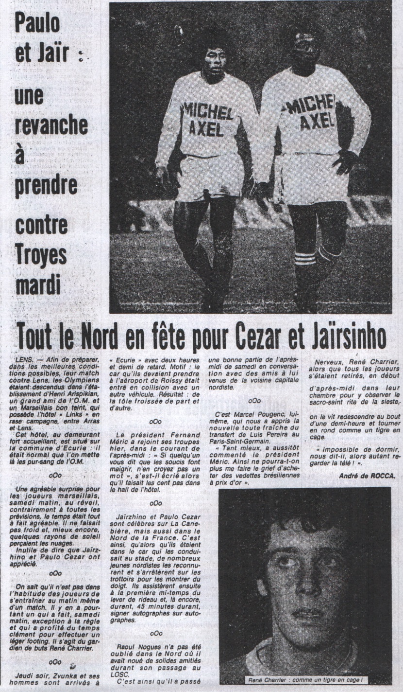 Sur le tumultueux chemin menant aux vestiaires, une surprise nous attendait : juchés sur un podium improvisé, un groupe de Noirs, dont nous ne saurons jamais s'ils étaient natifs de Rio ou de la Porte de Pantin, mais remarquables musiciens en tout cas, donnaient une aubade. À l'adresse de Paulo César et de Jairzinho sans doute. À l'intérieur, les sentiments différaient d'un interlocuteur à l'autre. Certains s'estimaient satisfaits de ce nouveau point pris à l'extérieur, tandis que d'autres n'avaient pas "digéré" de s'être faits ainsi deux fois remonter à la marque. Jules Zvunka était de cela : "On va peut-être dire que je suis difficile puisque, après un nul à Bastia et deux victoires chez nous, nous ramenons un nouveau point de l'extérieur. Mais j'estime que se faire remonter ainsi deux fois à la marque, et presque inadmissible. À 2 à 1, il fallait faire courir la balle : c'est un procédé qui permet tout à la fois de se reposer, de contrôler le match et de se créer des espaces. "Nous avons perdu beaucoup trop souvent le ballon sur des actions individuelles. Et après c'est chaque fois la même chose : il faut courir pour l'arrêt le récupérer. J'estime que nous sommes passés à côté d'une excellente affaire, car les Lensois étaient à notre portée. On aura beau me dire que nous n'avons plus qu'à prendre le bonus, mardi devant Troyes, nous n'en auront pas moins toujours, dans mon esprit, perdu un nouveau point". Jairzinho était bien près de partager l'avis de son entraîneur. Bien que ne possédant pas encore très bien notre langue le Brésilien a su nous faire comprendre que lui et ses équipiers avaient perdu, à son goût, beaucoup trop de ballons : "Surtout lorsque nous menions 2 à 1, a-t-il précisé. Avec un peu plus de mobilité, nous aurions assuré le résultat". |