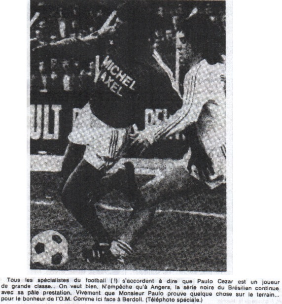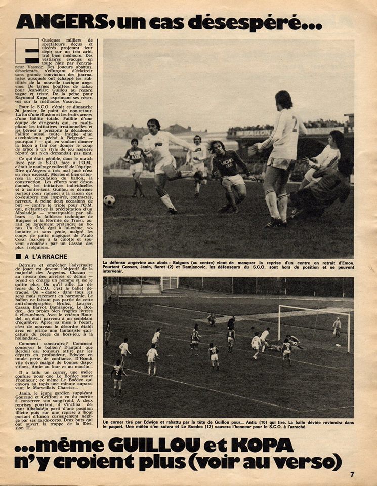 "René pouvait à peine bouger nous confiait-t-il, et cela explique notre fin de match pénible et incertaine. Bon nombre d'erreurs n'auraient pas été commises si notre gardien avait été valide et il est probable que nous aurions évité le but angevin. "Enfin sa blessure a remit nos adversaires en confiance et comme Angers a tout de même conservé des ressources techniques certaines, cela explique beaucoup de choses." Enfin Jacky Lemée, pour son retour à Angers, était particulièrement heureux et excusait volontiers tout le monde. Pour "Bouboule" tout le monde il était beau, tout le monde il était gentil. C'est toujours comme cela quand on gagne ! CHARRIER COUP VIOLENT À LA CUISSE A la 74e minute, Roger Le Boedec, en voulant lober Charrier, le heurta violemment à la cuisse. Le gardien marseillais, après une interruption de jeu, conserva sa place, mais joua le dernier quart d'heure sur une jambe.. Il souffre de l'écrasement du muscle de la cuisse droite et nous avoua avoir souffert le martyre. Ajoutons que Jules Zvunka n'envisagea jamais de le remplacer et que Roger Le Boedec son adversaire malheureux, après la rencontre vint s'excuser et prendre de ses nouvelles. René Charrier est tout à fait douteux pour le match de dimanche prochain contre Nantes. KOPA : "CEZAR, C'EST LA GRANDE CLASSE !" Raymond Kopa assistait à la rencontre depuis la tribune de presse et nous gratifia, comme il aime toujours autant le football, d'un véritable reportage. Pour lui, le malheur s'abat sur le pauvre monde, tout comme, paraît-il, l'argent va à l'argent. "Auparavant, le S.C.O. Angers était le type même de l'équipe opérant sans complexe et presque à la fleur au fusil. Maintenant, elle joue la peur au ventre et le résultat est que plus rien ne lui réussit. Aujourd'hui, sur une pelouse indigne de ce nom, nous avons assisté à un véritable match de rugby, dont le seul résultat logique aurait du être un nul, puisqu'il était nul." Que pensez-vous de Paulo Cezar ?" C'est la super classe. Un homme qui sait apparemment tout faire et dont le registre est extrêmement complet. J'ai surtout admiré ses accélérations foudroyantes. Il est seulement dommage qu'il ne joue pas particulièrement pour l'équipe et qu'il soit aussi économe de ses efforts. Quand un homme possède autant de possibilités, il n'a pas le droit de laisser les connaisseurs sur leur faim." "O qu'en termes galants, ces choses-là sont dites ! Louis DUPIC |